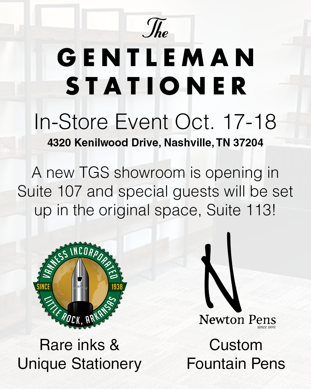It’s taken me about a year to get here, but a primary reason I wanted to open a store was so that I could host events like the current weekend pop-up with Vanness Pens and Newton Pens! While we have moved the main T.G.S. Shop to Suite 107 on the front of the building, making it easier to find, Suite 113 (the “old” store) will be opened for special events like this weekend, and will also continue to serve as our office, warehouse, and fulfillment location. Come see us today (Saturday) from 10-6pm!