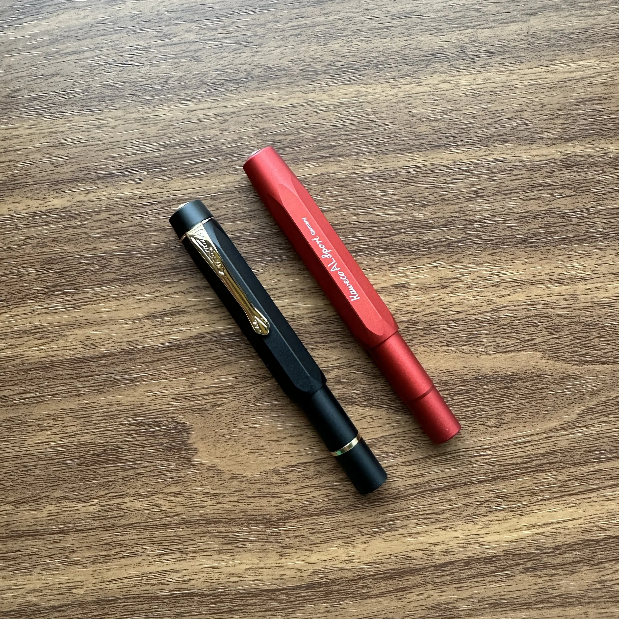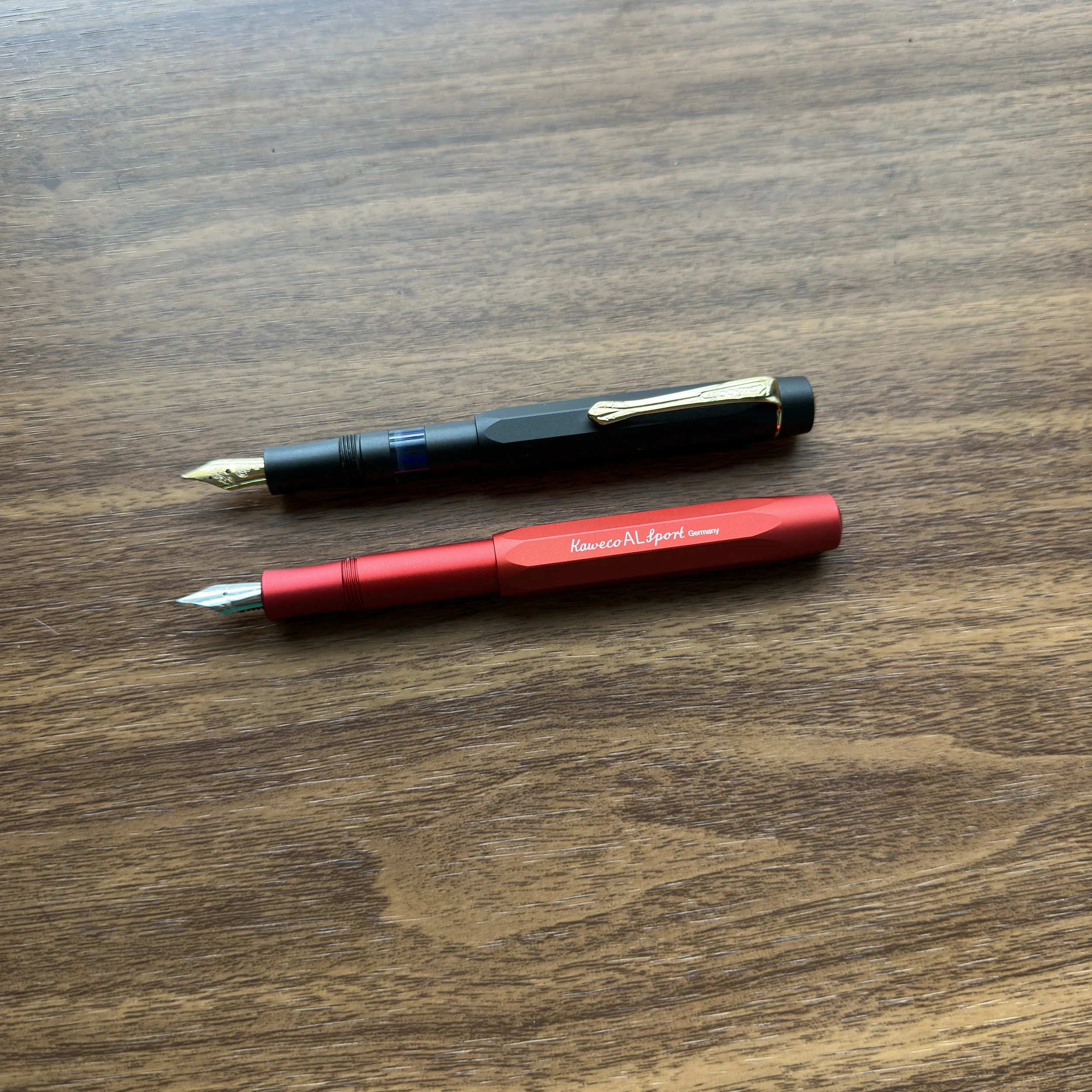 In terms of size, feel, and overall setup, you shouldn't notice much of a difference between the Sport Piston Filler and the existing AL Sport line. My red AL Sport shown below weighs 18g, and my 3/4 full Kaweco Sport Piston Filler weighs 24g. While the piston adds some weight, given the Sport's small size, I don't really notice it.
