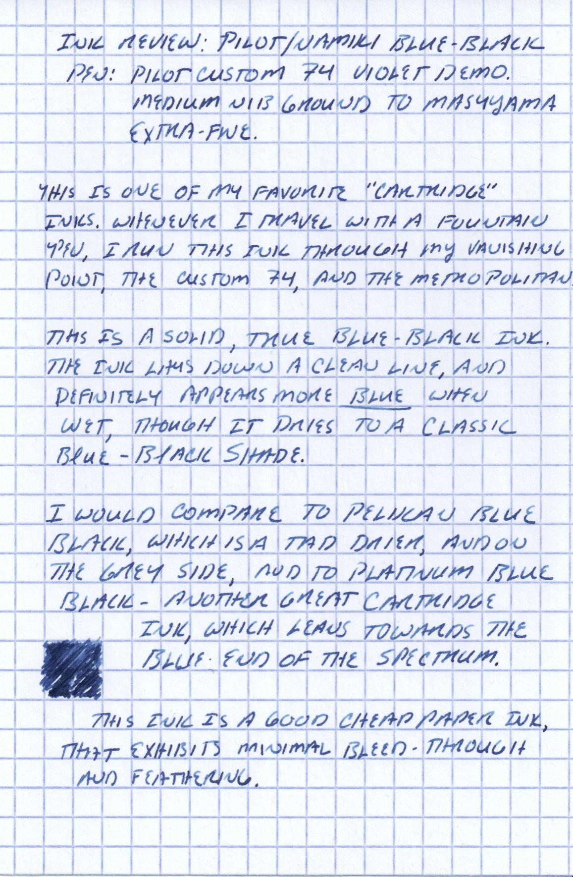 Pilot-Namiki Blue-Black is a good workhorse ink: it's not flashy, but it's reliable in the sense that it works on most types of paper and has a nice, classic blue-black tone that's appropriate for school, business and most other daily uses. I have this ink in cartridge form (I picked up a package of 10 carts at Kinokuniya during my last visit to New York City), and it finds itself in regular rotation through my Vanishing Point and my Custom 74. For a blue-black ink, the Pilot ink leans more to the "blue" end of the spectrum, especially when wet, although I would still consider this a "classic" blue-black. Highly recommended.