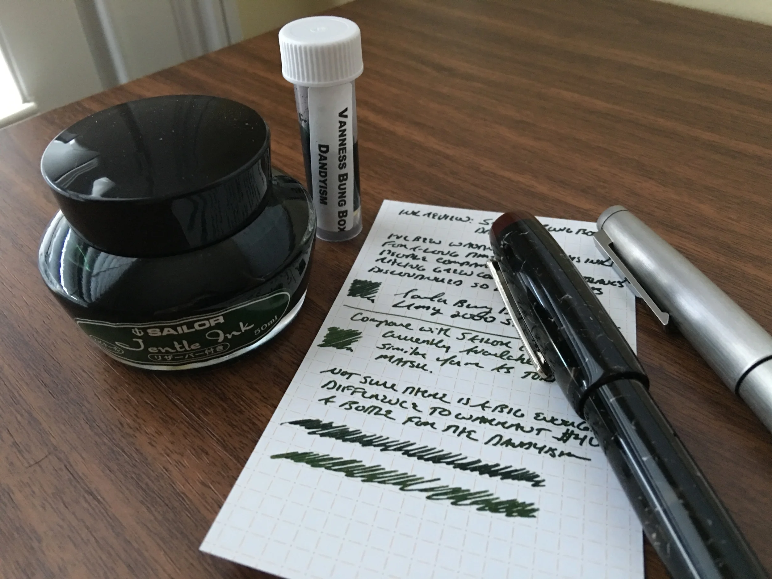 The first one I inked up was Dandyism, advertised as a green-black. Some have gone so far as to call this a substitute for Montblanc's legendary Racing Green (now discontinued, as all great Montblanc inks eventually are for inexplicable reasons). I won't belabor this review: Dandyism is a great ink but I'm not sure it's worth the money. It's slightly darker than Sailor Epinard or Sailor Tokiwa-Matsu. Tokiwa Matsu (essentially the current version of Epinard) costs more than $20 less per bottle, which to me is too great of a price difference to justify purchasing the Dandyism at $40 a pop. (Note: these pictures make the color difference look somewhat greater than it is IRL. The Dandyism is captured fairly accurately here, but the Epinard appears lighter in the picture than it does to the naked eye.)