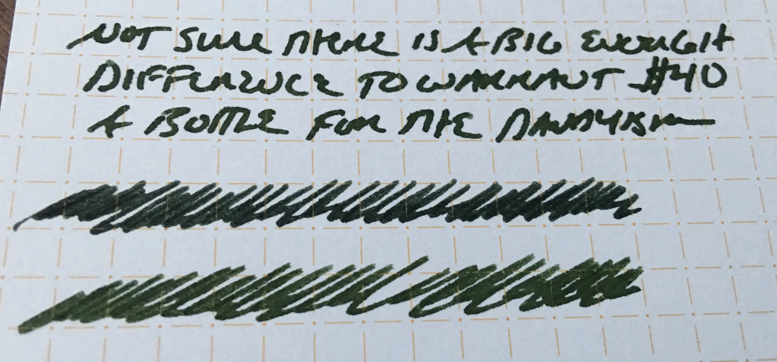 Dandyism (top) vs. Epinard/Tokiwa Matsu (bottom). I know some people are going to say that these are completely different colors, but they're close enough to keep me from paying $40 for a bottle of Bung Box, especially where you could darken up the Epinard with a drop of black ink.
