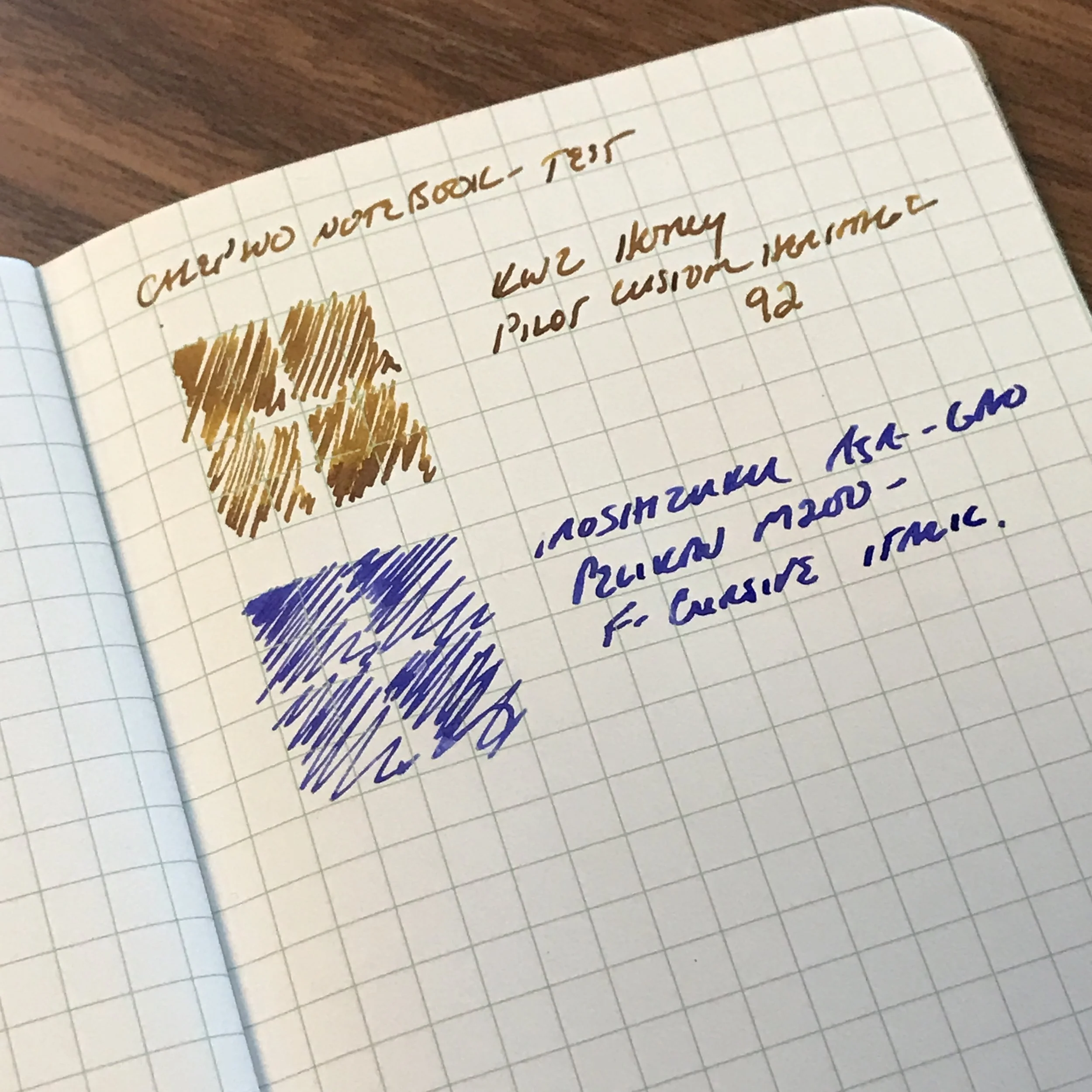 A writing sample on the Calepino notebook paper with two fairly wet fountain pens: a Pilot Custom Heritage 92 with a FM nib and a Pelikan M205 with a wet fine cursive italic. Note the lack of feathering.