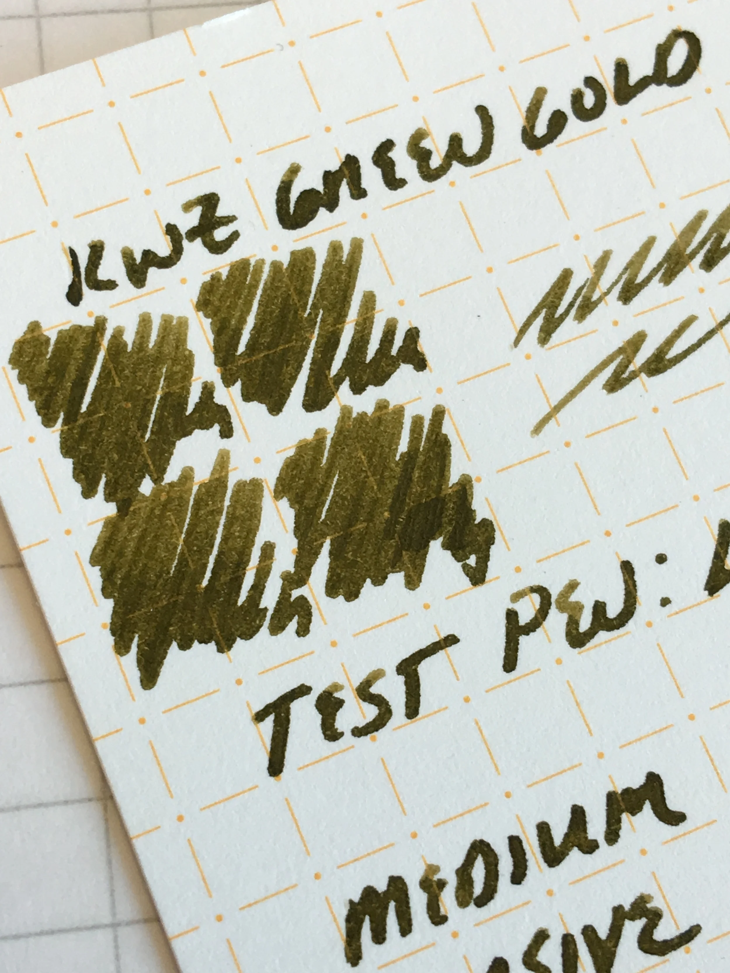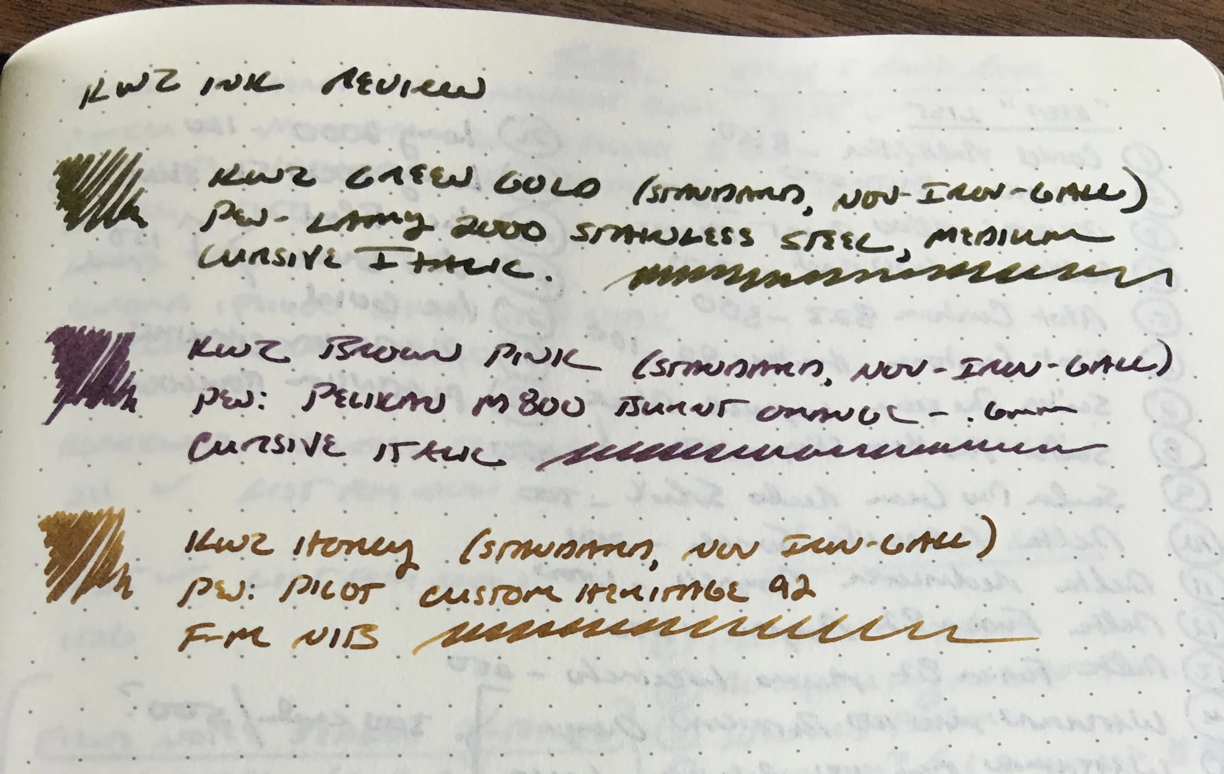Personally, I'm enamored with KWZ's standard line of inks (i.e., the non-iron gall variety). I purchased my first bottle (Green Gold) at the 2016 Atlanta Pen Show, and soon after placed an order for two other inks that caught my eye: Brown-Pink (yes, that's a real color) and Honey (it looks exactly as you'd expect Honey-colored ink to look).