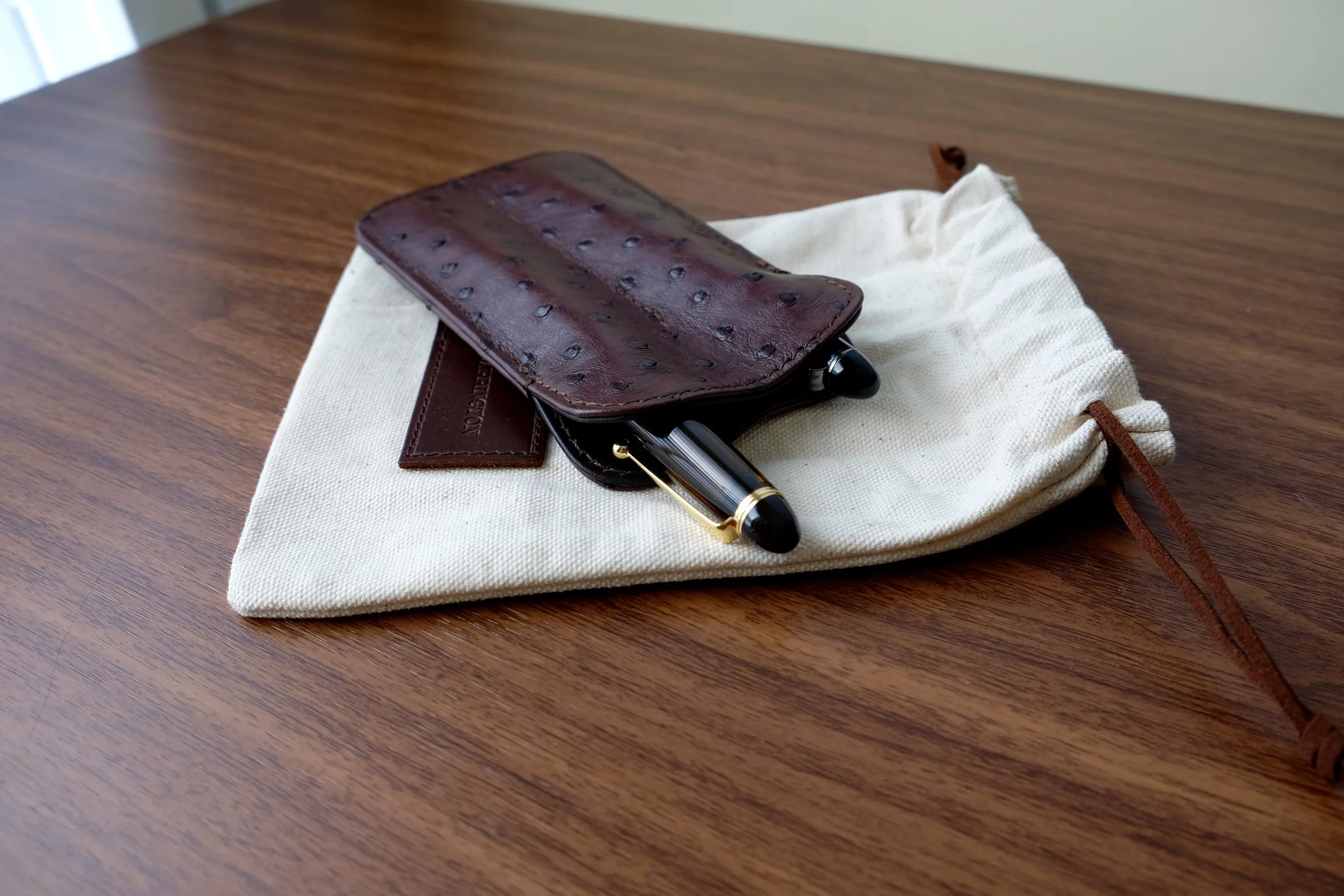 Tom Barrington Leather, based in California, makes a wide variety of leather goods and accessories, including pen cases, pen sleeves, wallets, and glasses cases. They were kind enough to send over one of their two-pen sleeves in brown ostrich, and it's one of the nicer leather pen sleeves that I've had the opportunity to review.