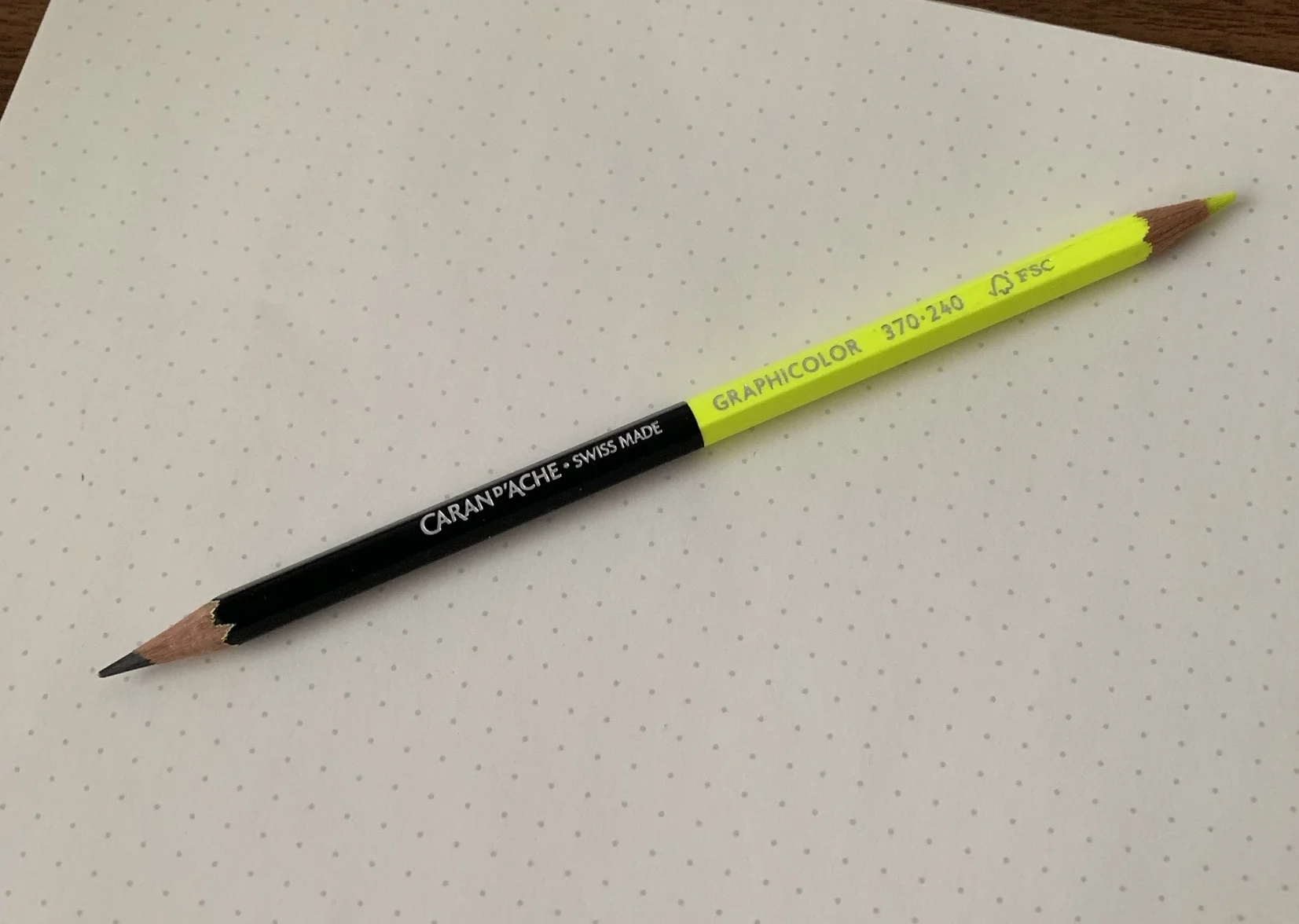 The Caran d’Ache Graphicolor Highlighter/HB Combo, which combines a highlighter/dryliner pencil with a standard HB graphite half, to make notes while you highlight without switching writing implements. It’s great for when you’re reading!