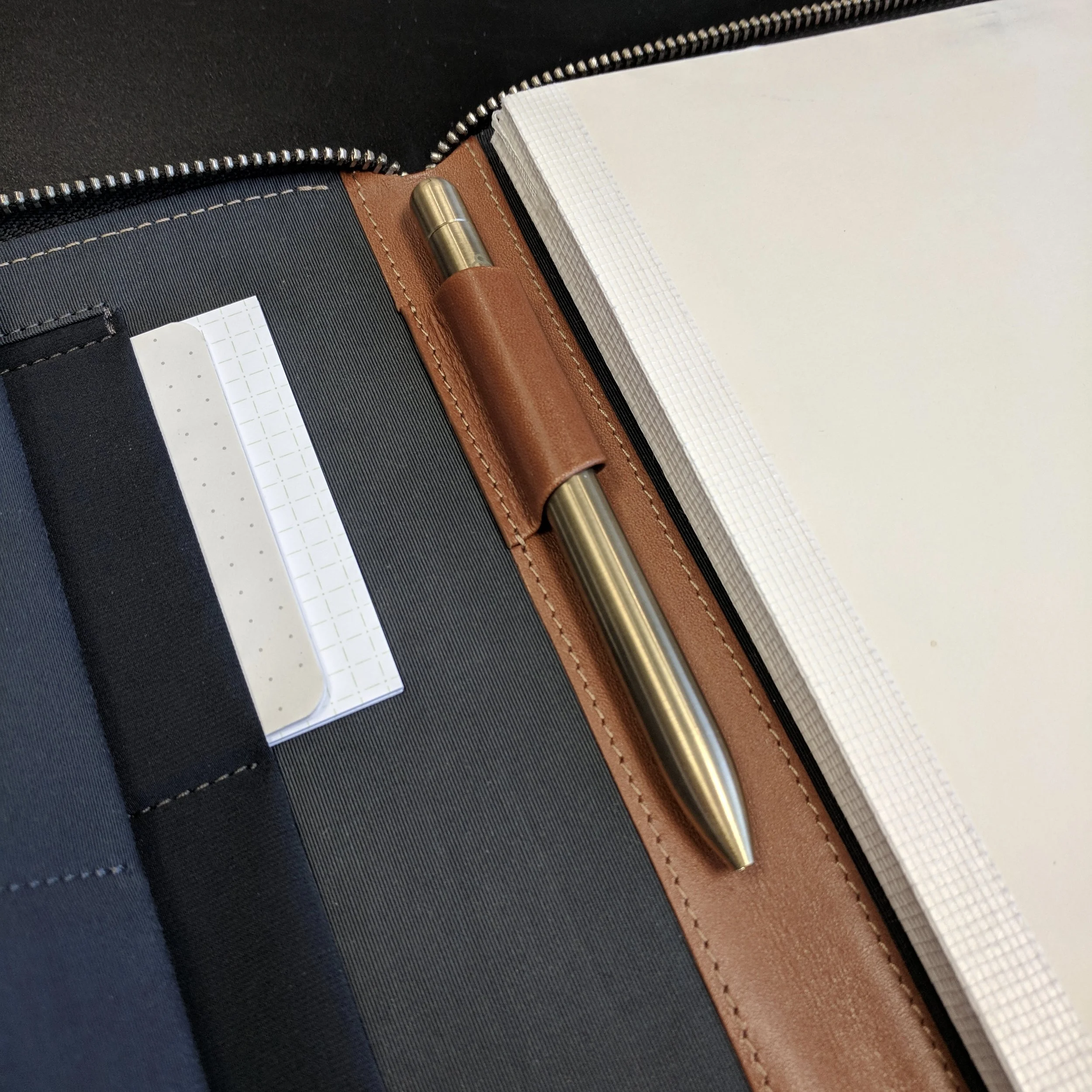 Due to the lack of a clip on the Baron Fig Squire (Brass "Key" version shown here), this may not be the most "practical" pairing I can think of but I like the combination of the patina on the brass and the leather portfolio. The pen loop is pretty slim, so don't expect that it will hold your fat fountain pens.