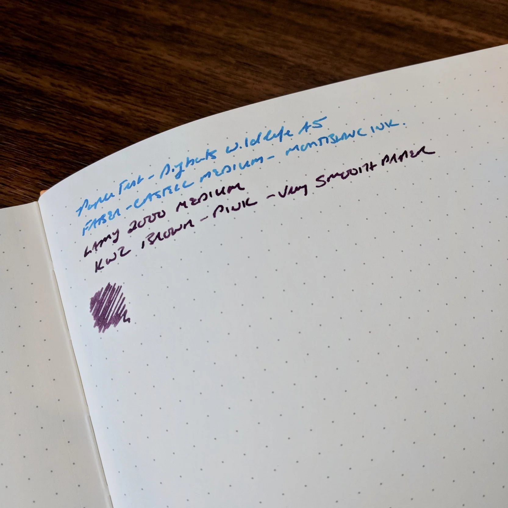 A writing sample on Dingbats* new coated paper, in cream with dot grid. No noticeable feathering or bleed whatsoever.