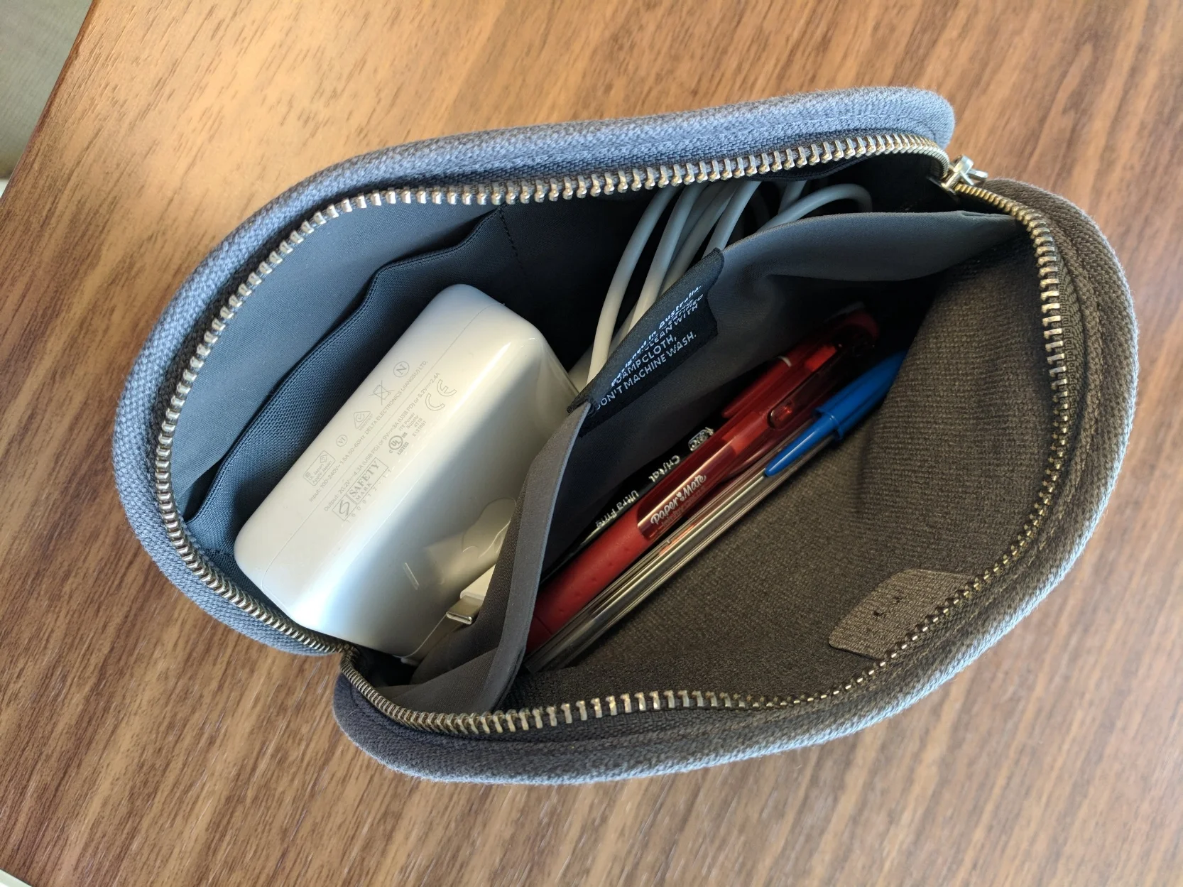 It's a Bellroy product, so of course it's well made. But what surprised me most about this pouch is the volume of "stuff" that it can hold while still maintaining a relatively compact overall size. The internal layout features one large center compartment, which I use to hold a laptop and iPhone/iPad charger and cables. Note: I have two non day-job laptops, a 15-inch MacBook Pro and a Google Pixelbook. The chargers for both of these computers easily fit inside the Bellroy pouch, but it won't hold larger "brick"-type chargers (like those on the Dell workstations at my office).