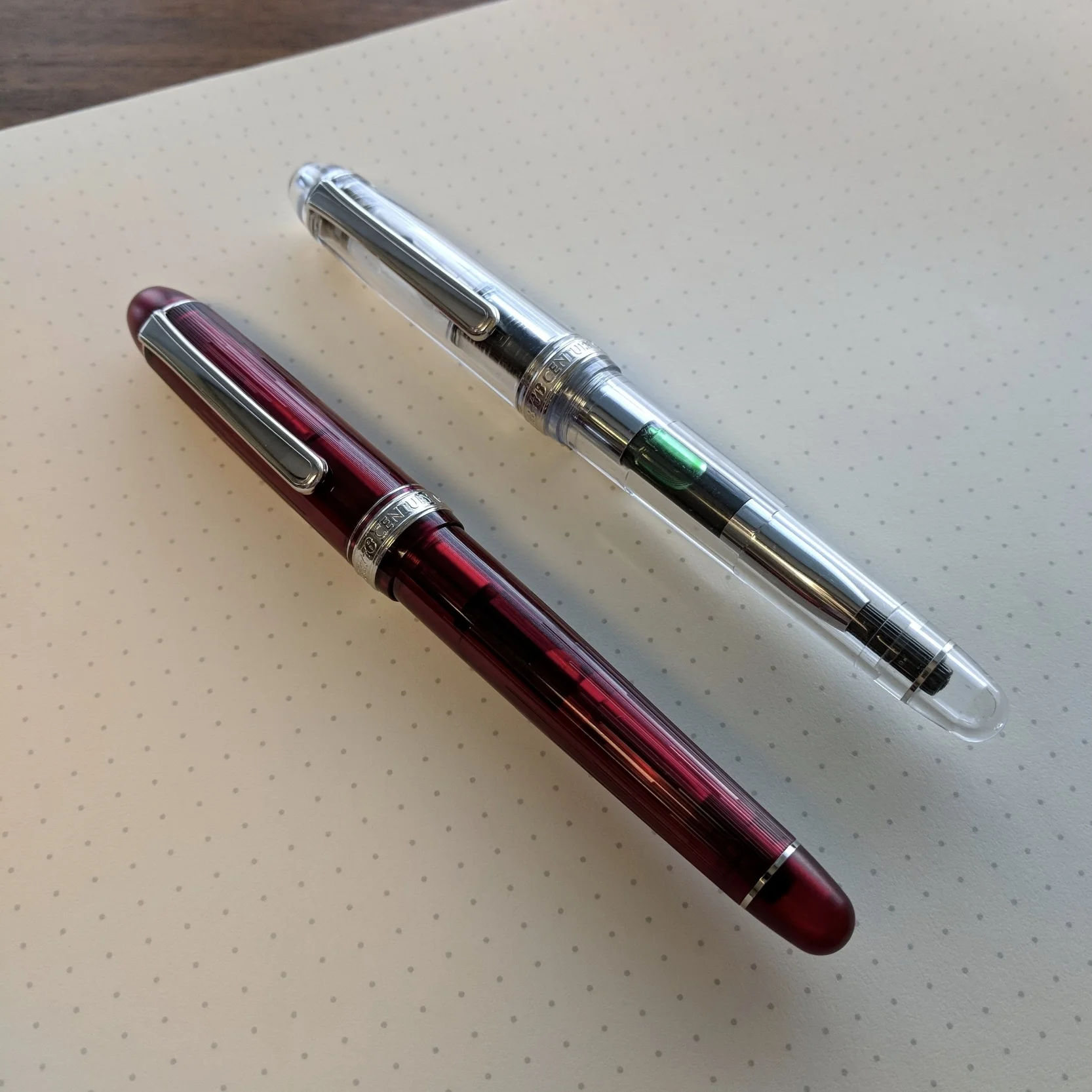 The Shungyo limited edition in my favorite color (red!) on the left, and the crystal clear Oshino demonstrator on the right.