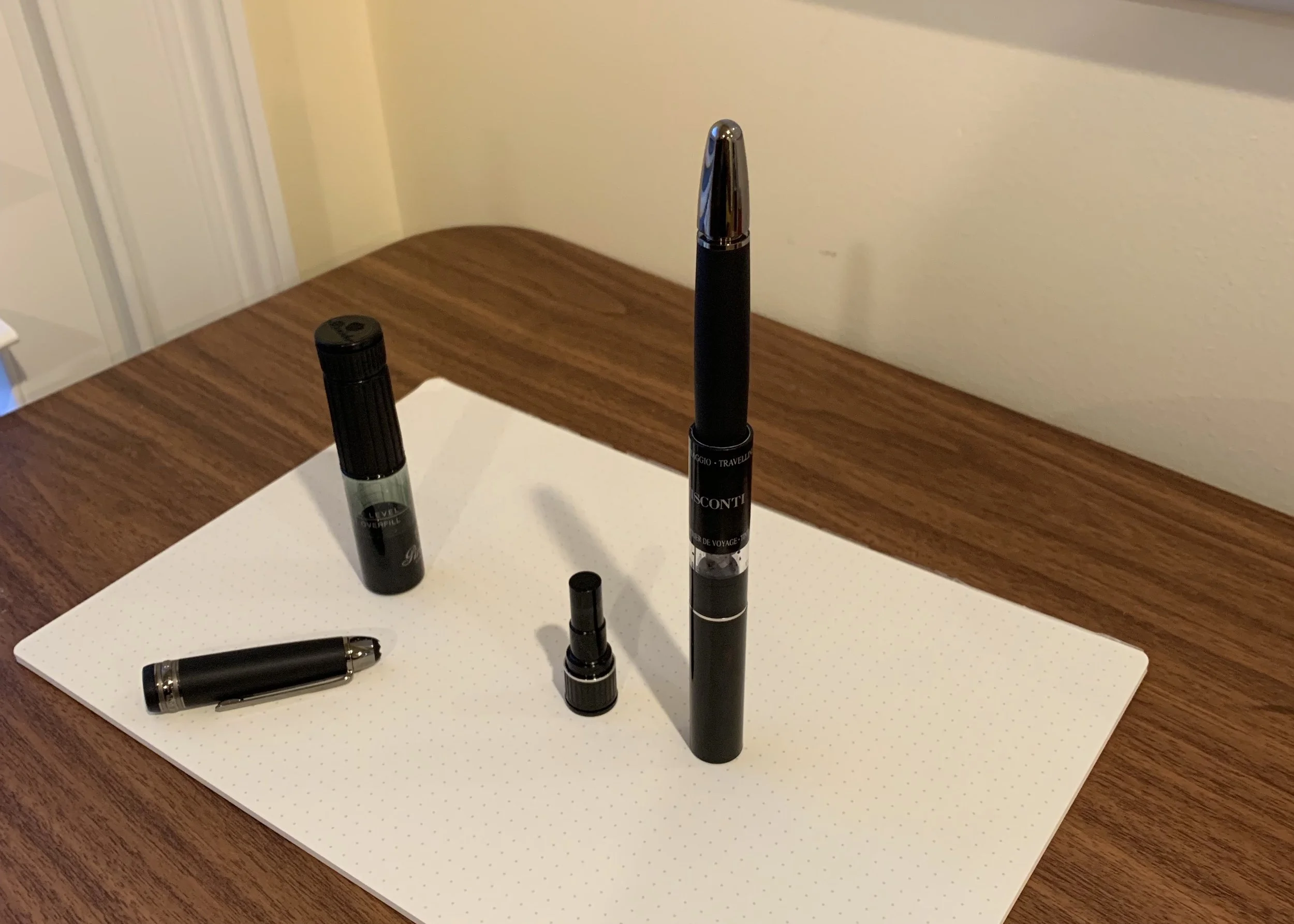 I like both of these products, but perhaps not for their stated purpose of traveling. Rather, for me their true utility lies in the ability to swap favorite inks (mostly Sailors) from the hard-to-fill “flat” bottles into a different format that will let you use piston-fill pens with larger nibs, such as No. 8s. They’re also a great way to make sure your pens are filled to the brim if you’re preparing to leave on a trip or attend a class/meeting where you will have to do a lot of writing.