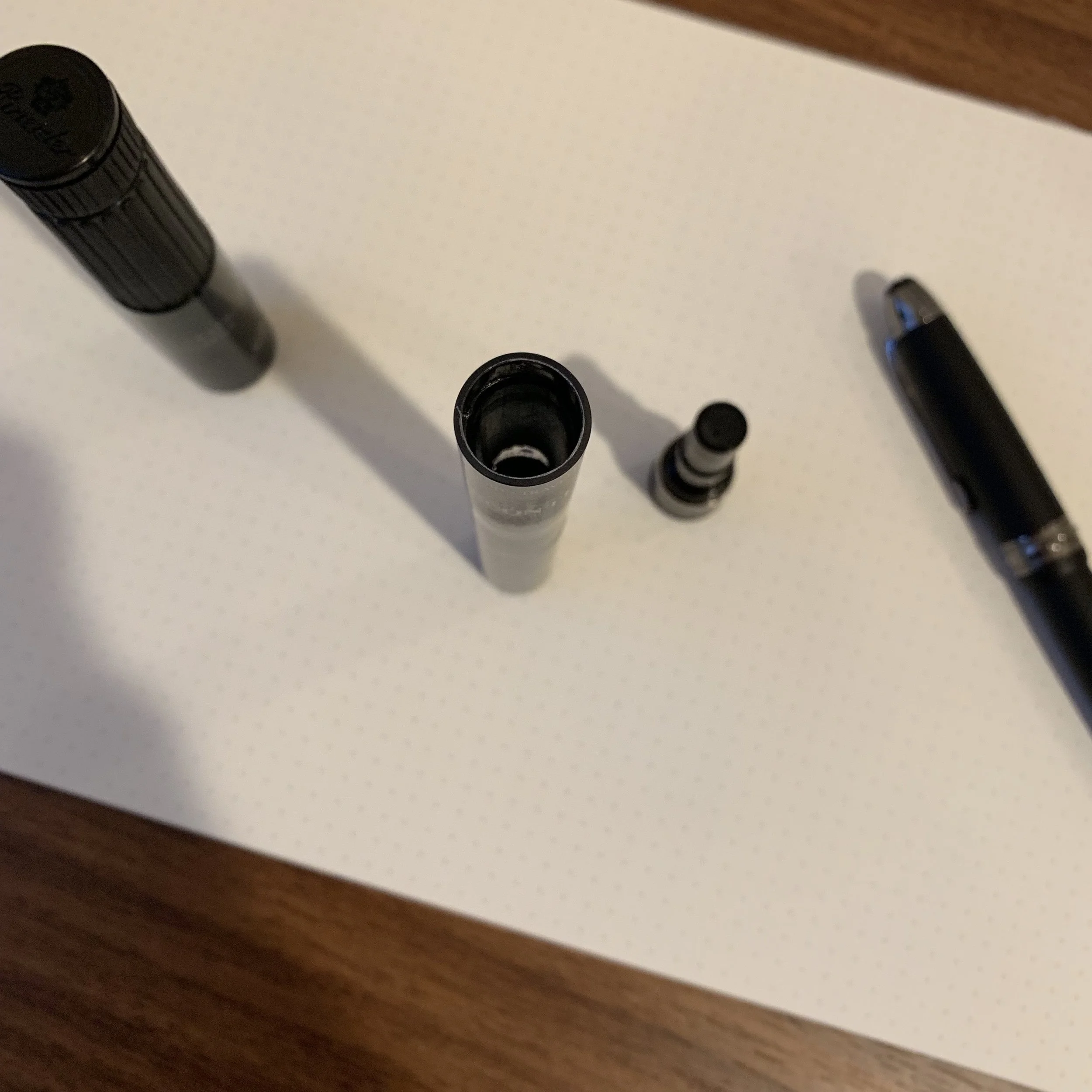 When you’re ready to fill, Insert the pen and press gently until you feel the pen come to a stop. The section should form a secure seal against the rubber gasket inside the inkwell, allowing you to invert the inkwell (yes, you heard me correctly) while you turn the piston or converter. You will get a full fill of ink into most pens, which to me is the primary selling point of these contraptions. Note: for vacuum fillers, make sure your seal is TIGHT and hold onto the inkwell securely when you depress the plunger to fill the pen. Otherwise, you may get the “rocket effect” when the inkwell (and all of the ink in it) goes sailing across the room, coating your walls, carpet, etc. It may also be preferable to try outside for the first few times until you get the hang of it.