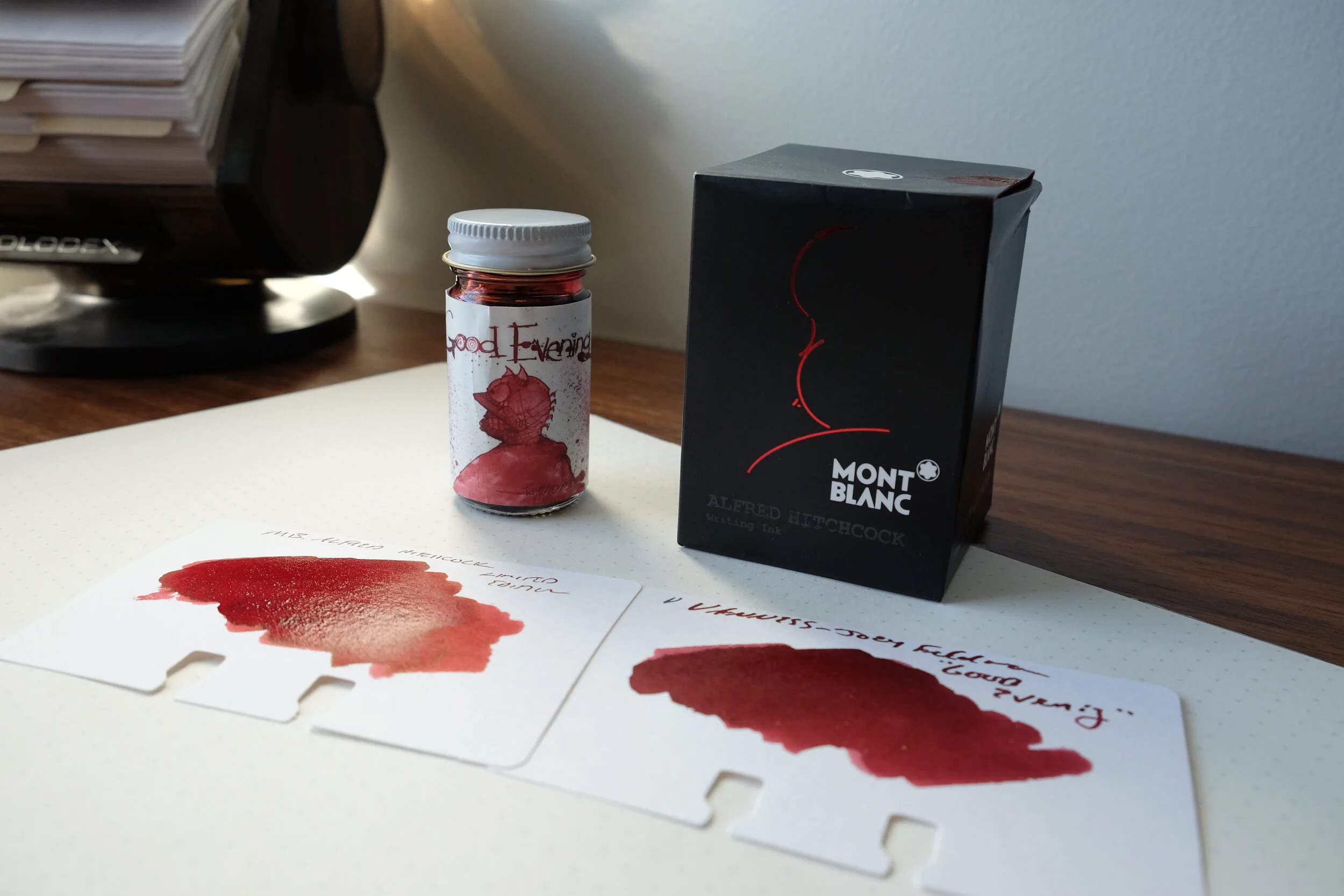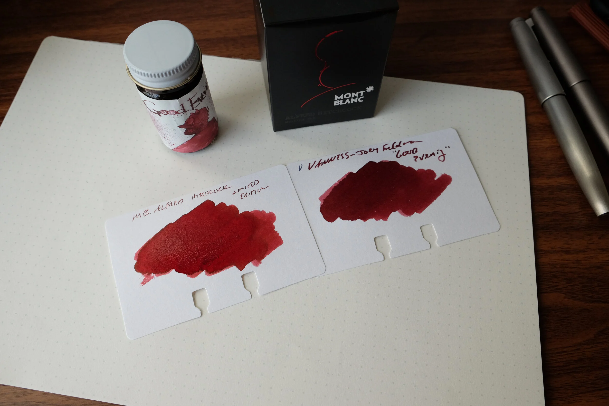 Some of the difference here is the lighting, and the fact that the Montblanc Hitchcock is still wet, but the ink on the left has a bit more red in it than the “Good Evening.” Once the inks are thoroughly dry, the match is closer, but not exact.