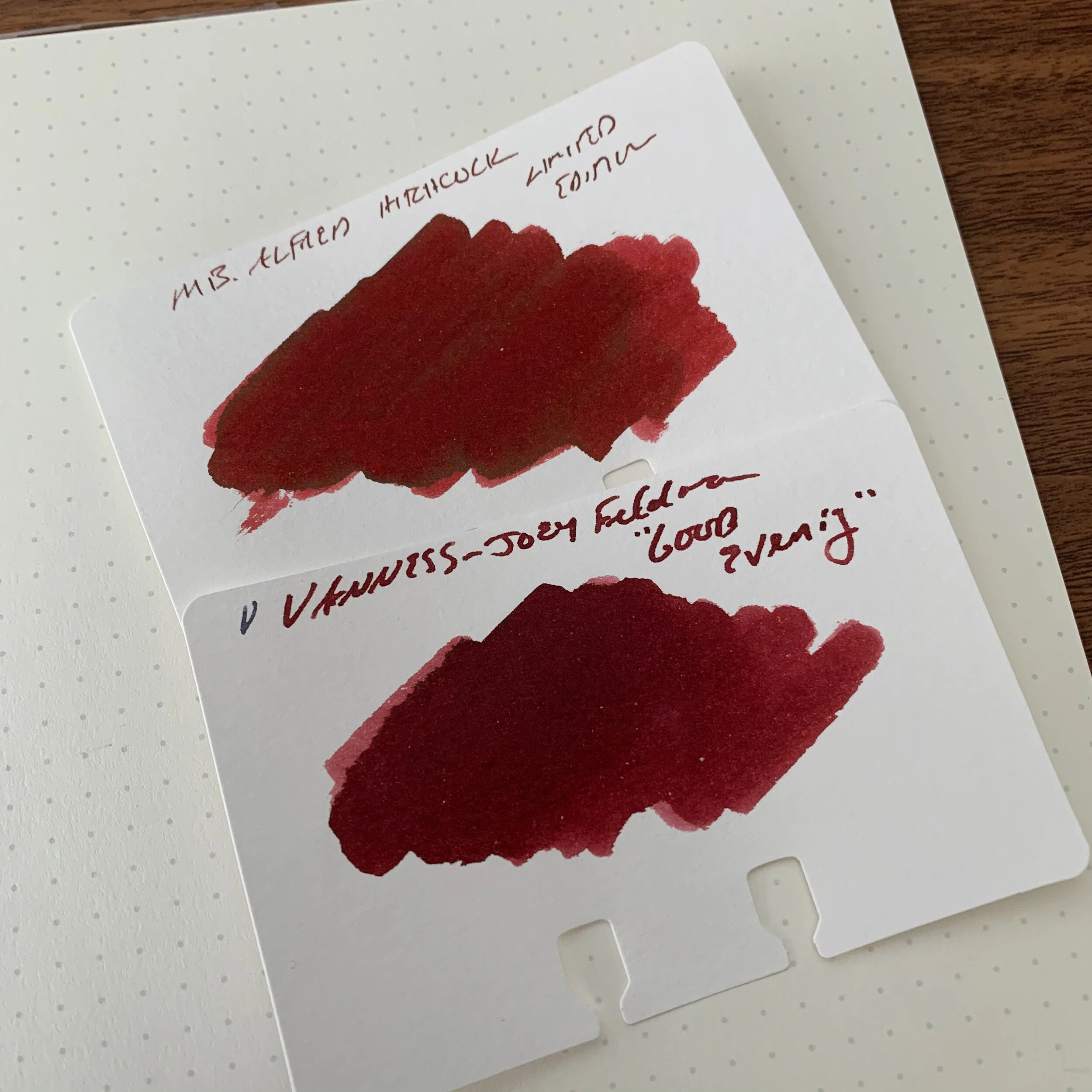 Another picture taken after the ink swatches are dry. You’ll notice that the Good Evening still has slightly more purple/blue, while the Hitchcock has more red. Hitchcock can also have a slight gold/brown sheen to it (the “dried blood” effect).