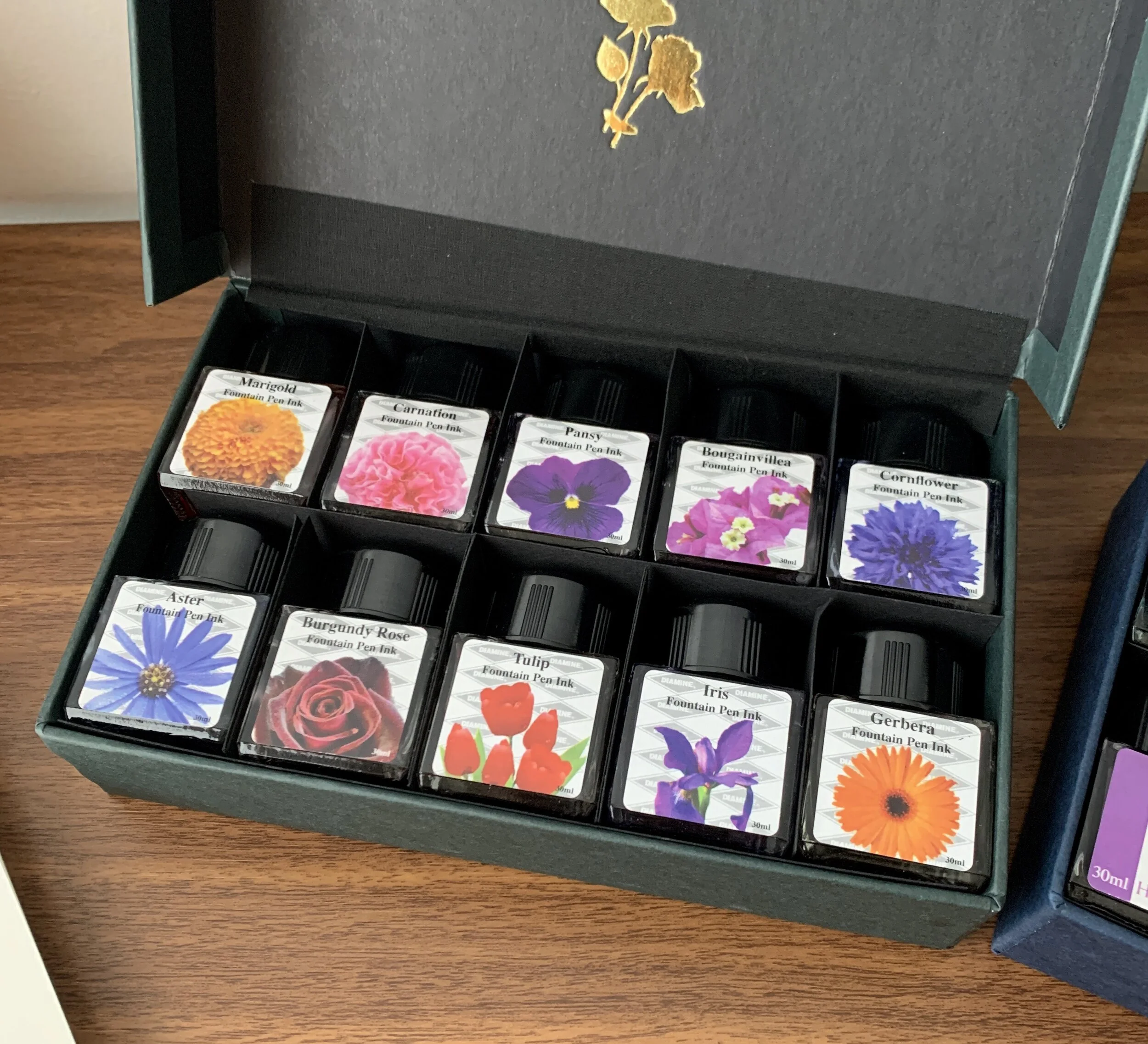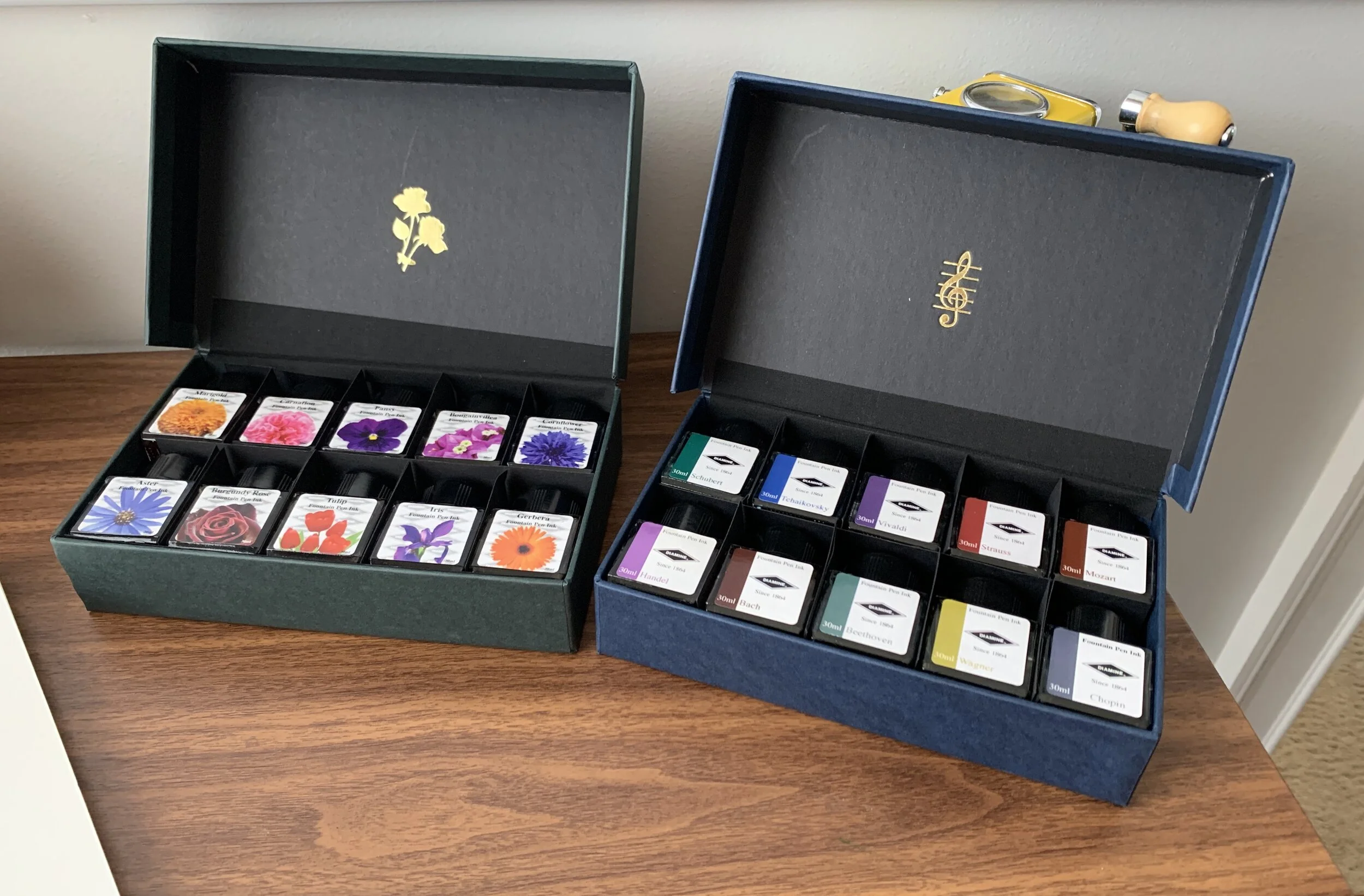 I purchased both sets pictured here from site sponsor Appelboom. The Diamine Music Ink Set and Flower Ink Set are priced at just under 50 Euros, which comes to around 5 Euros per 30ml bottle. Given that I generally like all of the colors in both sets, it worked out to a pretty good deal for me. I’ve heard anecdotally that you can purchase refills of the individual inks directly from Diamine, but I’ve been unable to find a link on their site and suspect you would need to reach out to them directly.