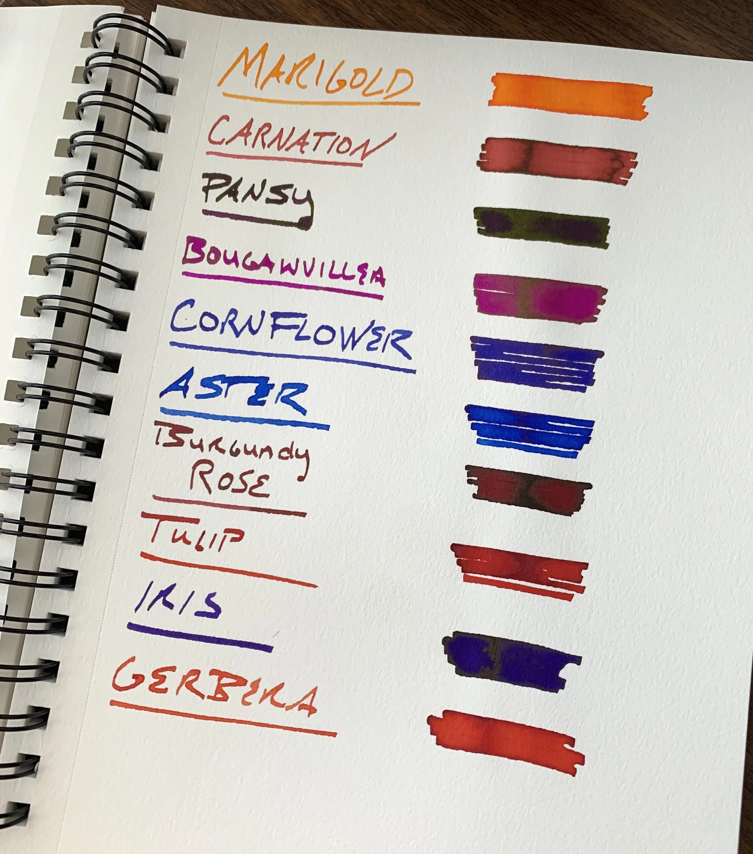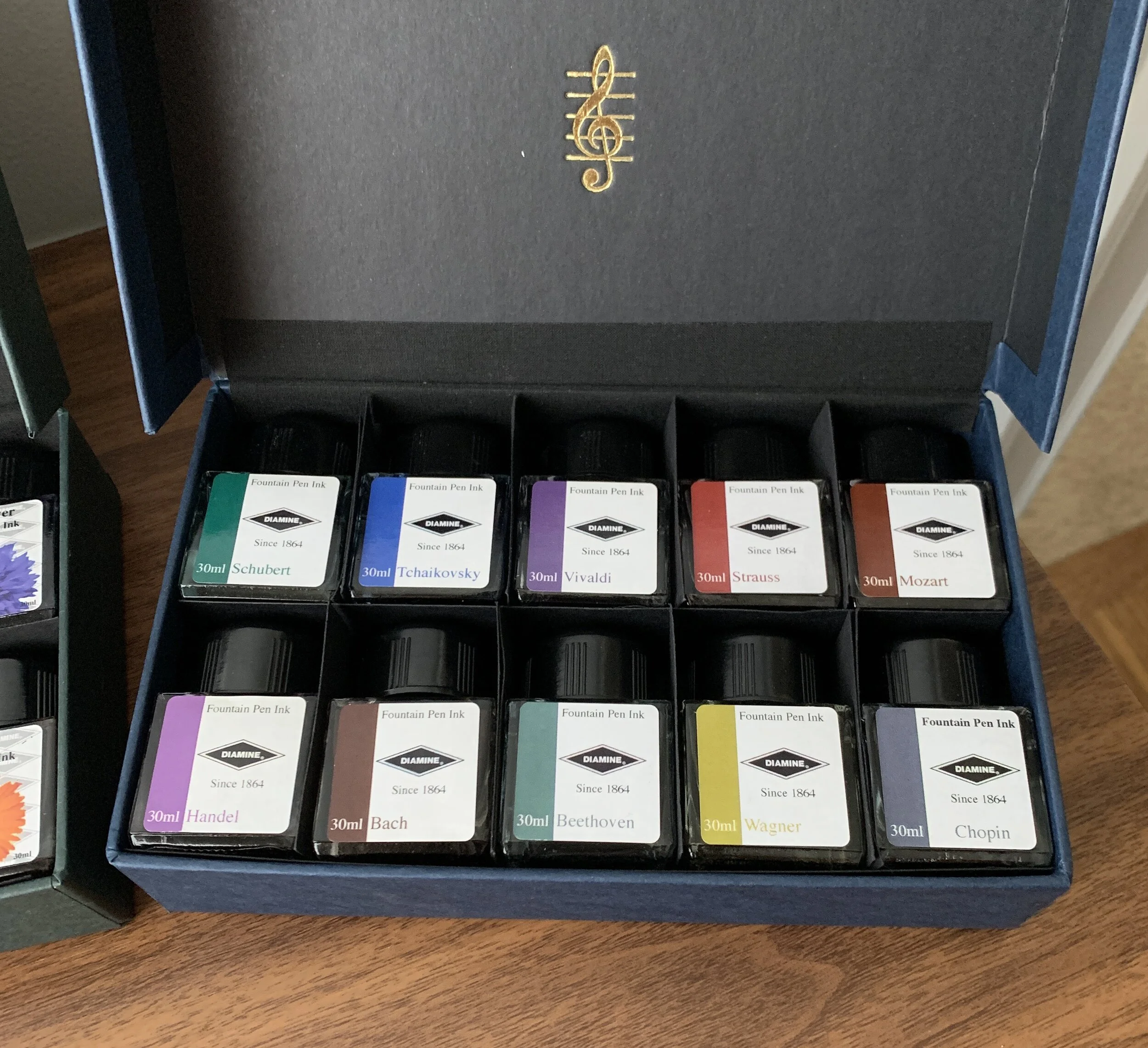 A couple of weeks ago I posted a review of “Vivaldi” and “Strauss,” two inks from Diamine’s ten-bottle Music Set. Since then, I’ve had a chance to sample and swatch the other eight Music inks, each of which is themed around a different composer, as well as the ten inks from Diamine’s other ink set, Flowers. I’m pleased with both purchases - for years I held off ordering these sets because I thought the colors would appear boring, or possibly duplicative of Diamine inks I already owned. Not so - especially Music. I think I’m going to enjoy using these darkly muted colors, especially at work and in other professional settings.