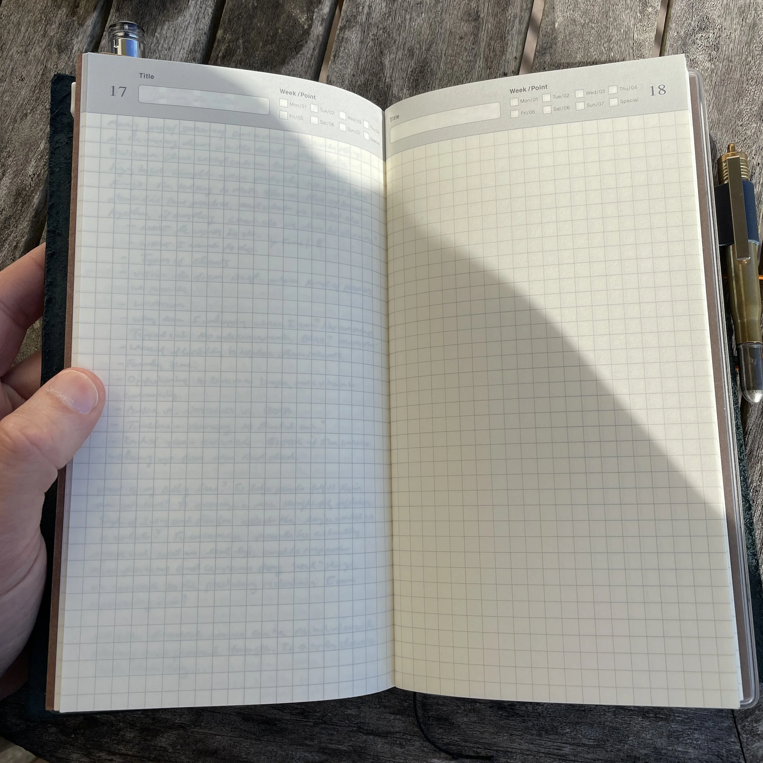 The first refill I use is the Standard size “Free Diary” (Weekly + Memo), which I use for blog planning (with notes) and logging various things I track during the week. It can also serve as a mini-journal and repository for quotes and snippets of things I’ve read during the week.