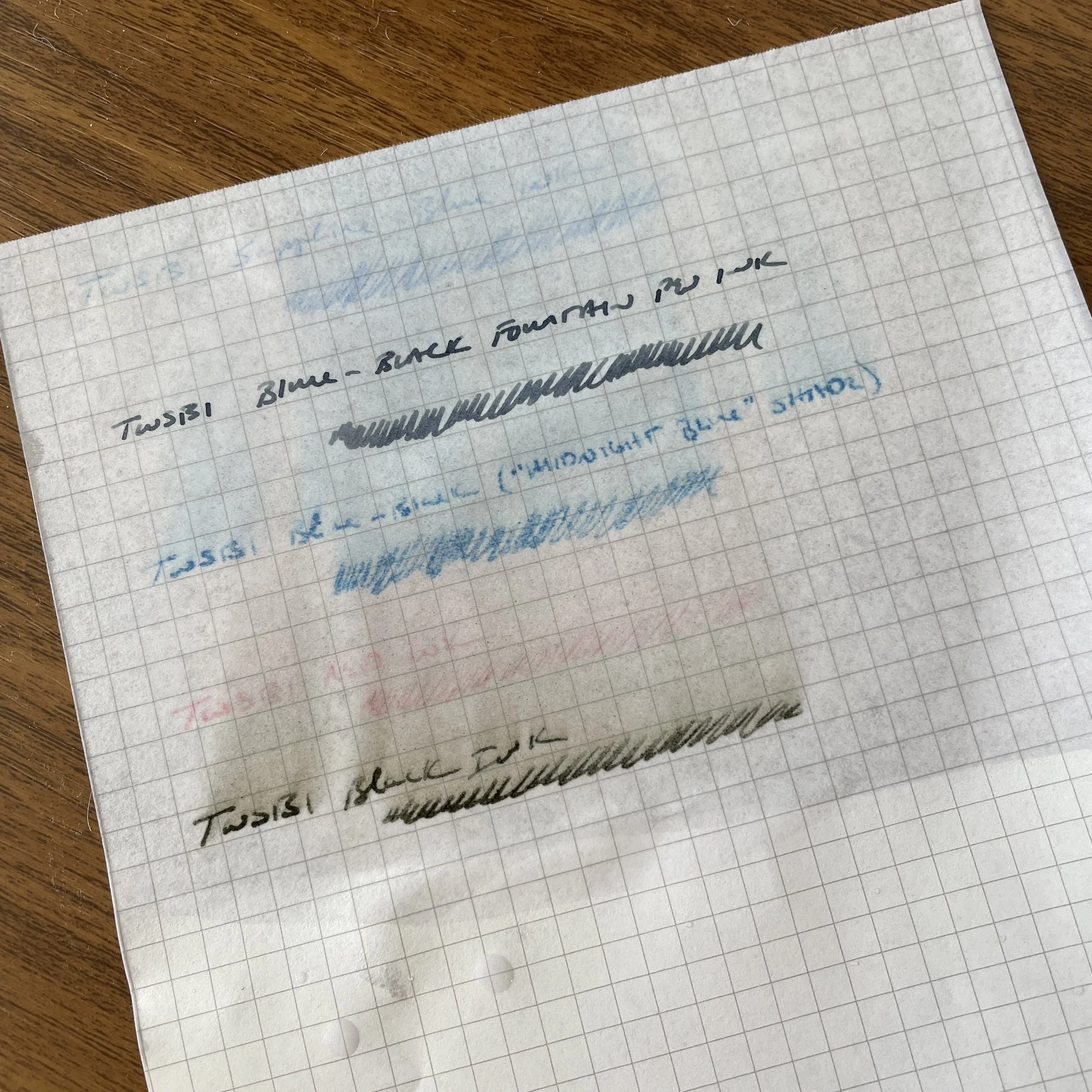 • TWSBI Black. For a standard black ink, this ink surprised me with how well it held up when soaked in a glass of water. If you’re looking for a workhorse black, why not choose one where you won’t have to worry if your notebook gets wet?