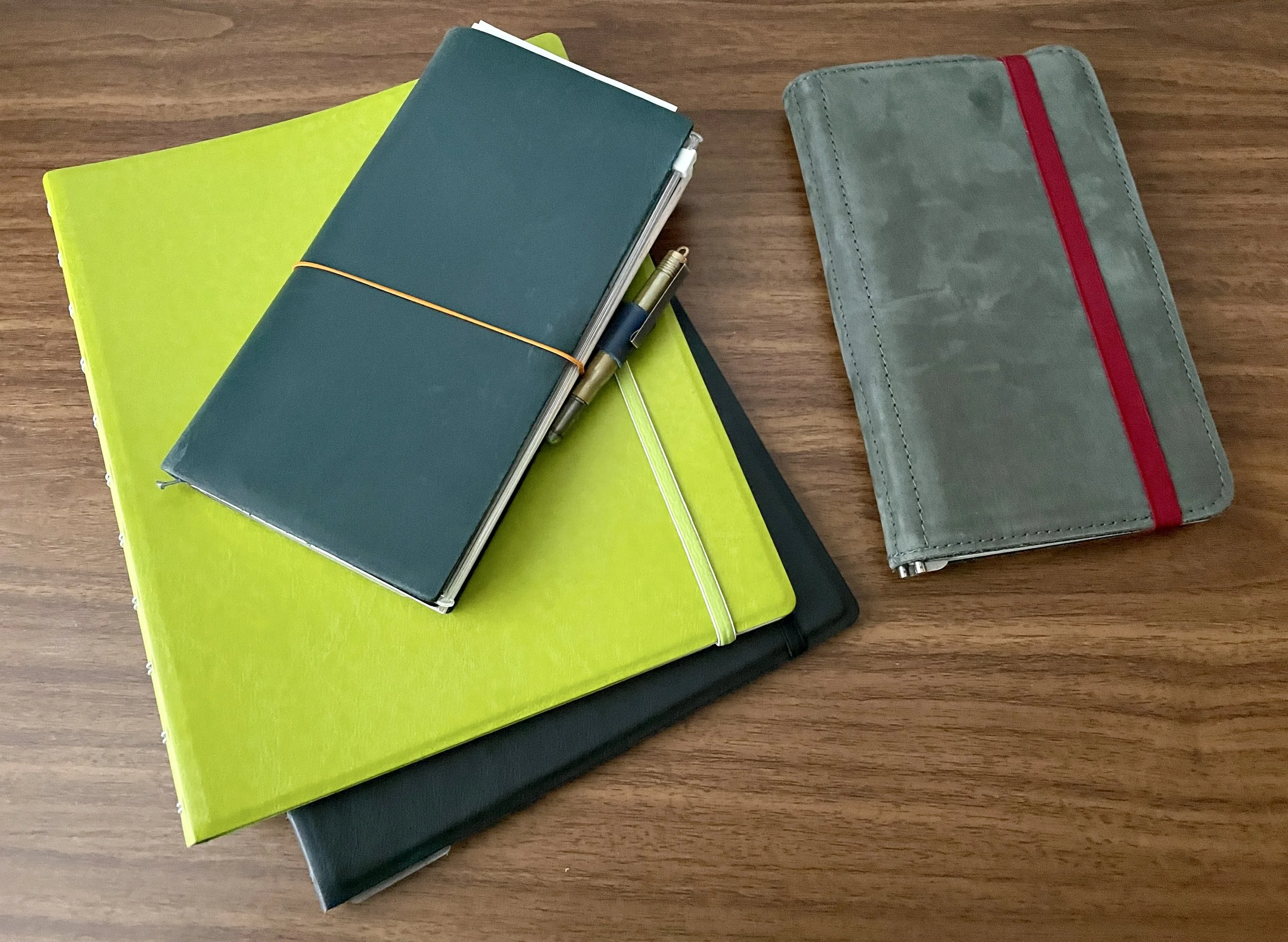 A4 (black) and Letter (green) Filofax Refillable notebooks shown with my Traveler’s Notebook (left) and Roterfaden (right).