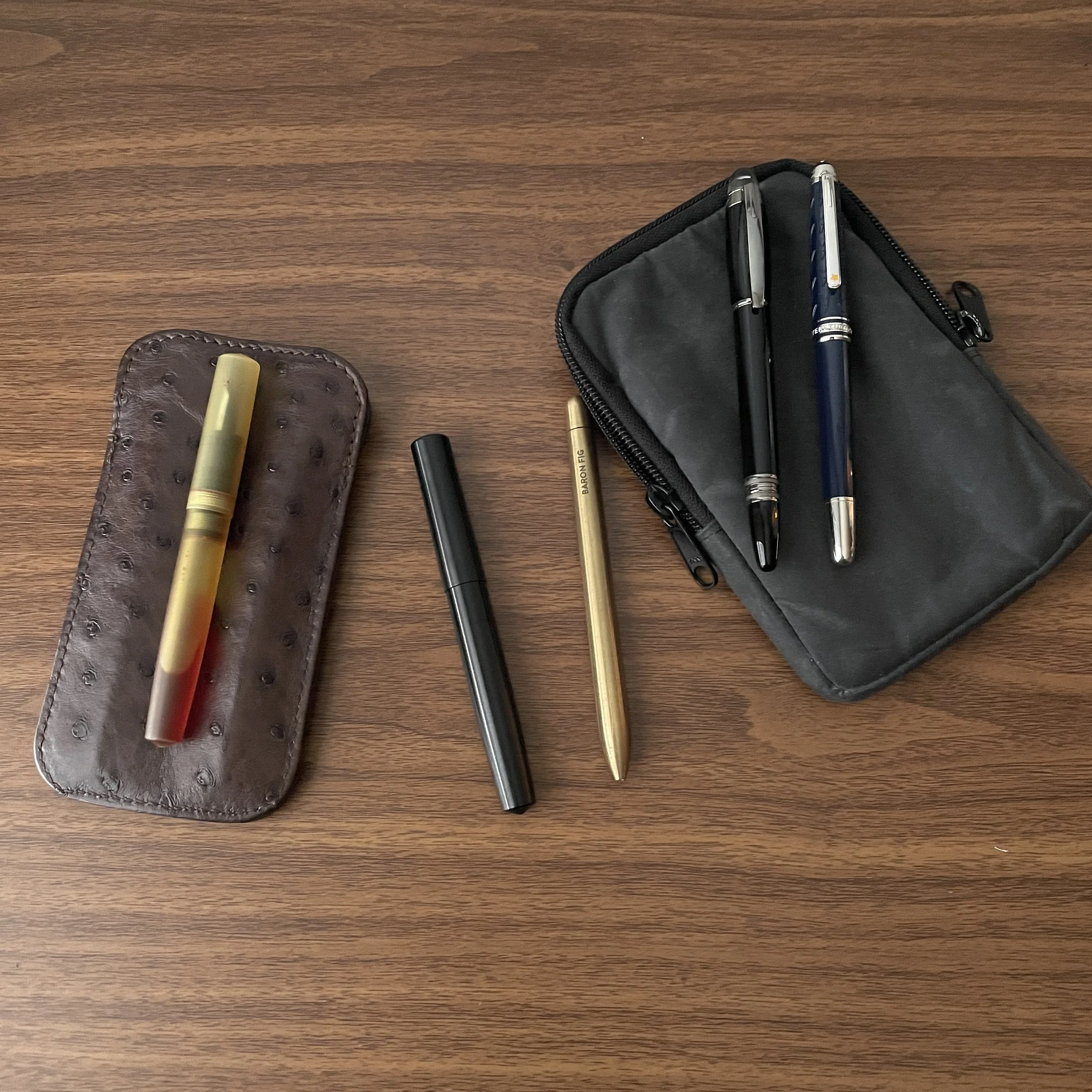 For general all-purpose writing, I carry a handful of ballpoints and rollerballs, including at least one Caran d’Ache 849 (my go-to “click pen”); my Montblanc Starwalker and Montblanc Le Petit Prince Classique rollerball; my Sunderland mk1 (of course), my Baron Fig Brass Squire, and a Traveler’s Company Brass Ballpoint (typically kept clipped to my notebook).