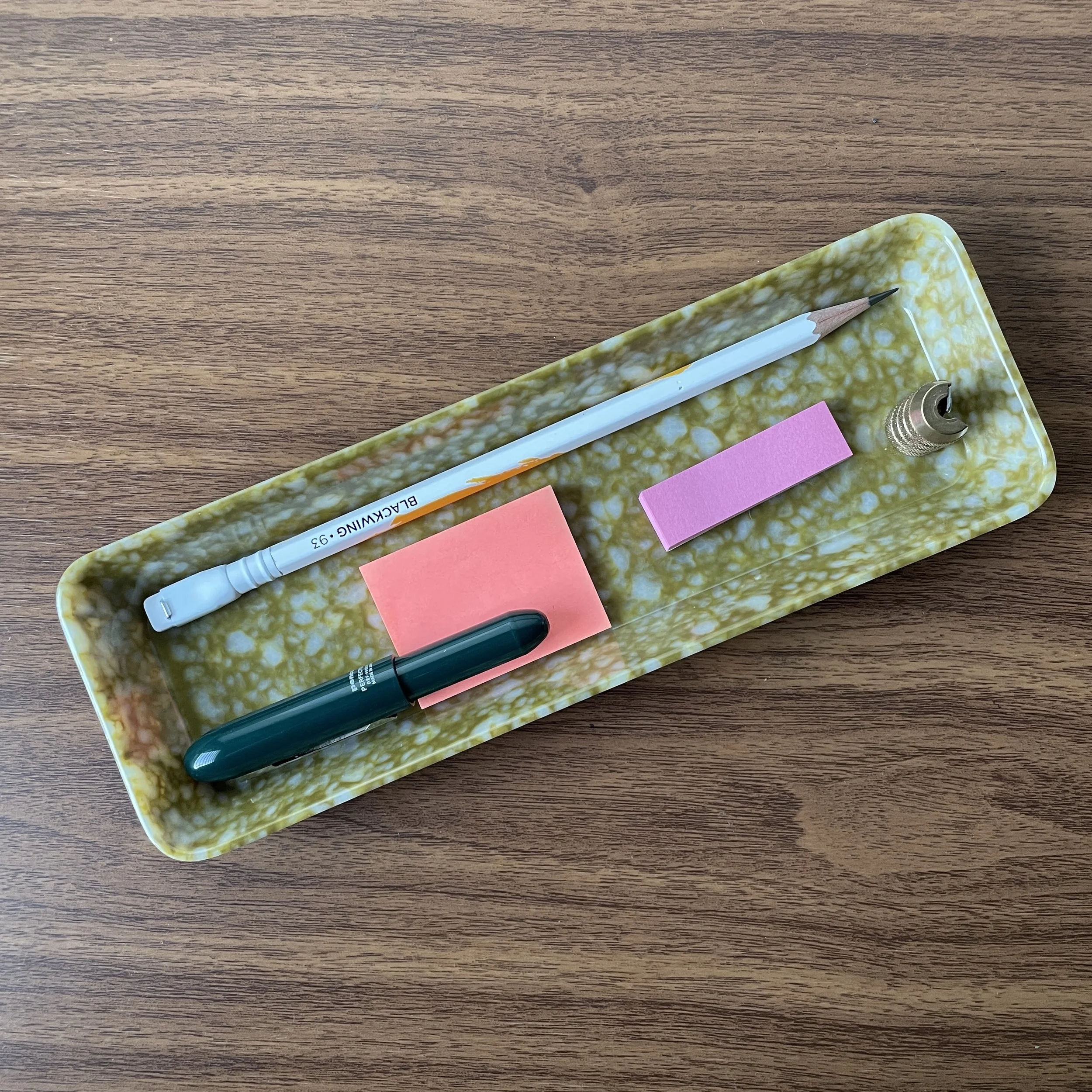 To complement our current lineup of useful desk accessories from Hightide Co. (including a fresh restock on Sandglasses in all sizes), we’ve decided to introduce these beautiful marbled melamine pen trays, which can serve as the perfect desktop catch-all for pens, pencils, sharpeners, sticky notes, paperclips, and whatever other loose items tend to accumulate in your workspace. Available now in three colors: Mustard, Grey, and Ivory, and priced at $14 in the Curated Shop!