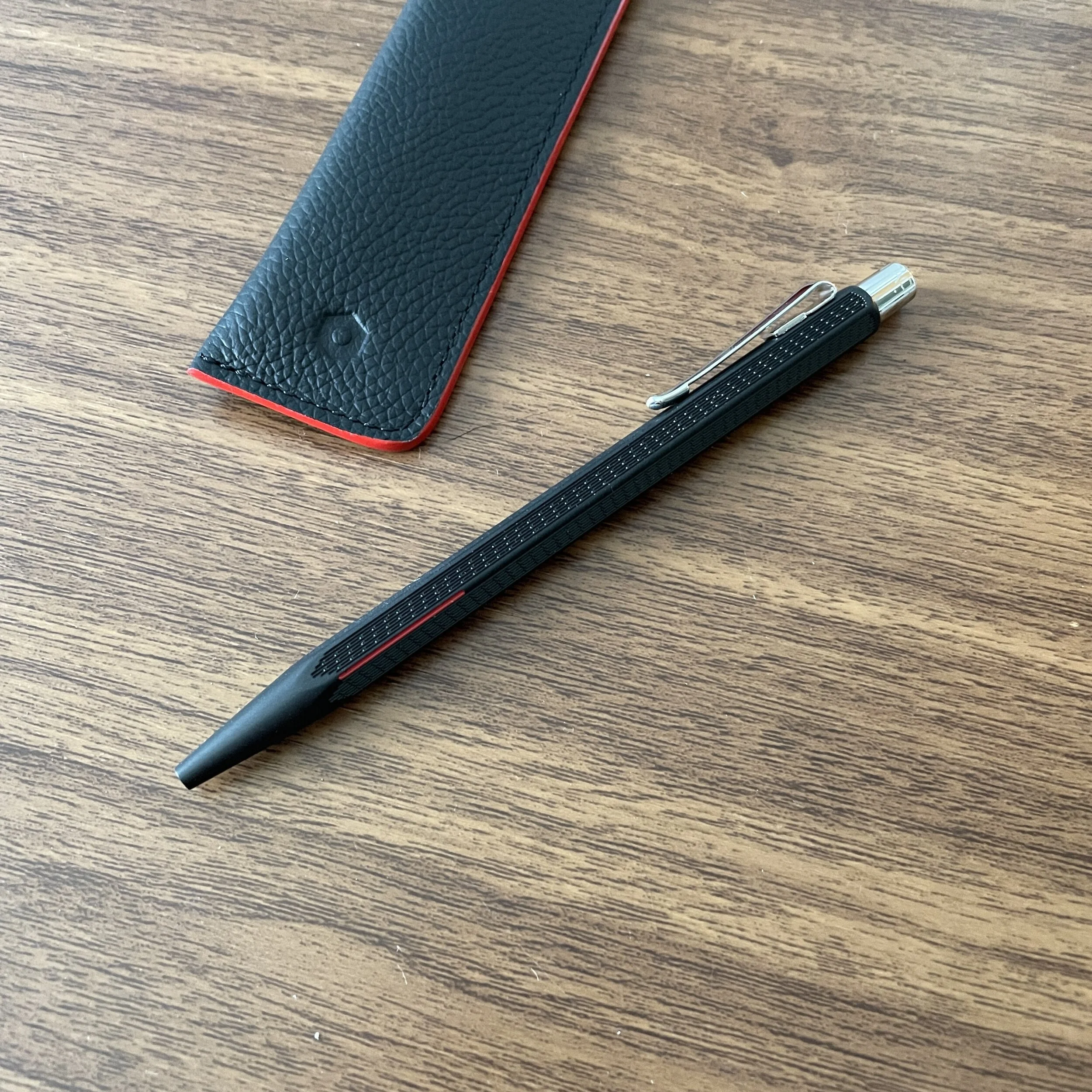 The Caran d’Ache lineup features several “collections”, ranging from the high-end Léman fountain pens to more entry level offerings such as the iconic 849 and the 888 “Infinite.” At the midpoint, which sometimes gets lost in the shuffle, is Caran d’Ache’s Ecridor collection. Typically, these pens and pencils are offered only in a polished chrome + guilloche finish, but this year Caran d’Ache has released a matte-black version dubbed the Ecridor “Racing” collection. Featuring a black-chrome brass barrel with guilloche engraving to add further grip and texture, the overall look of the pen is accentuated by two bright red lacquer stripes. (I couldn’t pass this one up - you all know red + black is my thing.)