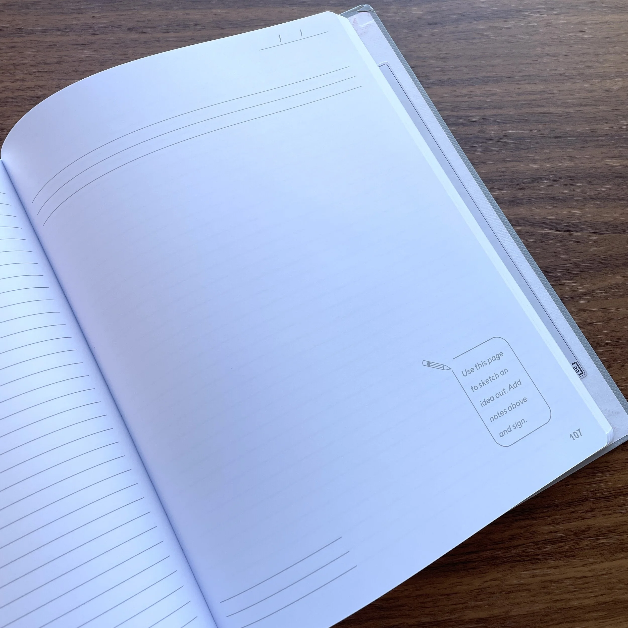 The journal/notebook itself measures 8” x 10” (in-between A5 and traditional “letter”), and the grey textured hardcover is thick and has a nice “hardback book” feel to it. The Starter Journal also includes various elastic straps to keep the journal closed in your bag and secure loose papers and a pen, and contains 192 pages of what is described as narrow-ruled “premium heavyweight paper” (more on that below) which alternates every five pages between perforated to-do lists and sketching pages. It’s a useful format that strikes a nice balance between structure and flexibility.