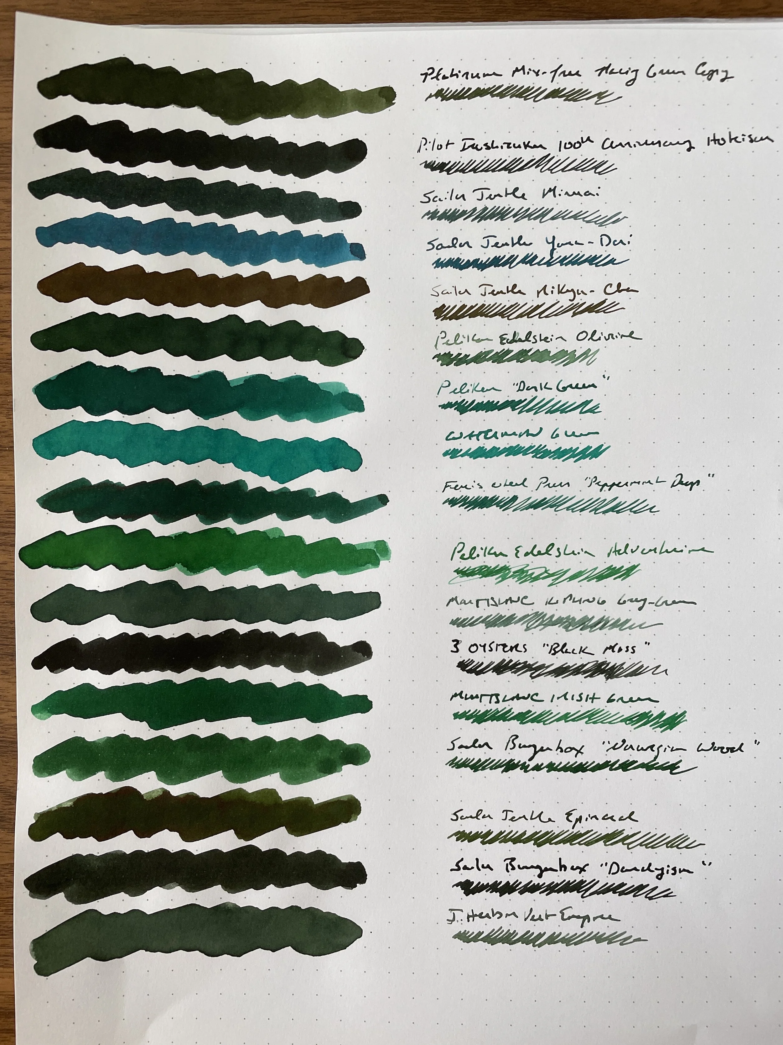 1. In addition to the Platinum Mix-Free combination, Sailor Jentle Epinard is a long-time favorite and probably the closest ink in my collection to a true “Racing Green.” I definitely need to use that ink more. Diamine Classic Green and Color Traveler Shodoshima Olive Green are similar, but lighter.