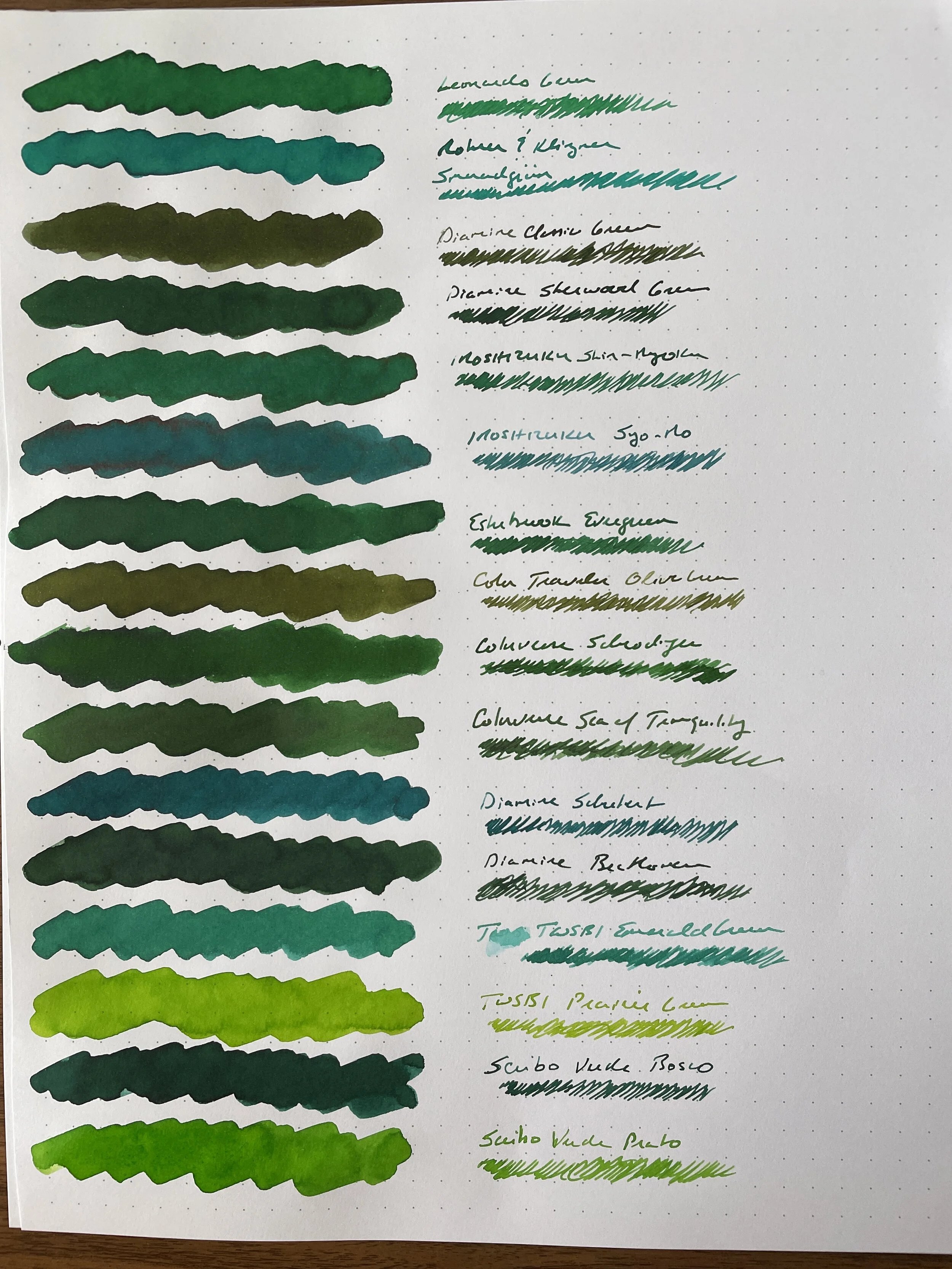 4. Overall, my favorite two brands for green inks at a reasonable price are Diamine and Colorverse. Diamine Classic Green and Sherwood Green are great colors I’ve recently added to my collection, and Colorverse Schrodinger and Sea of Tranquility have staying power.