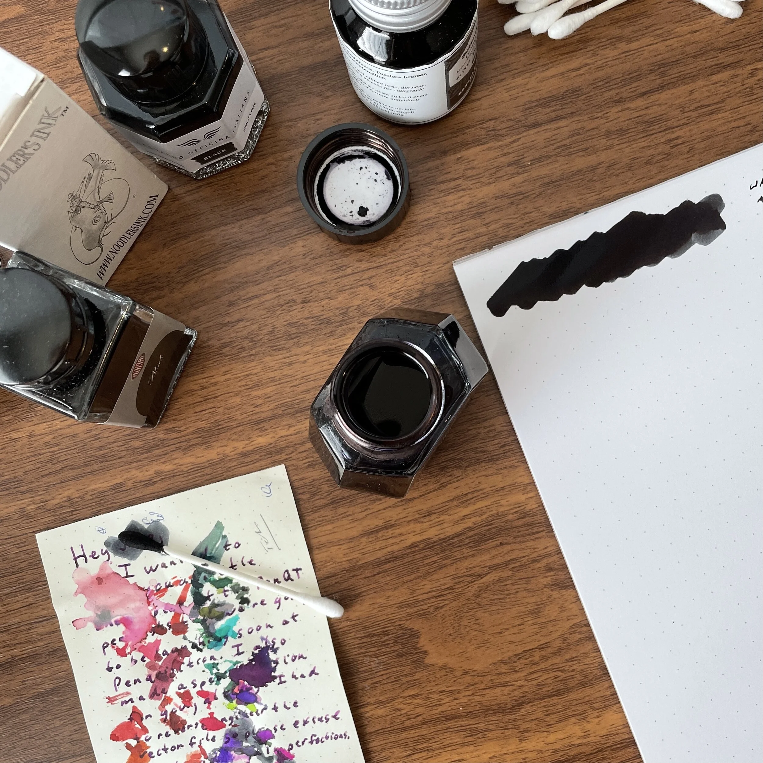 Black Inks. I always have appreciated, and continue to appreciate, a good black ink. But not a solid black, which I find boring. Most black ink enthusiasts know that black inks come in a variety of shades - some have blue, purple, or red undertones, and others dry to a matte finish. the closest ink to a “pure black” in my collection is classic Aurora Black, and while the color is a touch boring to me, it still gets a fair bit of use since it’s such a well-behaved, safe ink, especially for vintage pens. Other favorites include Waterman Black (red undertones), Lamy Black (purple undertones), and Roher & Klingner Leipzeiger Schwartz (blue-green undertones). Some people love Noodler’s Black and Sailor Kiwa-Guro for their waterproof qualities, but in my experience these black inks tend to smear since they are pigmented. I will likely keep the Kiwa-Guro for specific use cases since it smears the least.