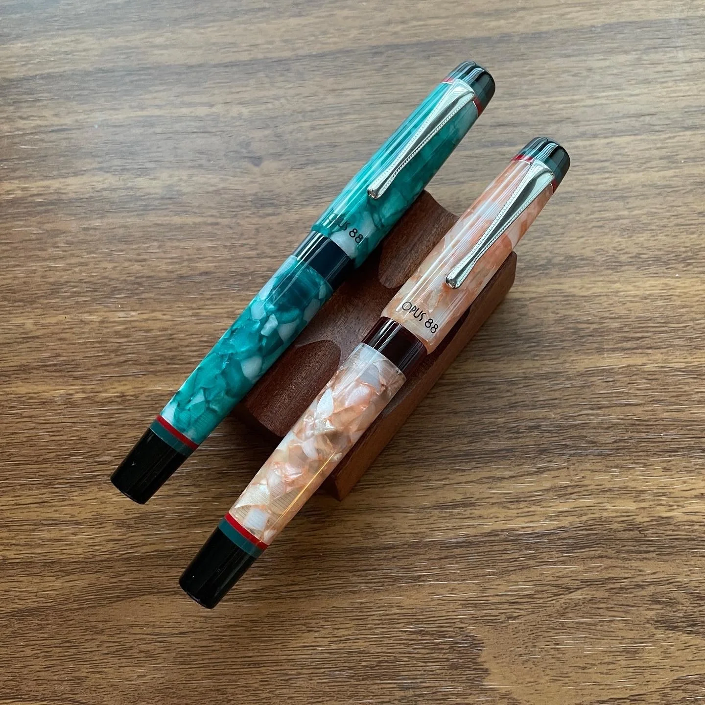 We currently offer two different models of Opus 88 fountain pens: the “Minty”, which is a streamlined flat top fountain pen in vintage-style flecked acrylic, and the translucent cigar-shaped “Jazz” demonstrator, a personal favorite of mine. Both pens are priced at $125 and $120, respectively, and feature reliable No. 6 JoWo nibs. As a preview of our upcoming Fountain Pen Day promotions, starting today all purchases of any fountain pen from the T.G.S. Curated Shop will ship with a free ink sample, so you can get your Opus 88 eyedropper writing immediately!