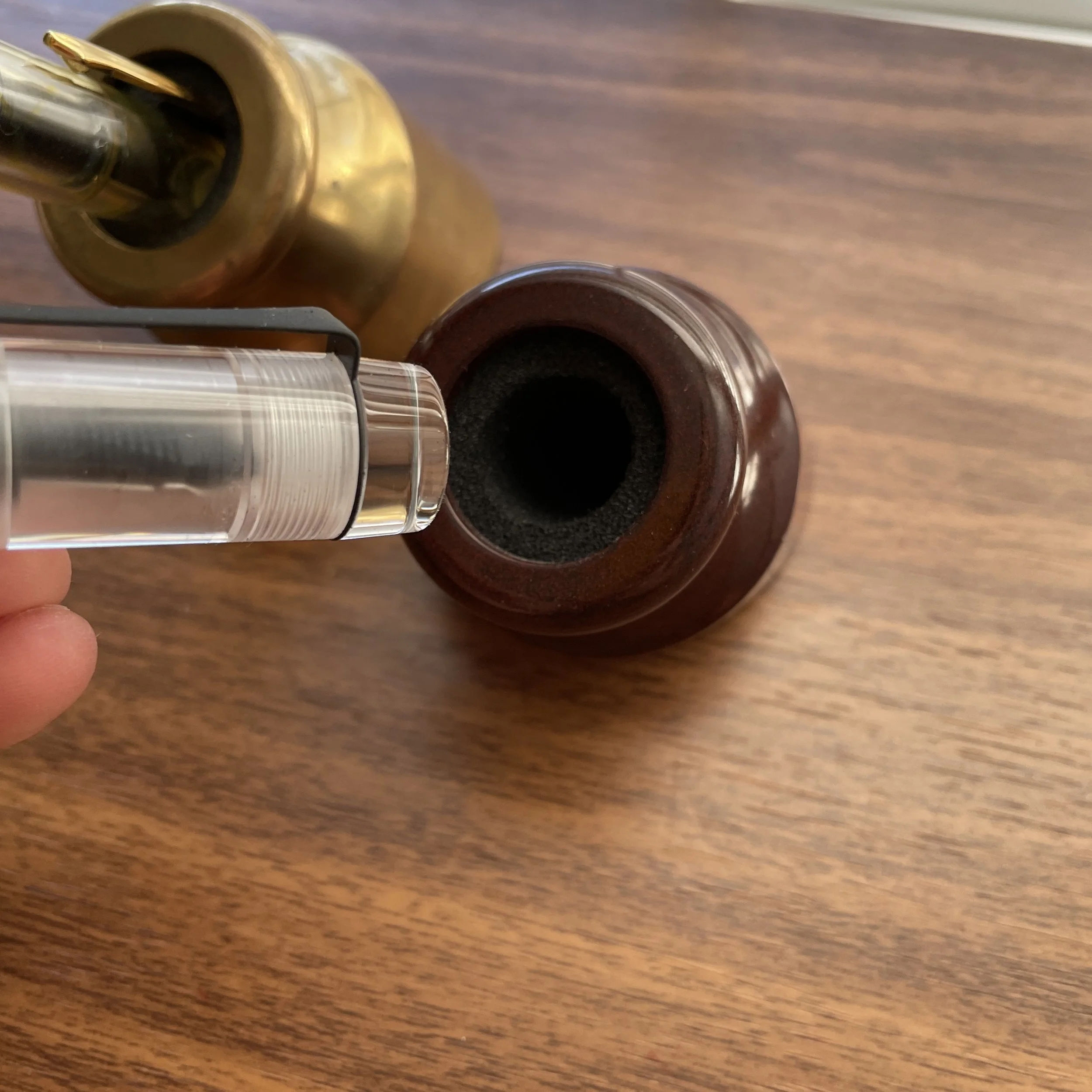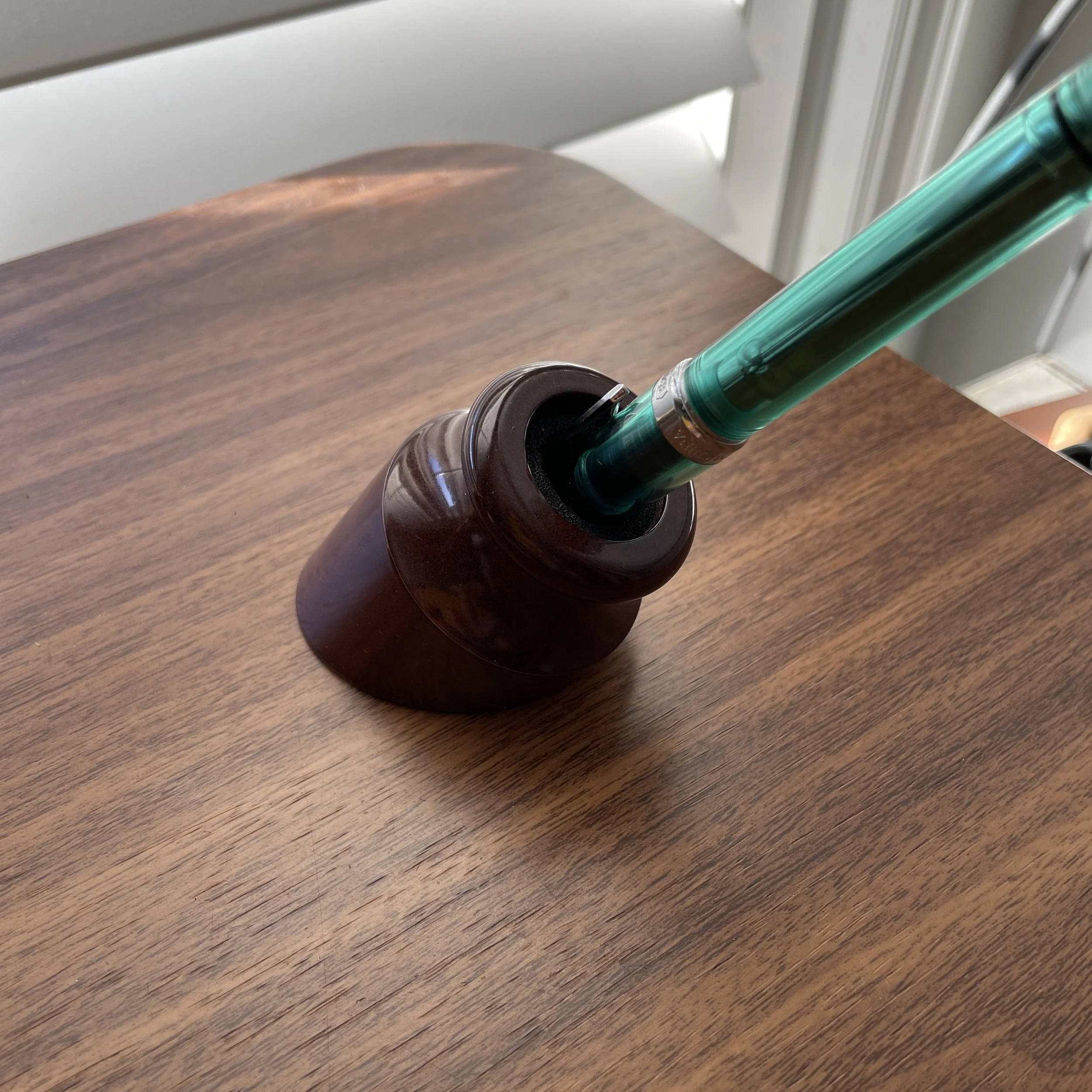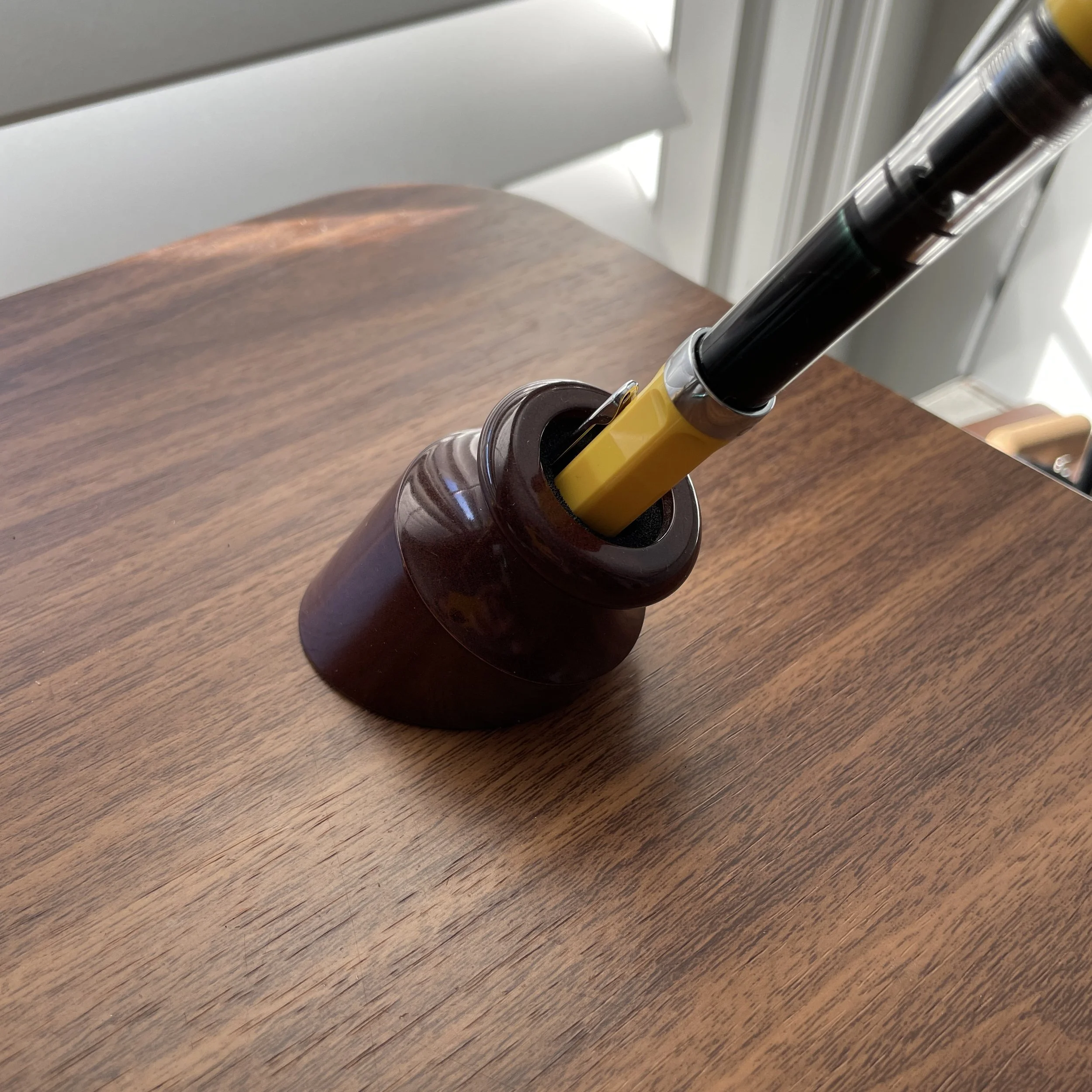 I’ve always loved the idea of a dedicated desk pen, especially some of the more lovely vintage sets, but the bases tend to have a large footprint and the pens themselves aren’t especially versatile, featuring long tapers and low ink capacity. With the Penwell, you can use your pen of choice in “desk pen mode”, and then pull it out to take it with you when you move away from your desk. That said, I sometimes use my larger Opus 88 eyedroppers, such as the classic “Demonstrator” pens, as semi-permanent desk pens when they’re inked. They hold so much ink that if I’m on a busy streak at work and don’t want to worry about refilling, I can park them in the Penwell and keep a fountain pen at the ready, which is convenient for those days when I accidentally leave my pen case at home. Below I’ve included pictures of the Penwell with fountain pens in different sizes, to showcase the versatility.