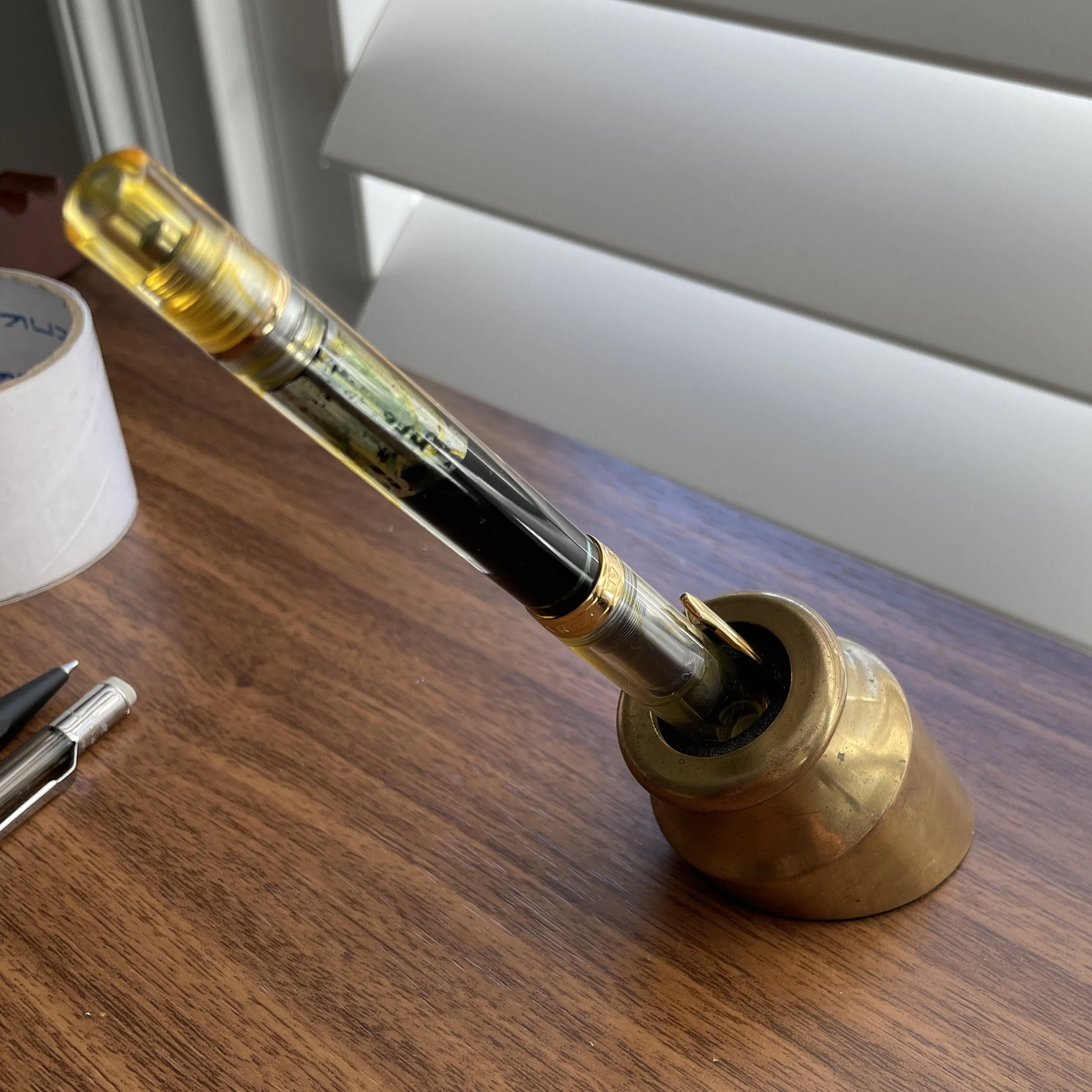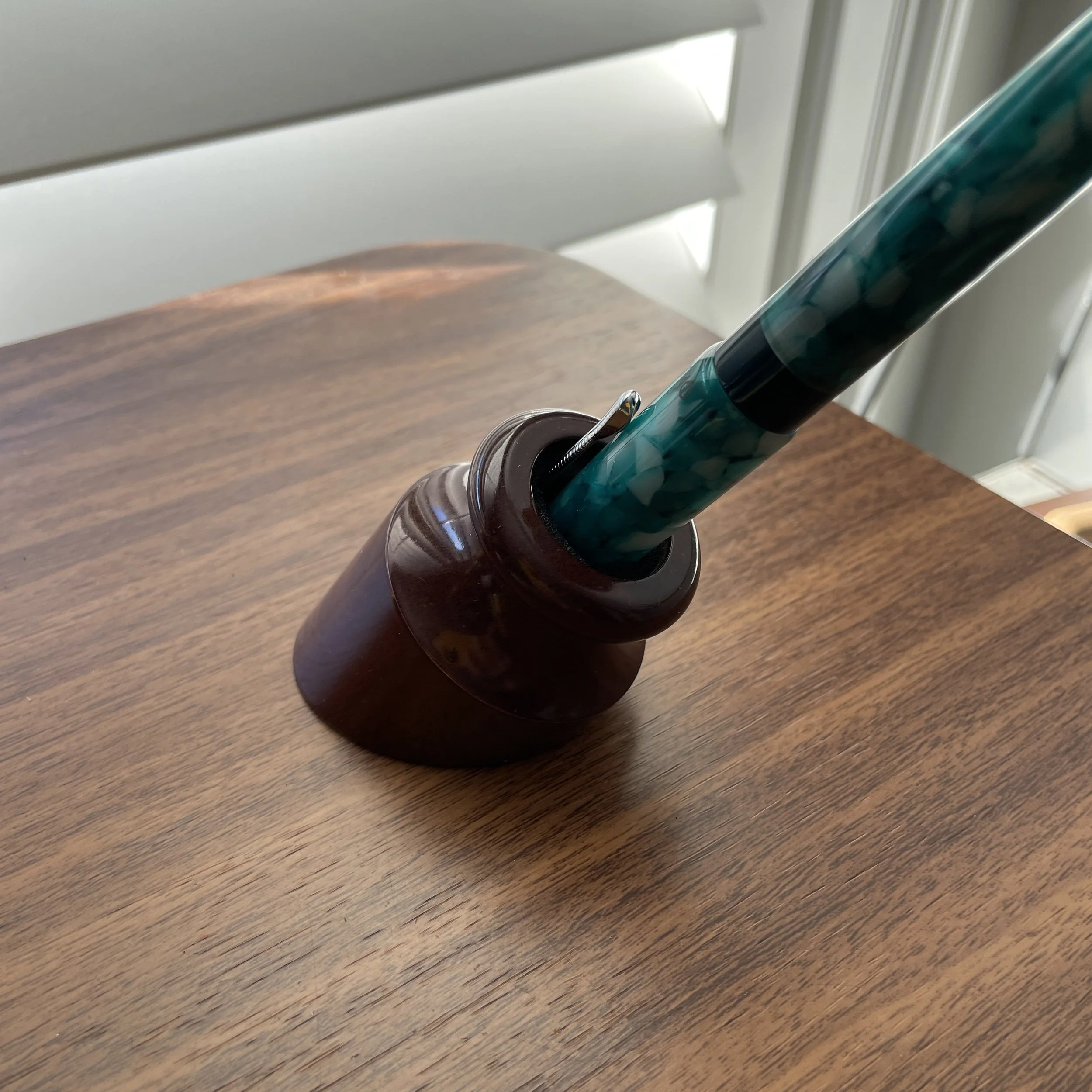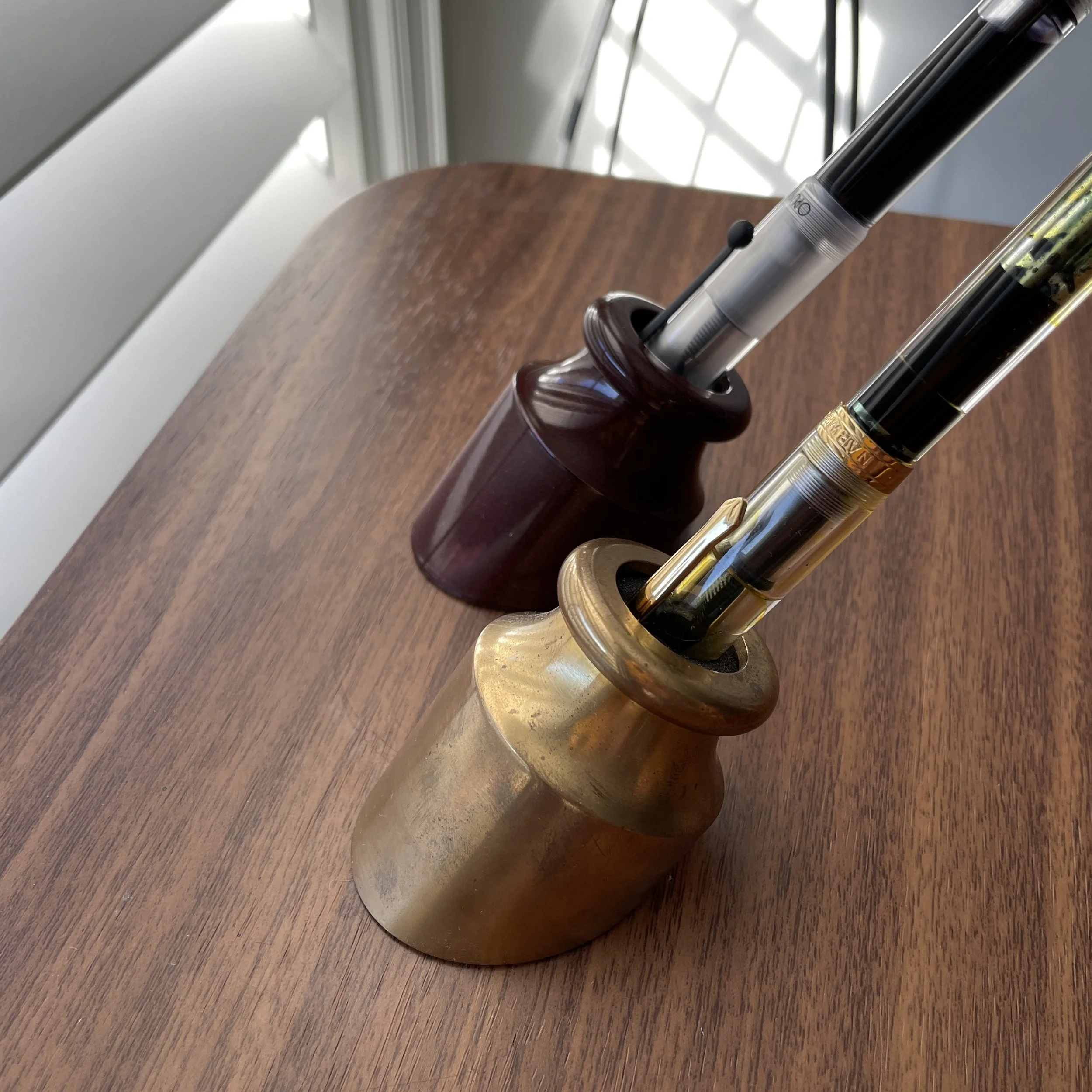 I’ve always loved the idea of a dedicated desk pen, especially some of the more lovely vintage sets, but the bases tend to have a large footprint and the pens themselves aren’t especially versatile, featuring long tapers and low ink capacity. With the Penwell, you can use your pen of choice in “desk pen mode”, and then pull it out to take it with you when you move away from your desk. That said, I sometimes use my larger Opus 88 eyedroppers, such as the classic “Demonstrator” pens, as semi-permanent desk pens when they’re inked. They hold so much ink that if I’m on a busy streak at work and don’t want to worry about refilling, I can park them in the Penwell and keep a fountain pen at the ready, which is convenient for those days when I accidentally leave my pen case at home. Below I’ve included pictures of the Penwell with fountain pens in different sizes, to showcase the versatility.