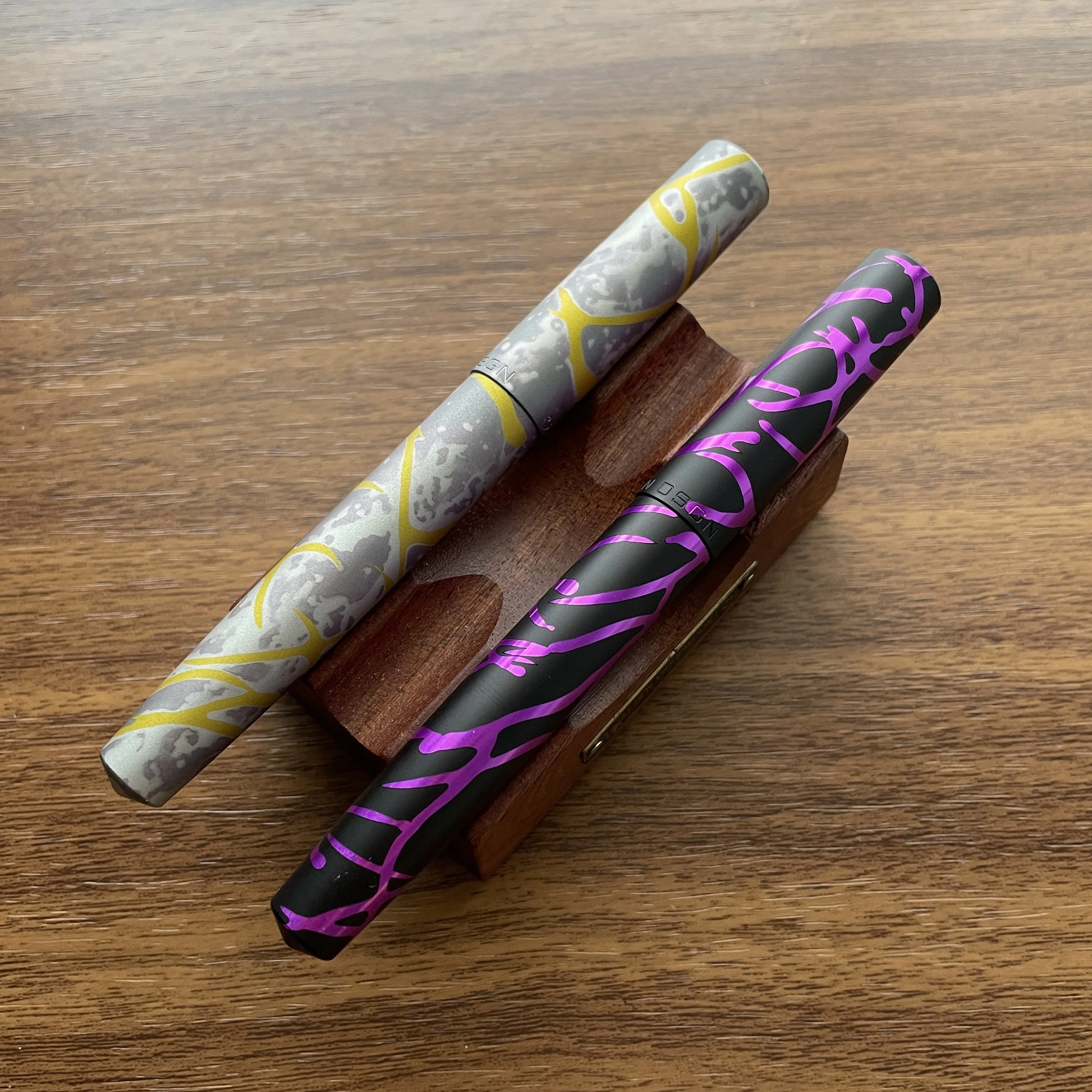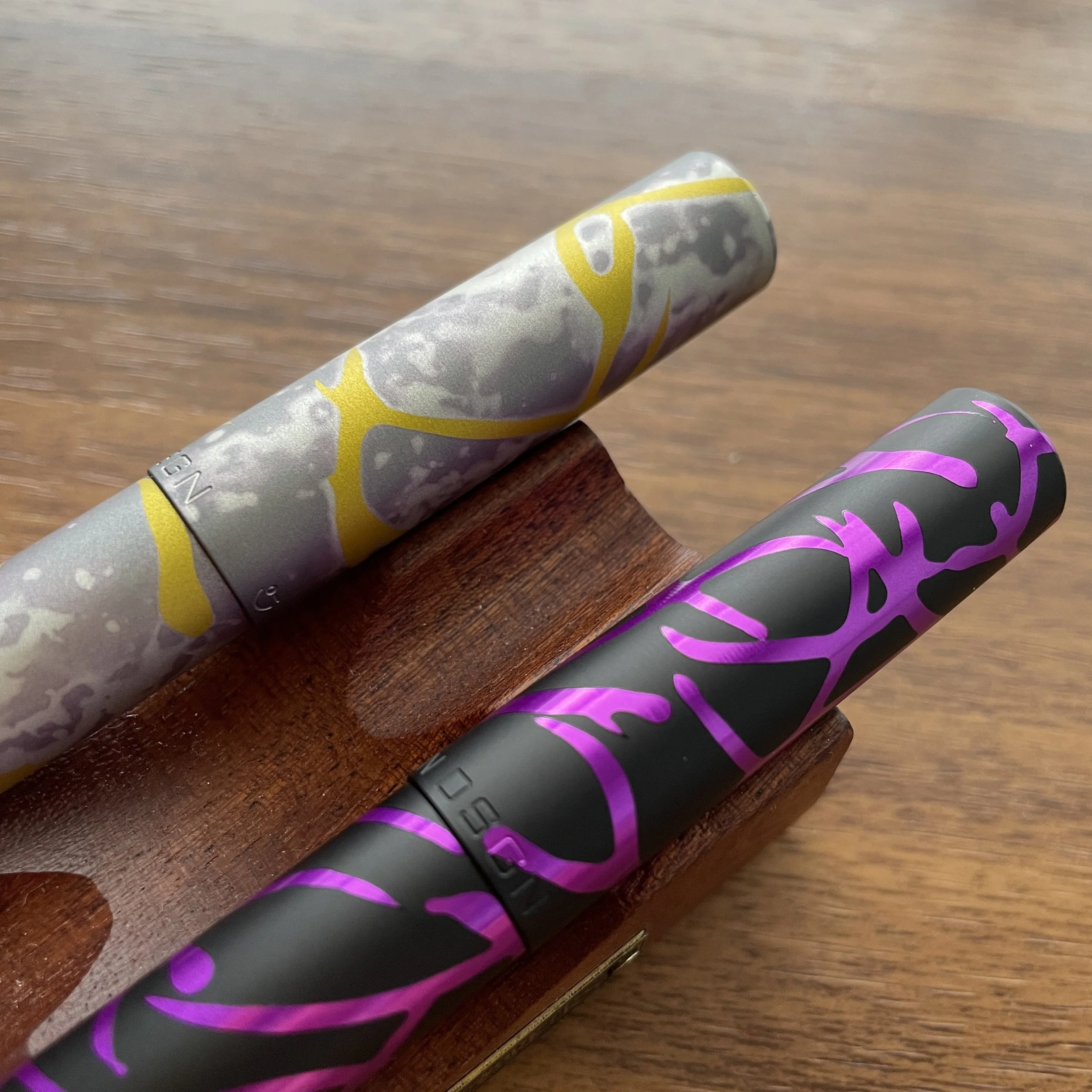 Two Schon DSGN Full-Size Fountain Pens in “Saffron Cement” (Top) and 3D Purple (Bottom). The 3D Purple is still available; the Saffron Cement has cycled out of rotation for the moment.