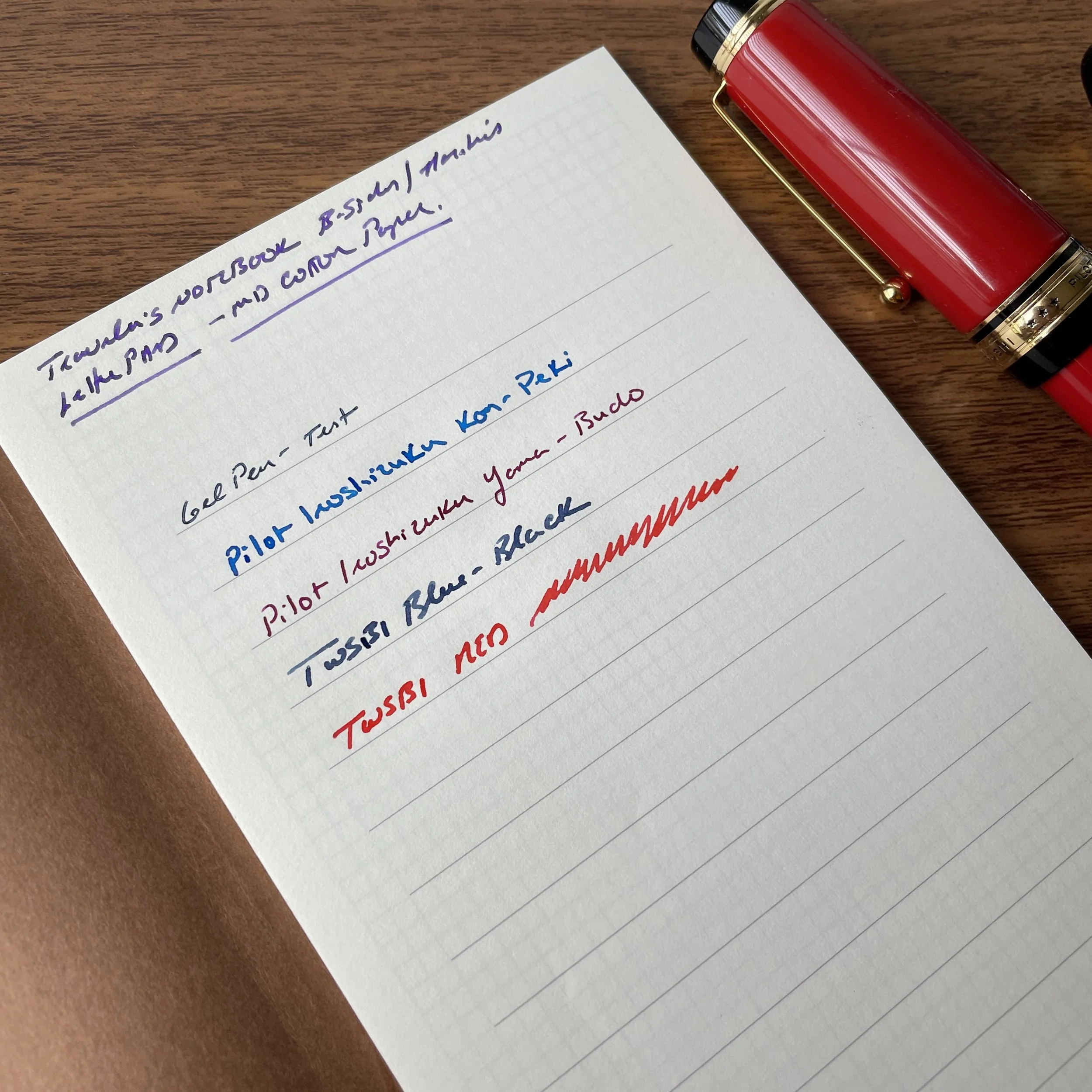 The T.G.S. Curated Shop carries Midori MD Cotton paper in several formats, including the standard A4 and A5 writing pads, the “F” sized notebooks, and the Traveler’s Company “Letter Pads” from the B-Sides and Rarities collection. At one point, Midori made MD Cotton notebooks in standard A5, B6, etc., and I’m hoping they eventually bring them back! For more information on Midori Paper, and a wide range of other fountain pen friendly papers stocked in our shop (and elsewhere, with our friends), check out this post on fountain pen friendly paper recommendations.