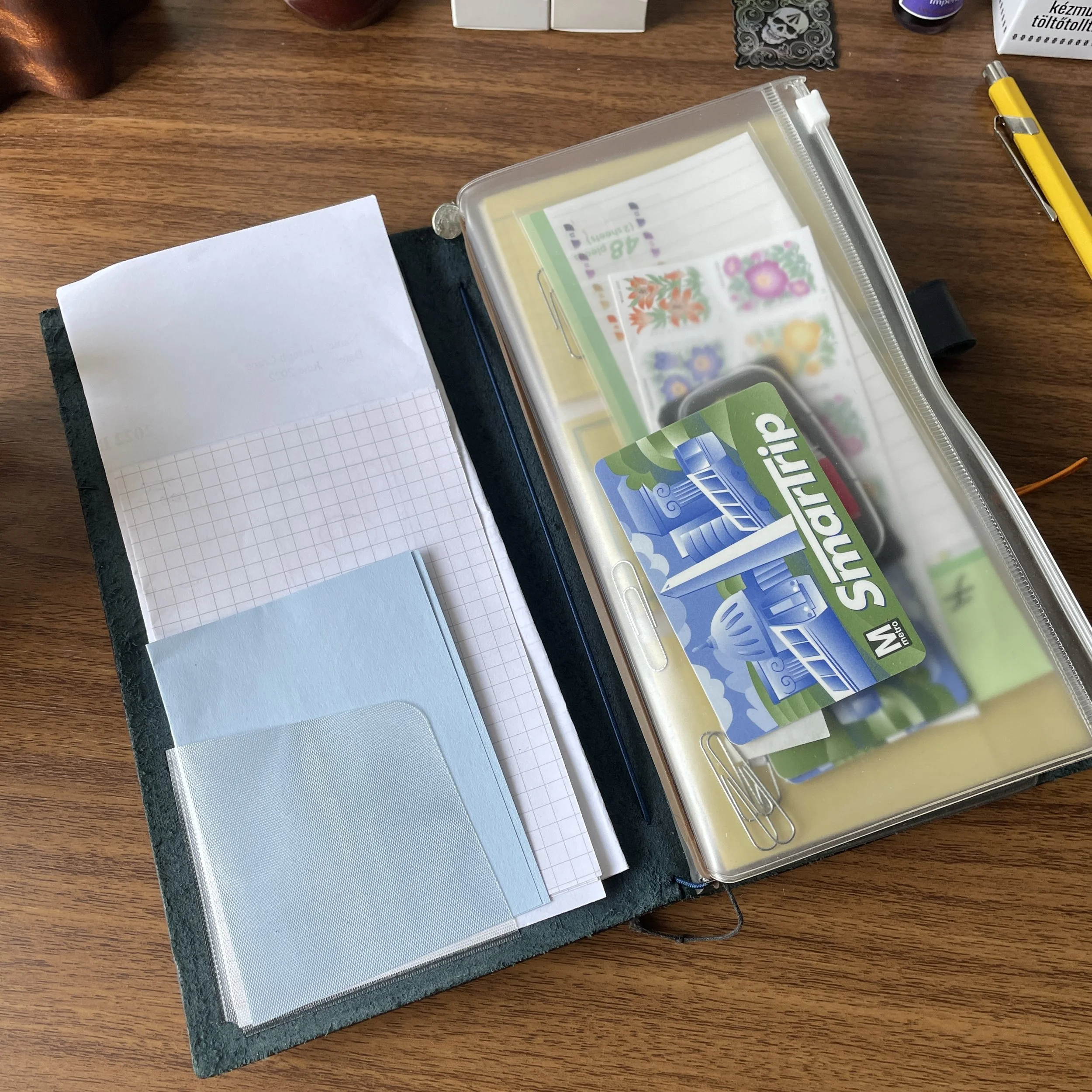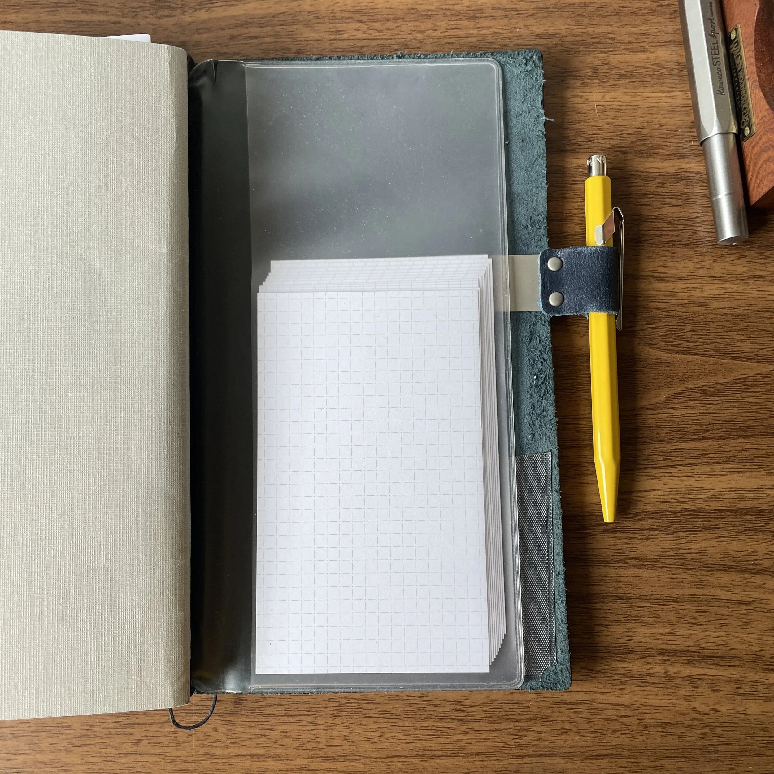 At the front, I have two pockets on the inside cover to hold loose papers and cards, a PVC zippered pouch that holds miscellaneous stamps and flags/labels, and my Traveler’s Sticky Notes. I use the back flap of the PVC pouch refill to hold some index cards, and I usually keep a ballpoint or other “write anywhere” pen in a Traveler’s Notebook Pen Loop.