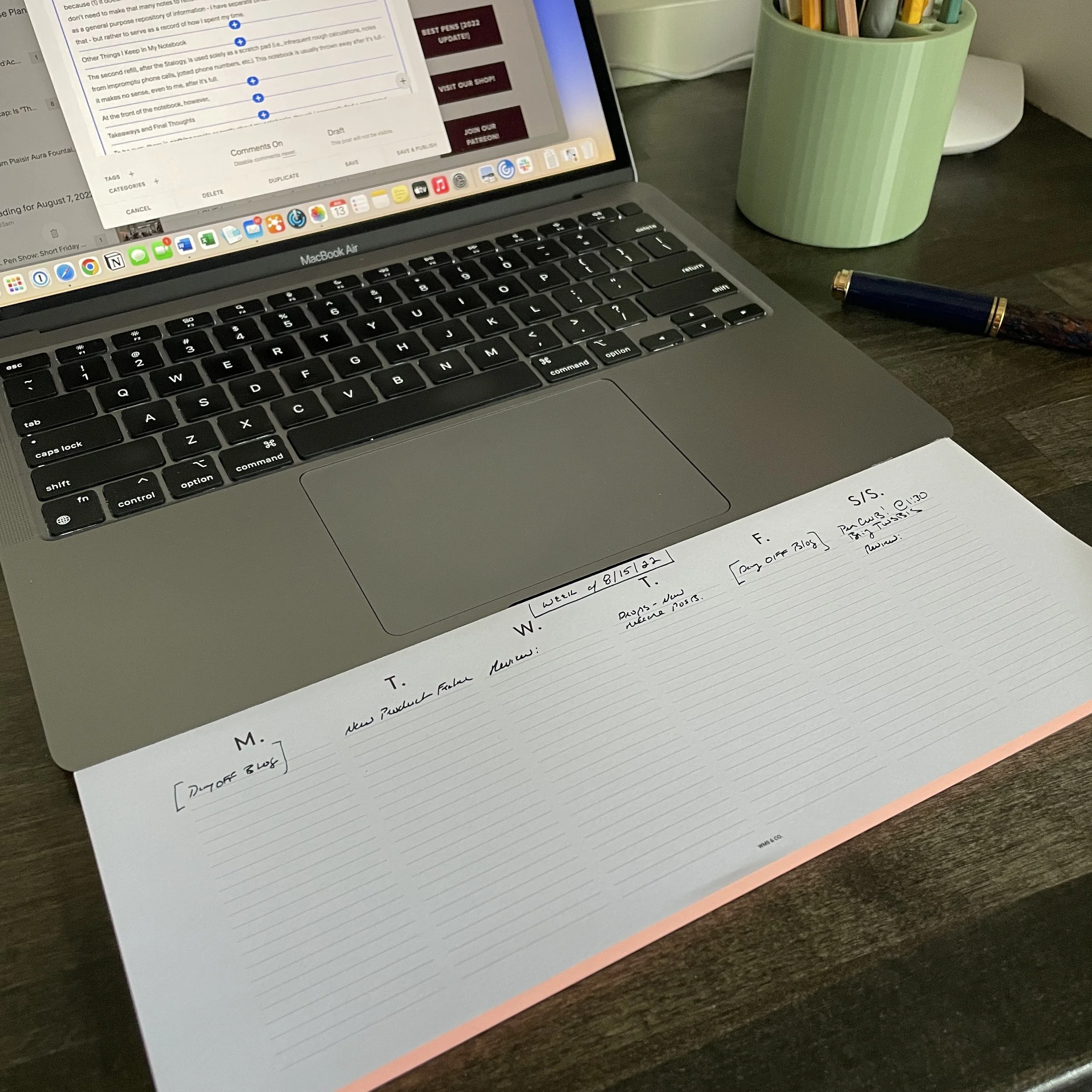 Personally, I stick to a practical approach to planning that focuses on task management. First, I don’t keep a paper calendar to manage appointments or deadlines, at least for work stuff. (It’s much easier to use an electronic calendar when you have to coordinate with multiple teams and other people need the ability to see your schedule and make changes to common events.) I do, however, use the Write and WMS & Co. “weekly layout” pages to generally sketch out my week, typically in a list or bullet-style format that allows me to think through what I want to accomplish on each day. This is 30,000-foot level planning stuff that I do on Sunday afternoon and quickly revisit each morning - I very rarely go back to these “planners” after the week is over, and since the WMS & Co. is a tear-off pad, I usually just shred the calendar page after I’m done. If there are notes I make to myself that I want to retain, I’ll transfer them to another notebook or my laptop.