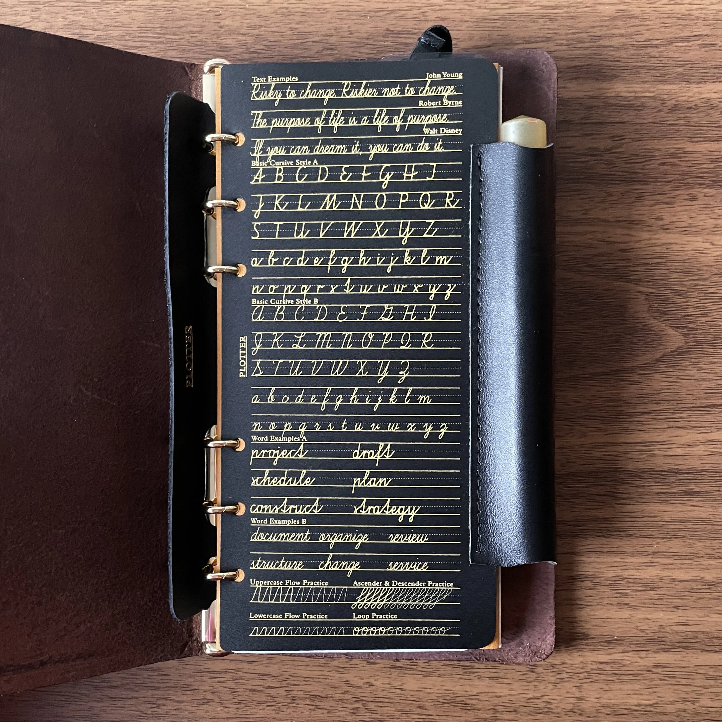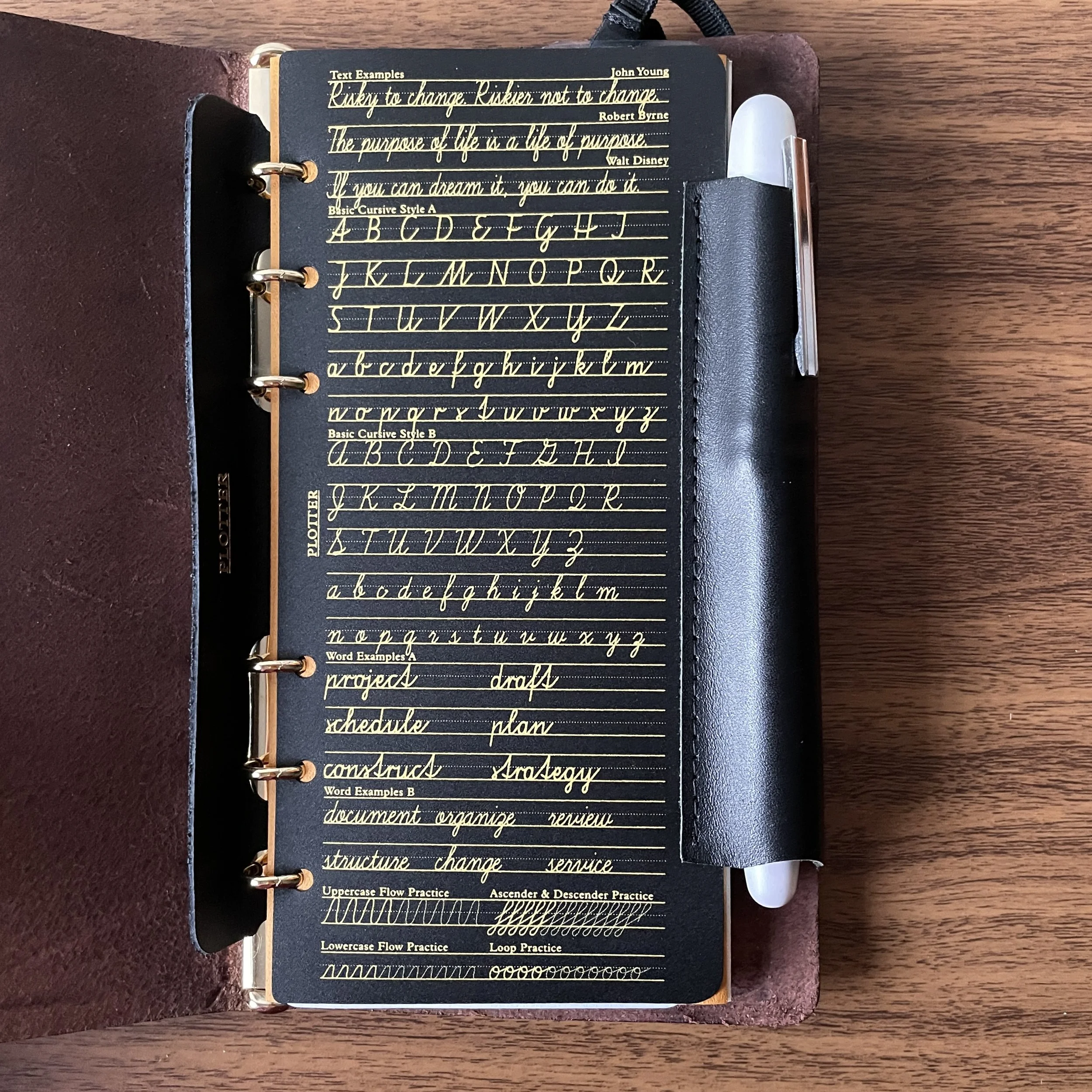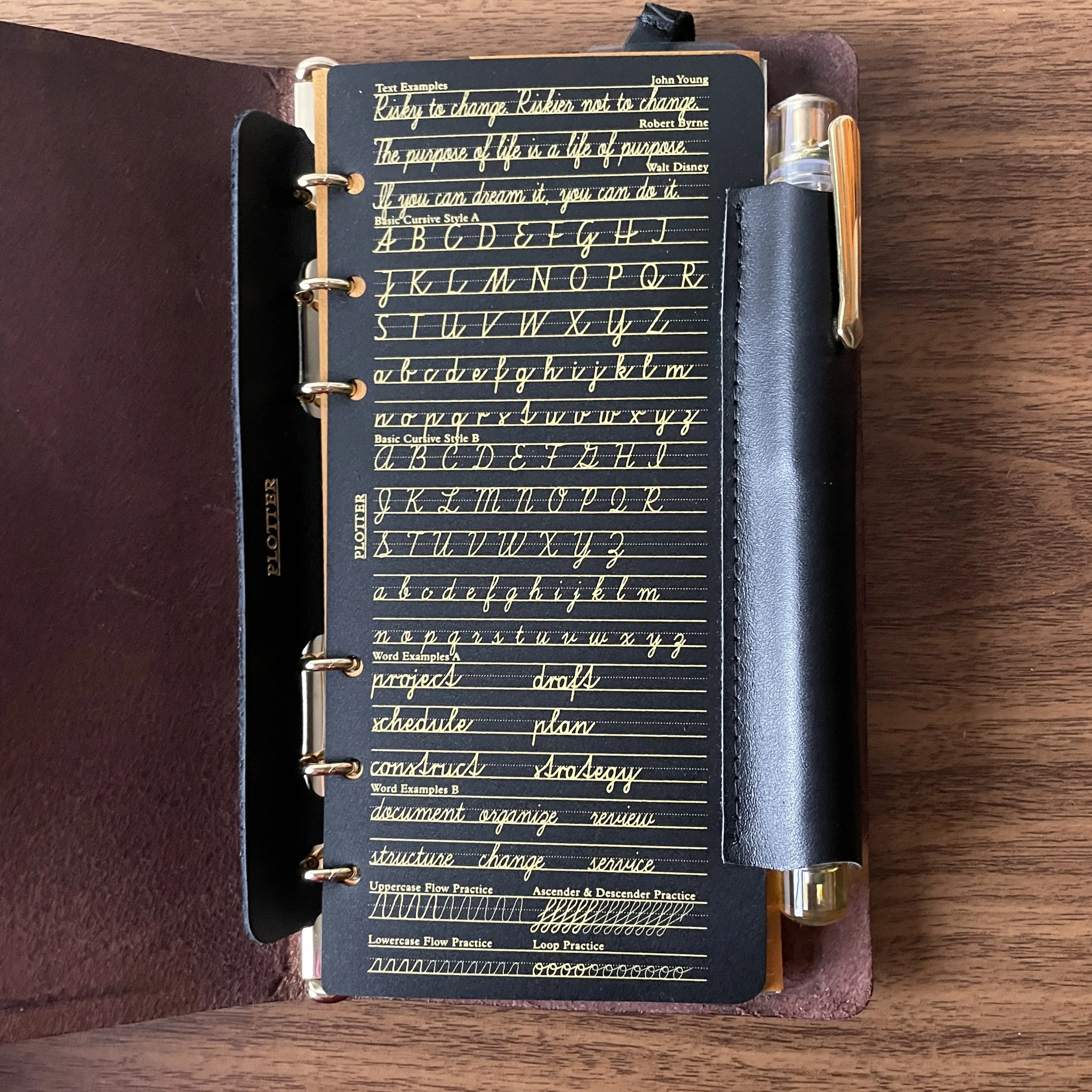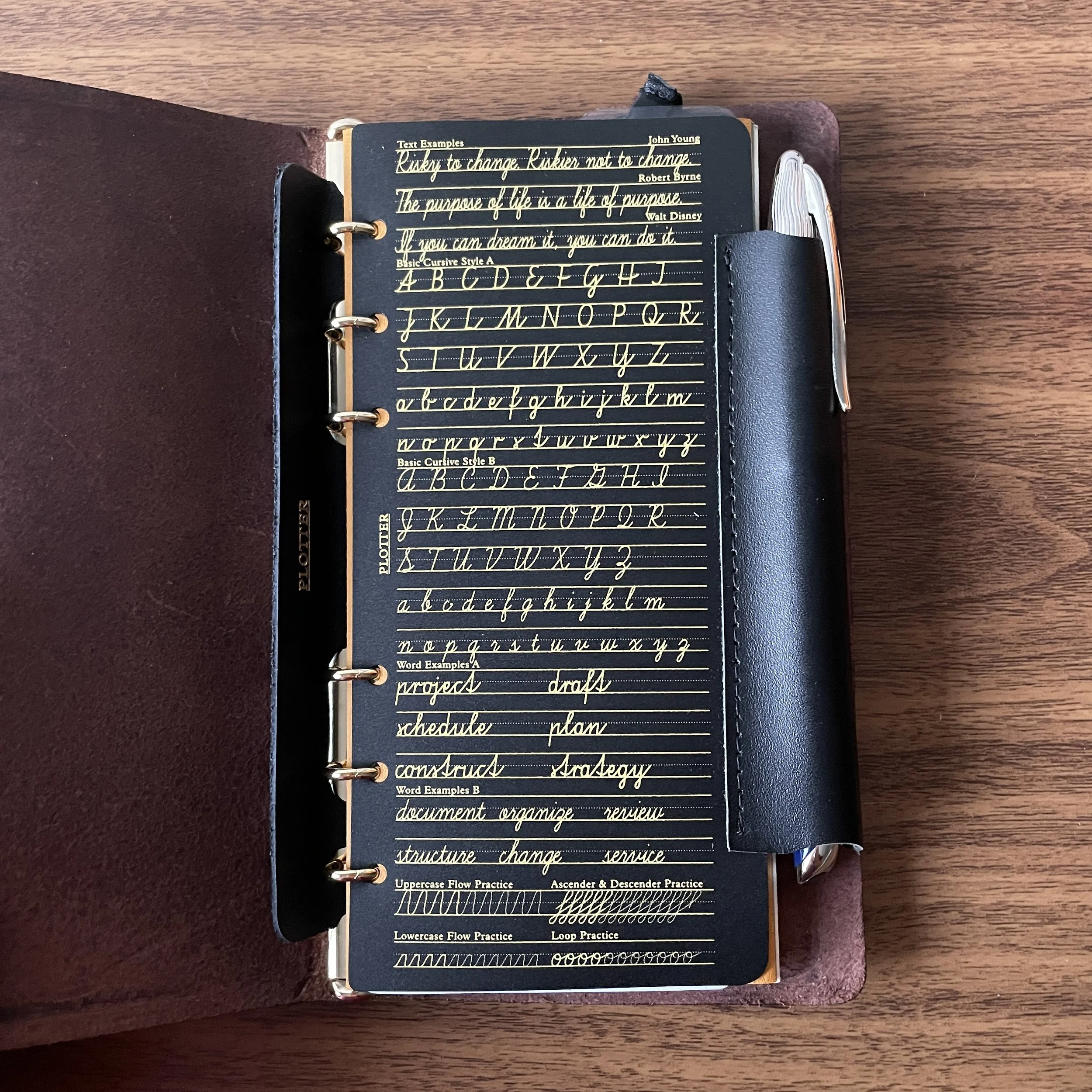 Before we get started with pen comparisons, I need to do an overview of how Plotter works from a setup perspective. One of the key features of the Plotter system (which is either a benefit or a drawback, depending on how you like to purchase your planners), is that Plotter is completely customizable, meaning that you purchase the cover, refills, and all desired accessories separately to create the notebook that works for you. While the Plotter system does not ship with a pen loop, you can add one by purchasing the “Leather Penholder with Lifter” accessory refill specific to your size leather binder.