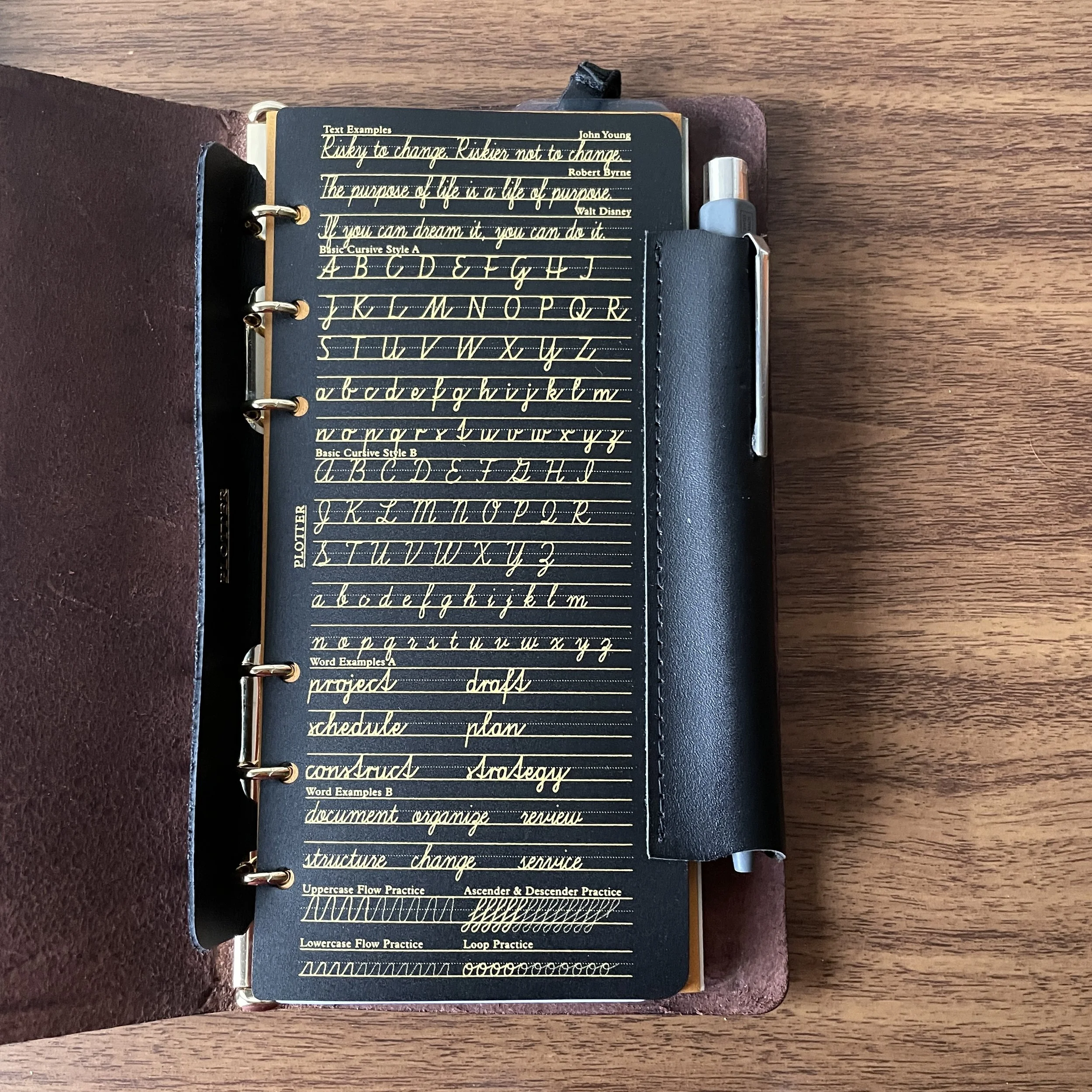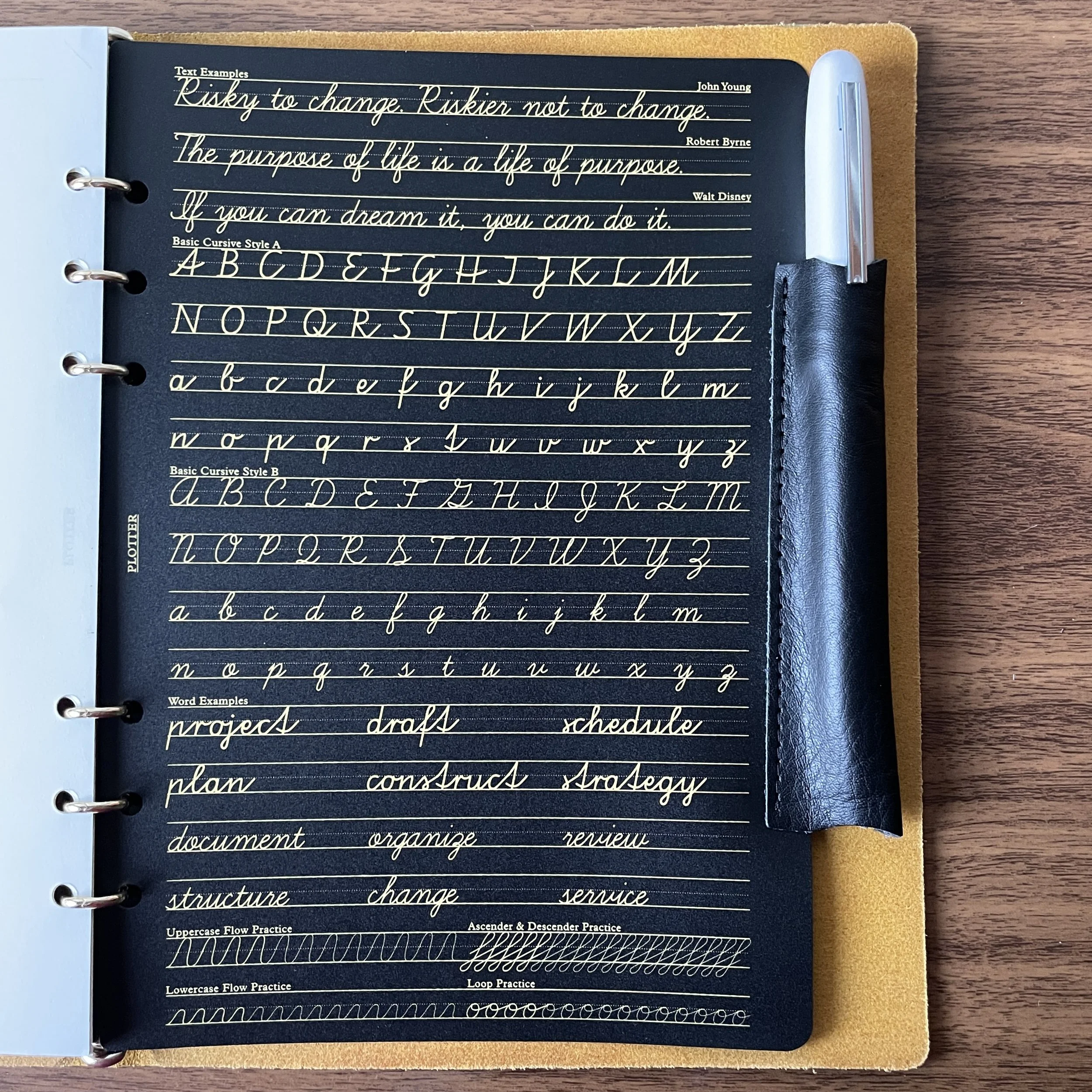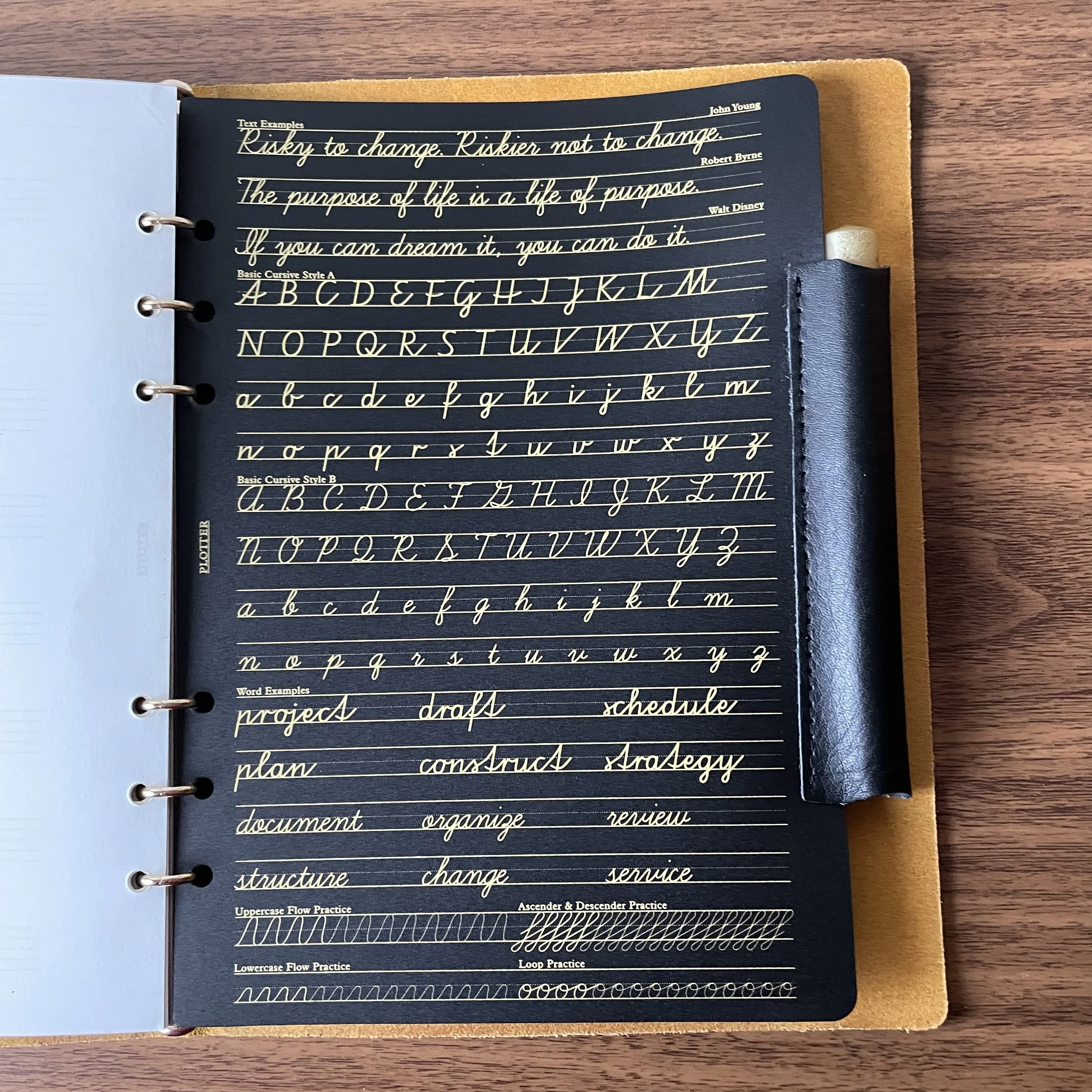 Before we get started with pen comparisons, I need to do an overview of how Plotter works from a setup perspective. One of the key features of the Plotter system (which is either a benefit or a drawback, depending on how you like to purchase your planners), is that Plotter is completely customizable, meaning that you purchase the cover, refills, and all desired accessories separately to create the notebook that works for you. While the Plotter system does not ship with a pen loop, you can add one by purchasing the “Leather Penholder with Lifter” accessory refill specific to your size leather binder.