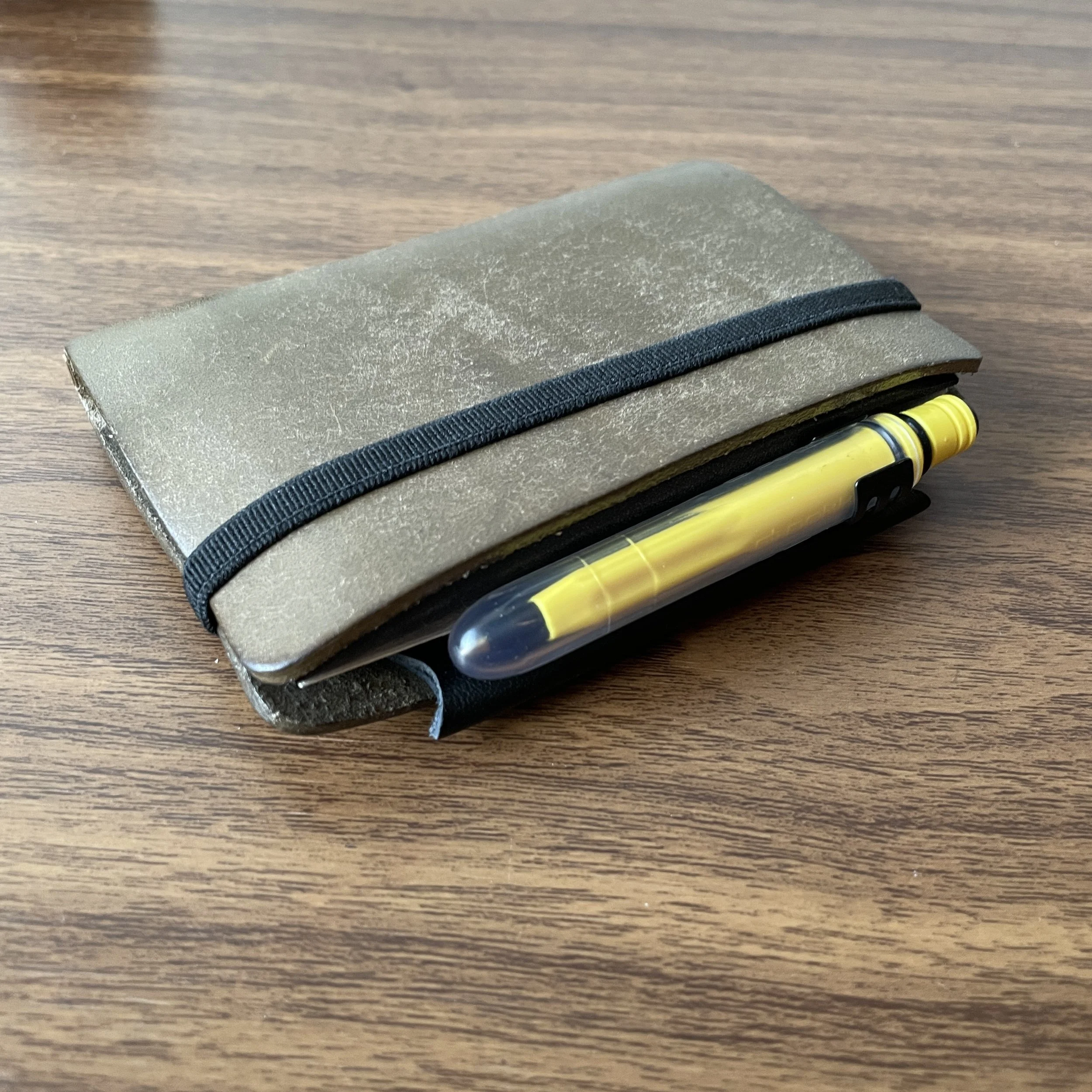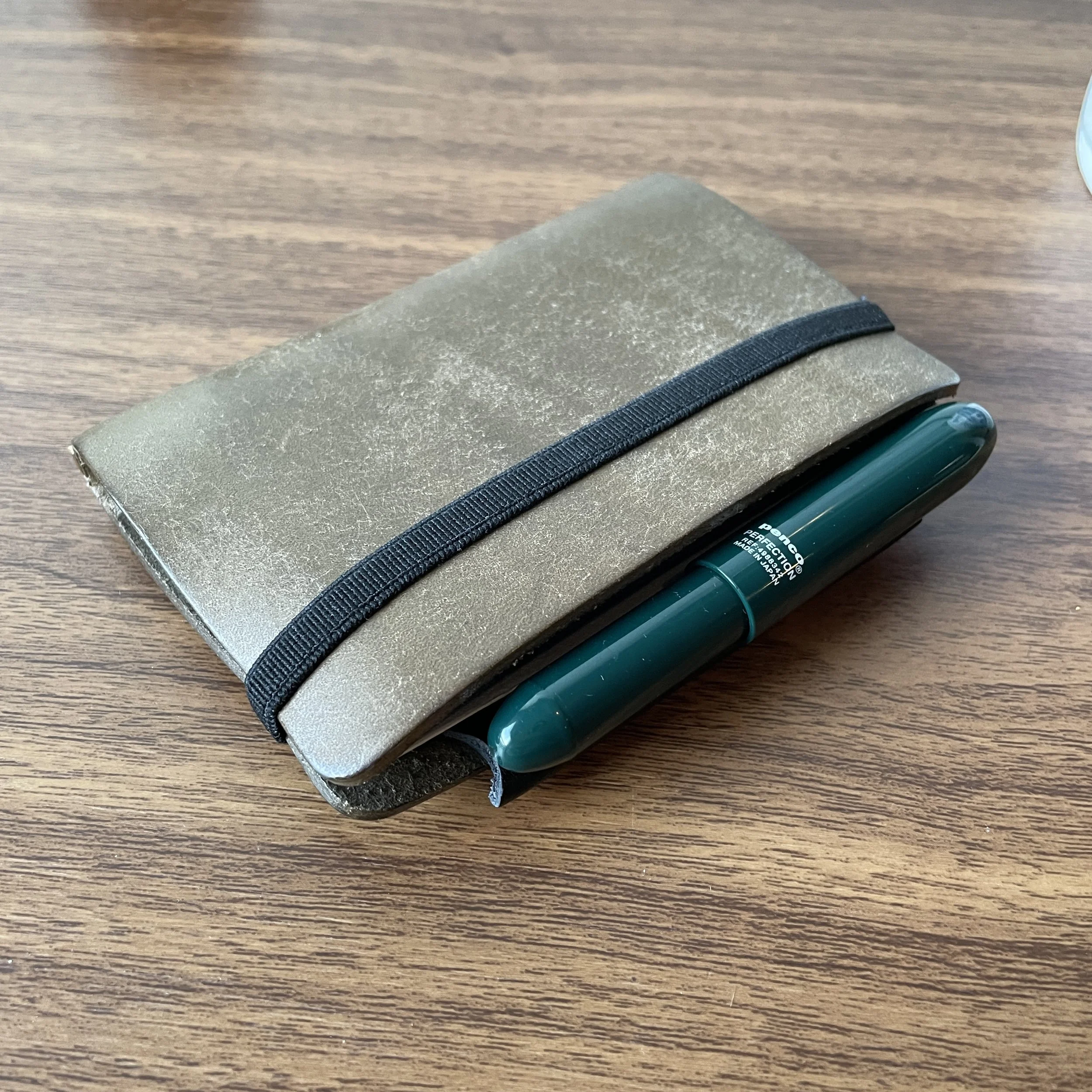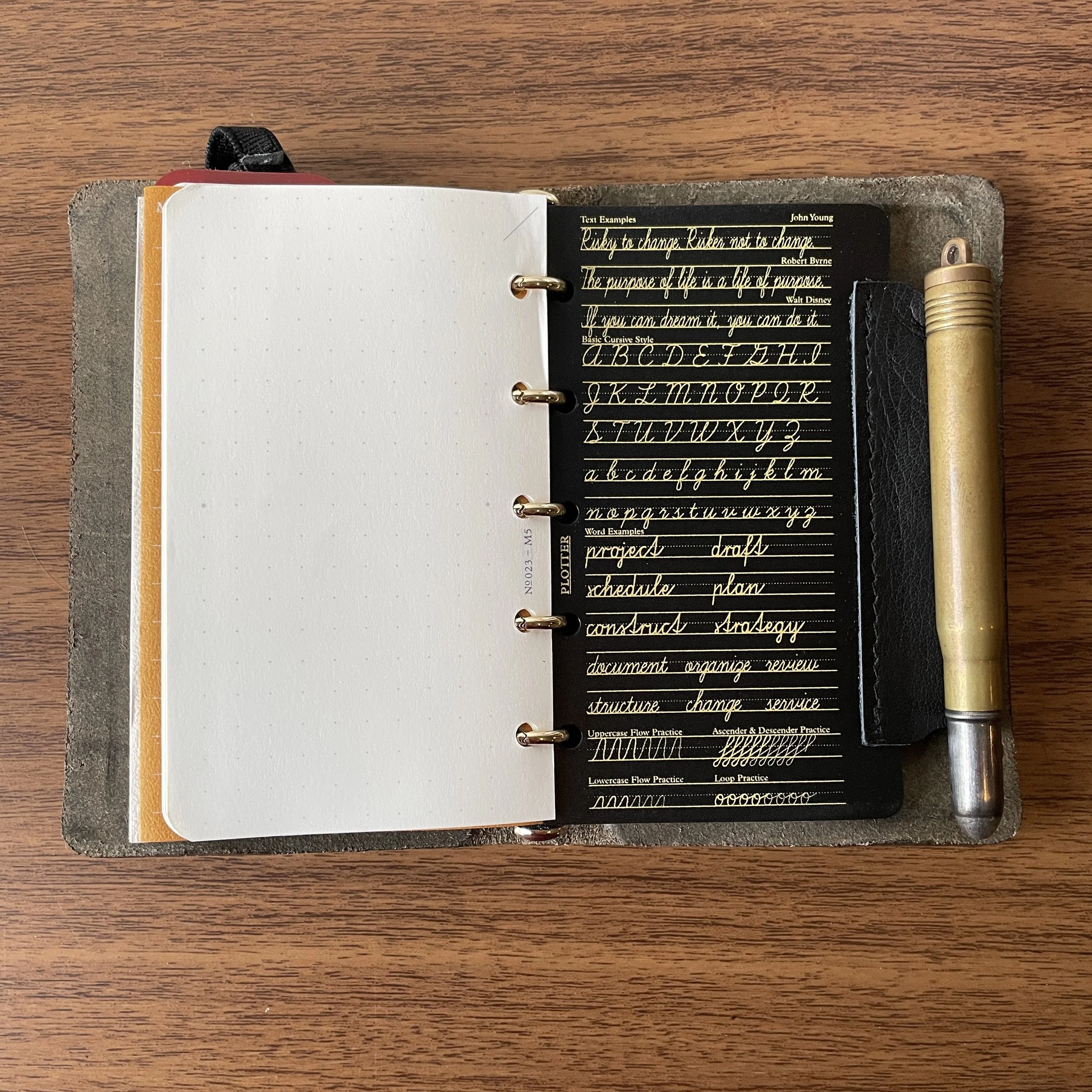 By far, I’ve received the most questions about my Plotter Mini 5, the smallest of the Plotters and the one I’ve been carrying as a combination wallet/pocket notebook. According to Plotter USA, the Mini 5 pen loop holds pens up to 9mm. As you might imagine, finding a suitable pen to fit this tiny notebook has been more challenging, and for the most part I’ve simply clipped a variety of pocket pens to the outside of the loop. (This technique also makes for quicker deployment - something I find advantageous for most forms of pocket writing.) To be honest, the only pen I’ve tried that actually fits inside the pen holder is the Kaweco Liliput, though it’s not pictured here because I don’t own one and borrowed one at pen club to test. Here are a few that I’ve actually been carrying in the Mini 5, all clipped to the outside: