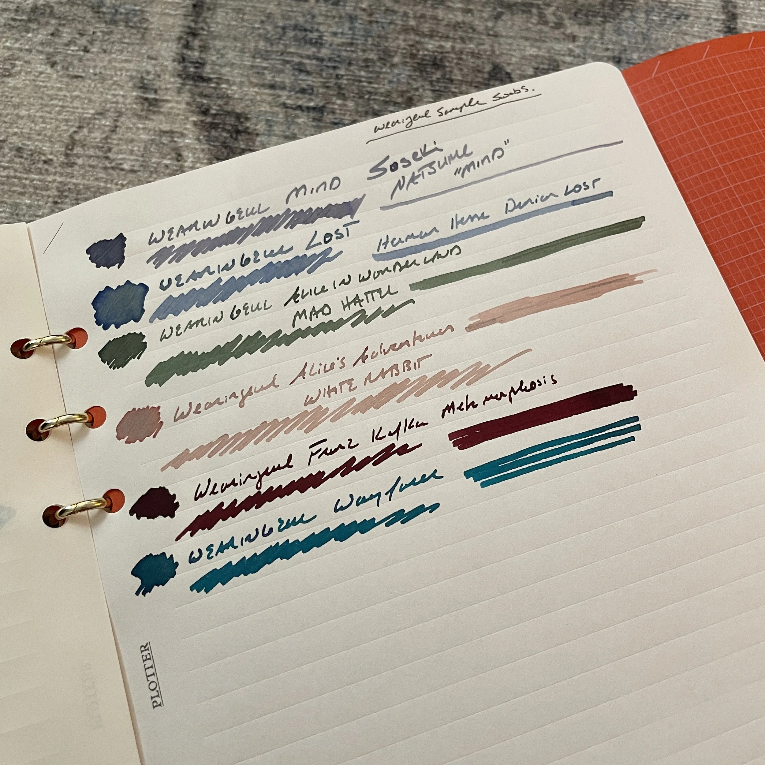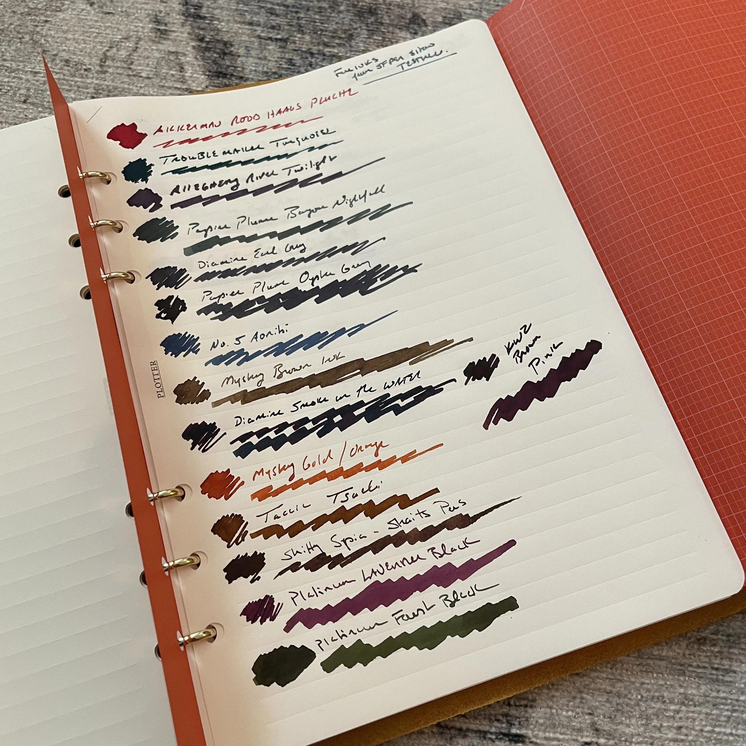 Did I mention I can’t pick a favorite? The paper shown here is Midori MD Cotton - my new favorite paper for ink sampling, but in a test run Plotter refill where Plotter took A5 sheets and letterpressed lines into the cotton paper. Please do me a favor and e-mail Plotter USA now, and demand that they bring this paper into the standard lineup. It’s amazing. For now, I’ll have to settle for taking the standard MD Cotton A5 pad and punching holes in it.