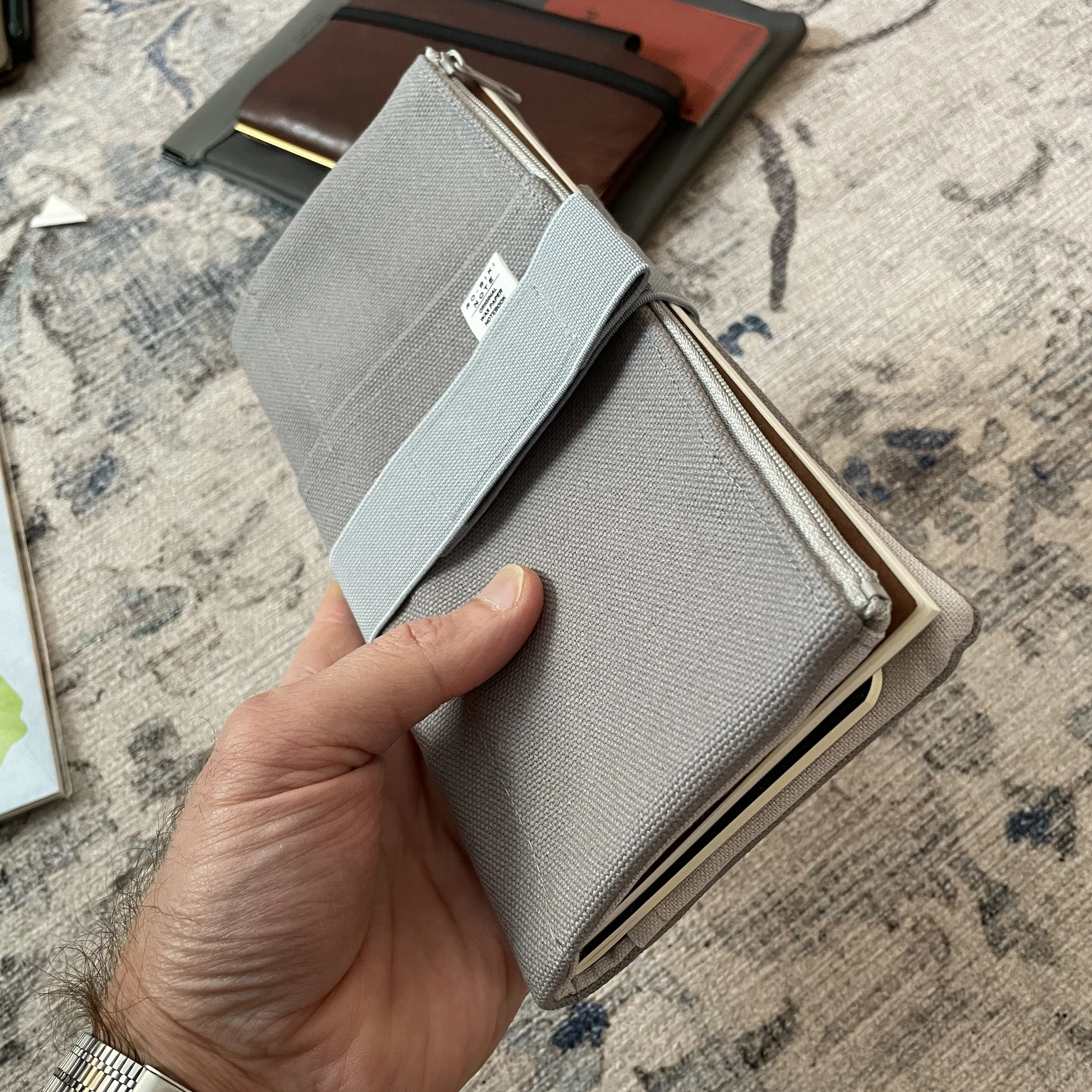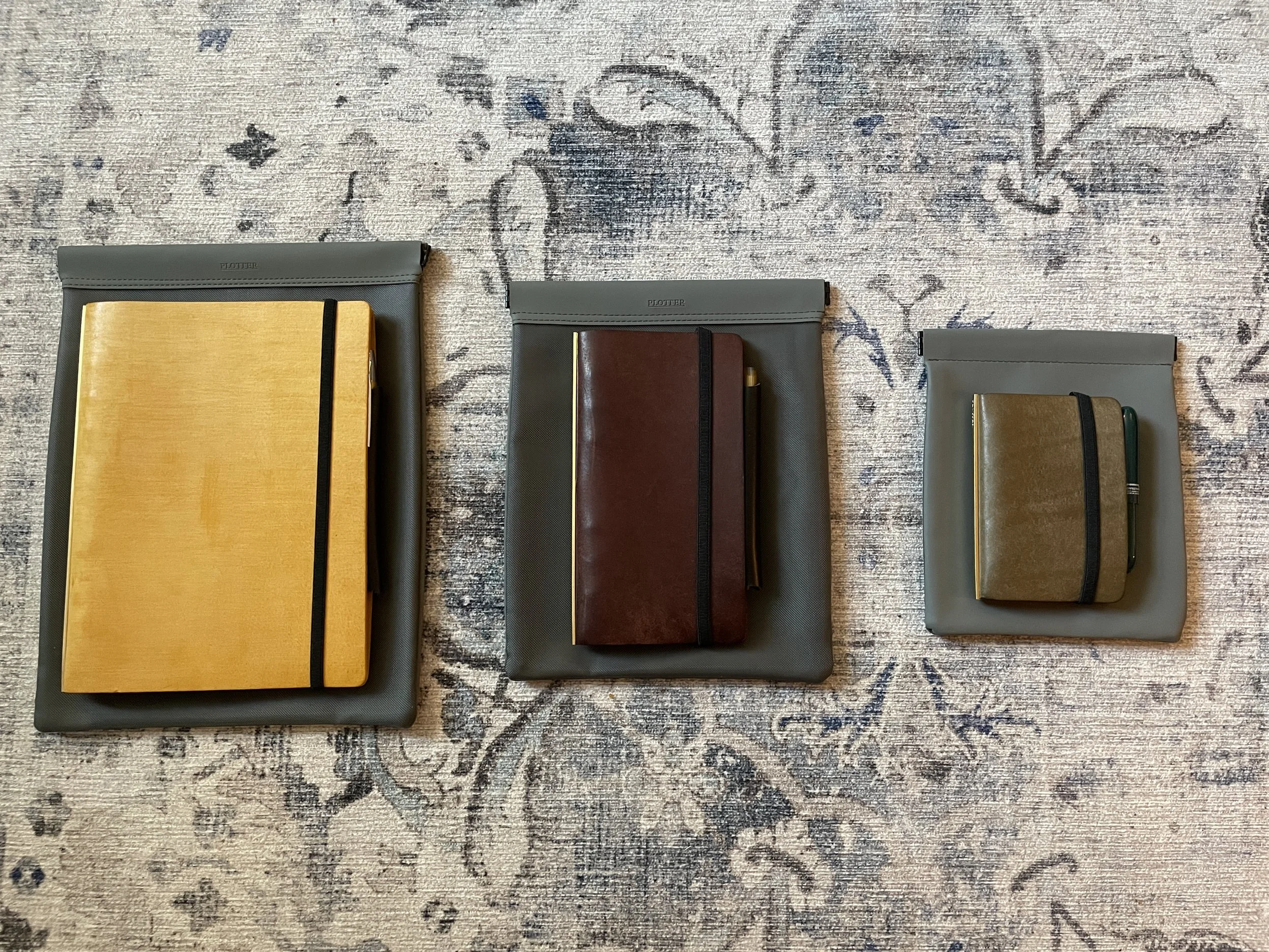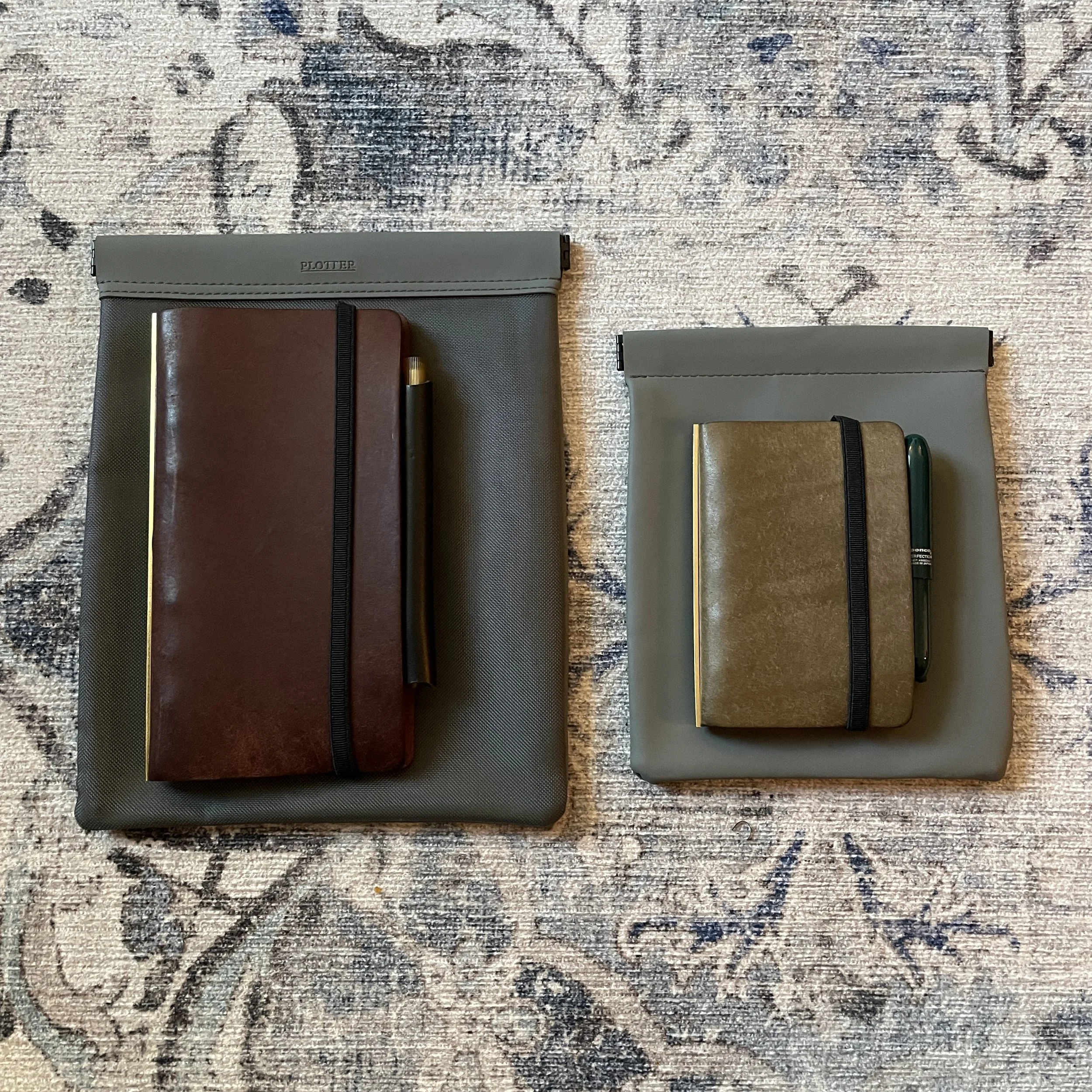 My Plotter Narrow (in more worn/aged brown Pueblo), vs. my Mini-5 in grey Pueblo. The mesh bags seen behind them are one of the more intriguing Plotter accessories that I ordered after the show, and were delivered yesterday. The Narrow will remain my TGS business notebook for checklists, posting schedules, etc. The Mini-5 will serve as my wallet and pocket notebook.