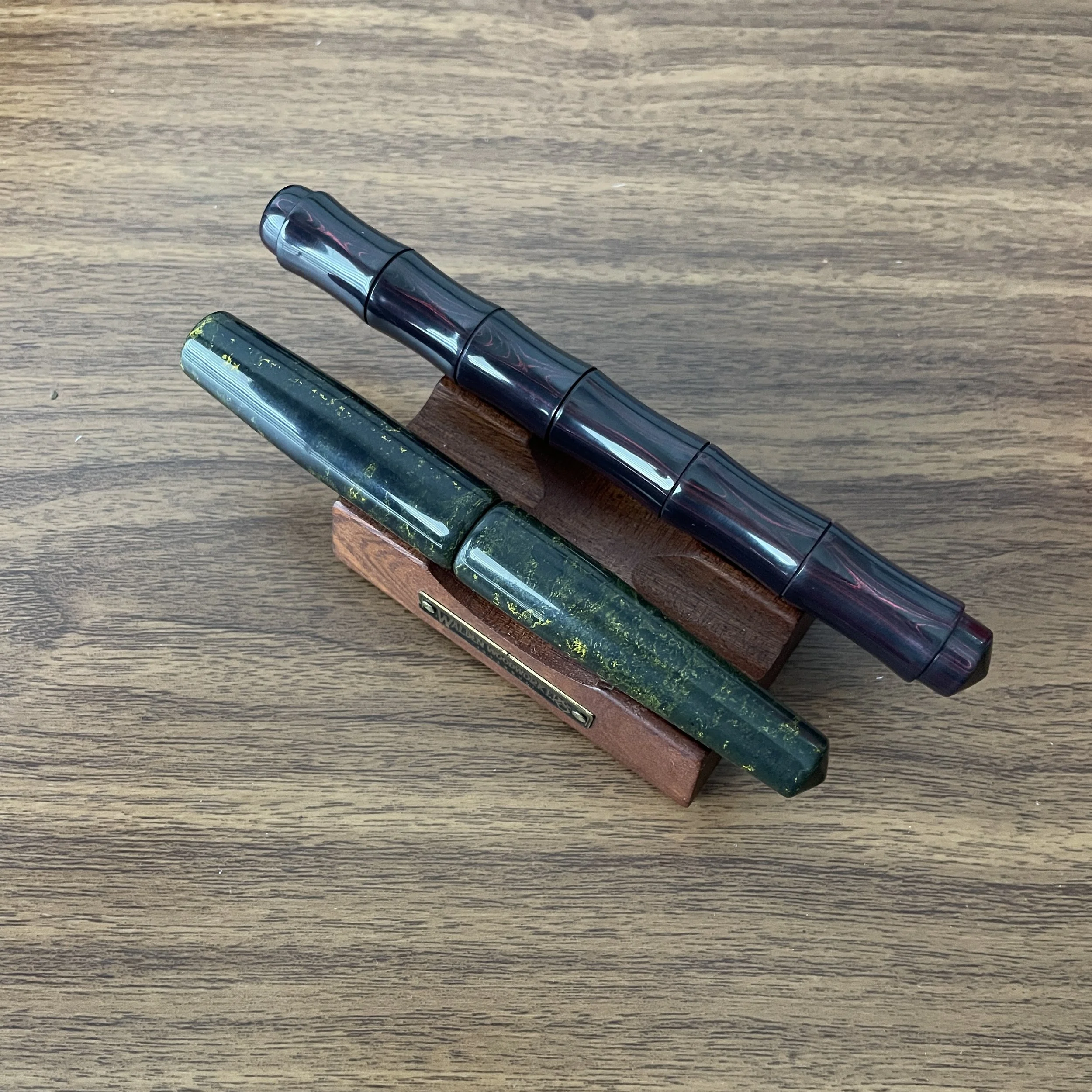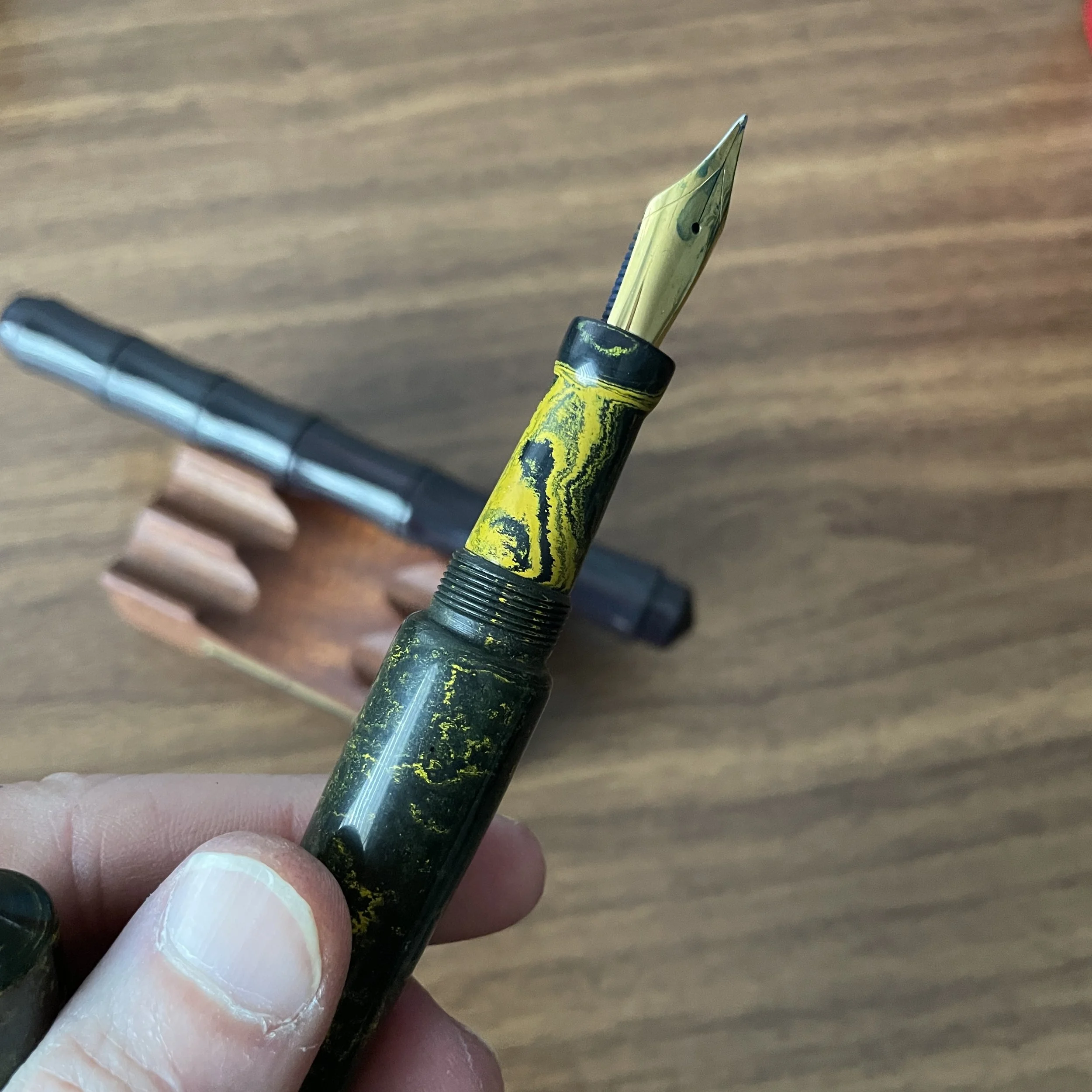 So, Joe, no pens? That was the plan, and I held out until Sunday, when I found myself eyeing Ranga premium ebonite pens over at the Peyton Street Pens table. Never having owned a Ranga pen, and loving ebonite in general, I acquired a dark red/black striated Bamboo model, as well as one of the Abhimanyu models in a green/yellow color. Ranga pens take No. 6 (and sometimes, No. 8) JoWo nibs, making them perfect platforms for nib customization.