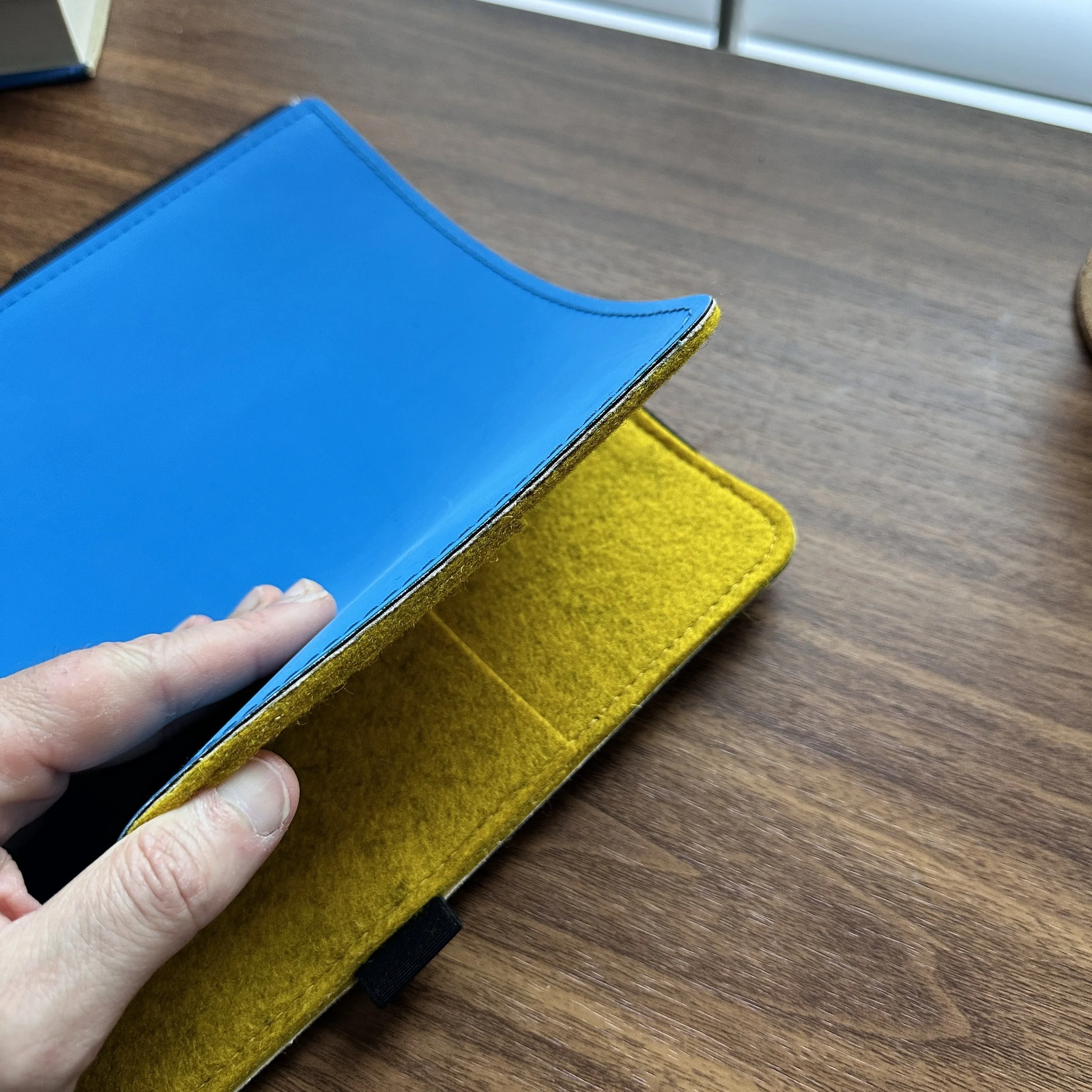 Roterfaden Taschenbegleiter Organizers. Featuring a versatile clip-based binder system that works with many different types of notebooks and paper refills, the Taschenbegleiter comes in many different materials and finishes, both leather and vegan-friendly rubber and vinyl. My personal favorite is the light grey recycled leather, which has the look of a leather cover with added stiffness for writing on the go. Check out this YouTube video to see how I have set up my personal Taschenbegleiters!