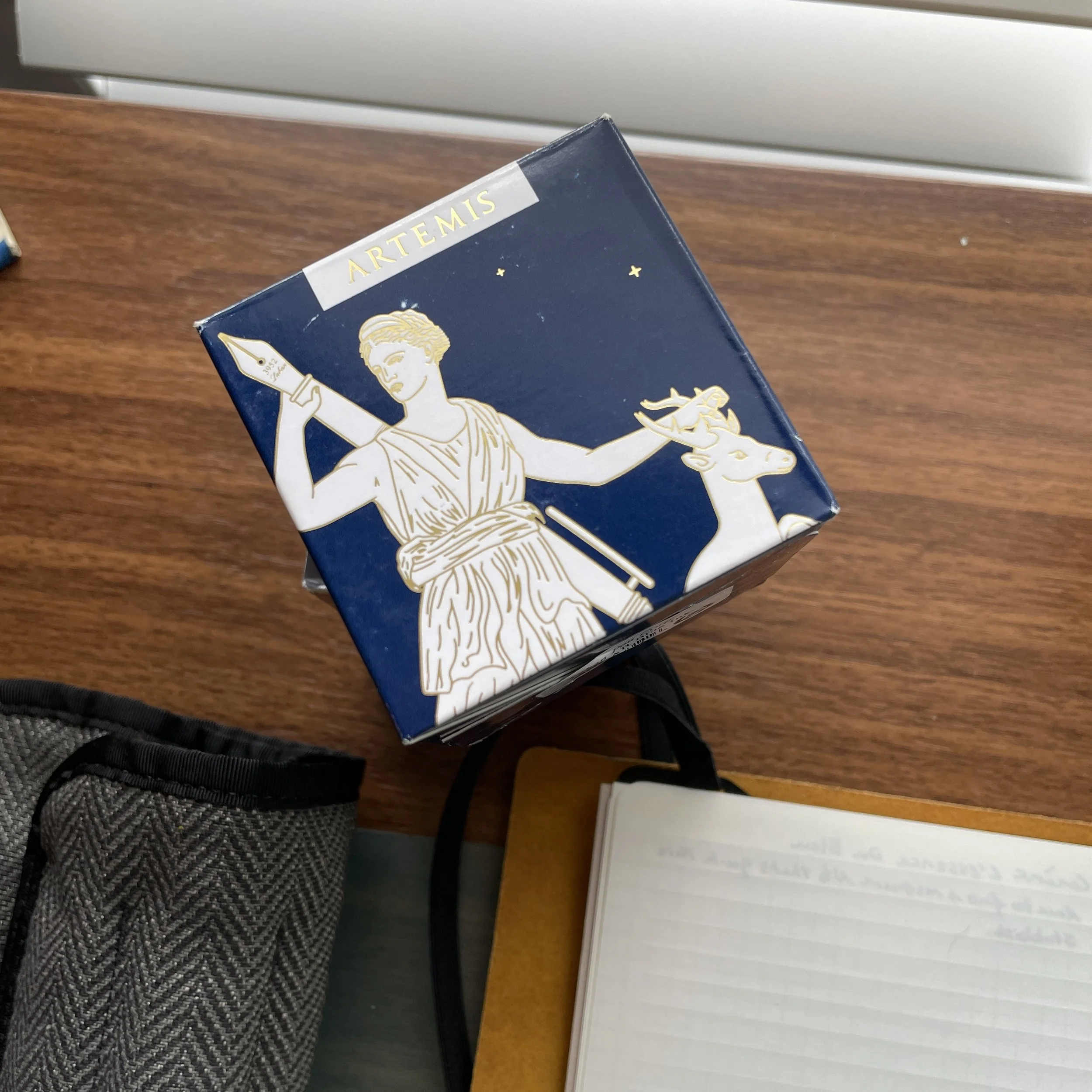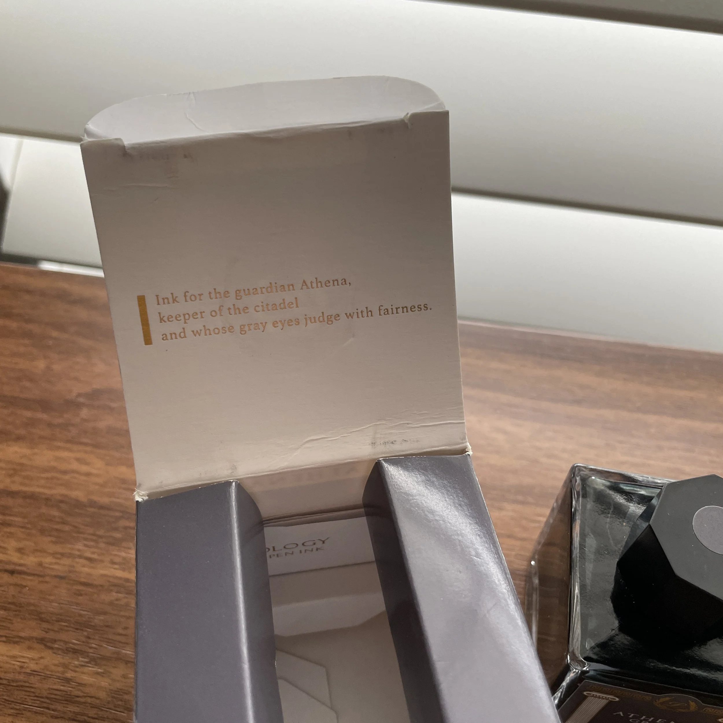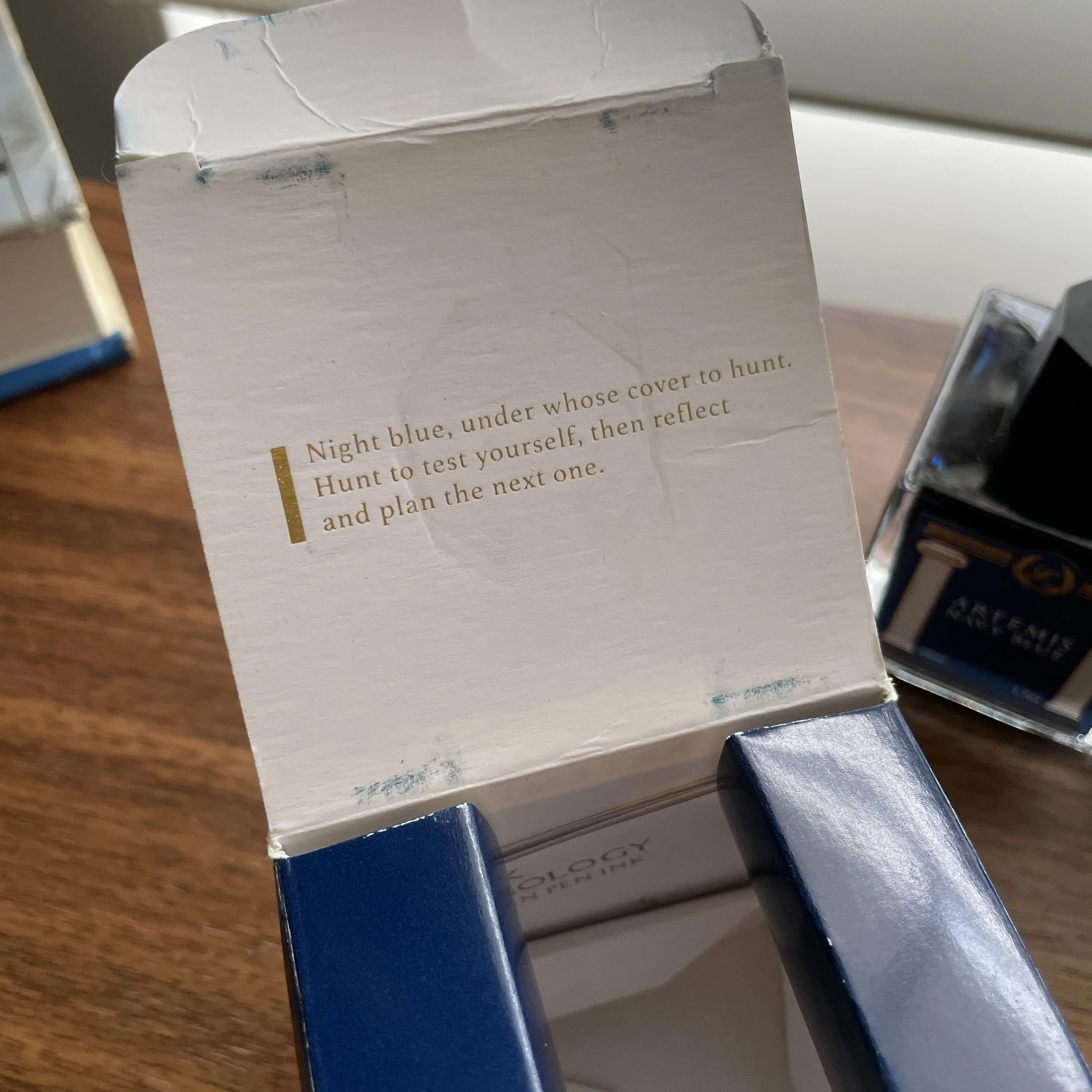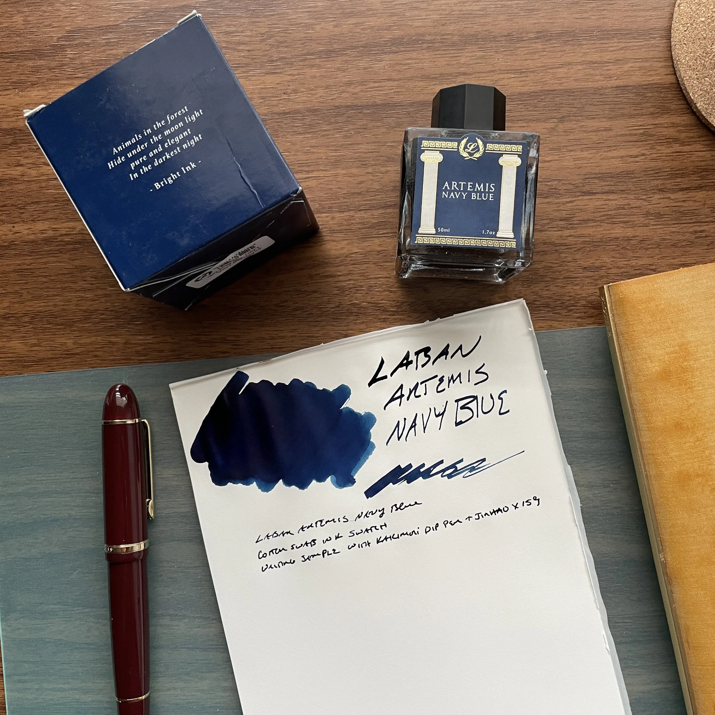 A true navy ink is surprisingly (and somewhat frustratingly) hard to find. Artemis Navy Blue is a dark, rich blue with a touch of sheen - think the now-discontinued JFK Navy Blue from Montblanc, only darker (I would say “richer”) and with less grey. Named after Artemis, the Greek goddess of animals and the hunt (Roman equivalent: Diana), the artwork features the classic motif of Artemis reaching for her bow and arrow, only to find that her bow is a fountain pen! (See the gallery below for the images from the packaging, which I find really well done.)
