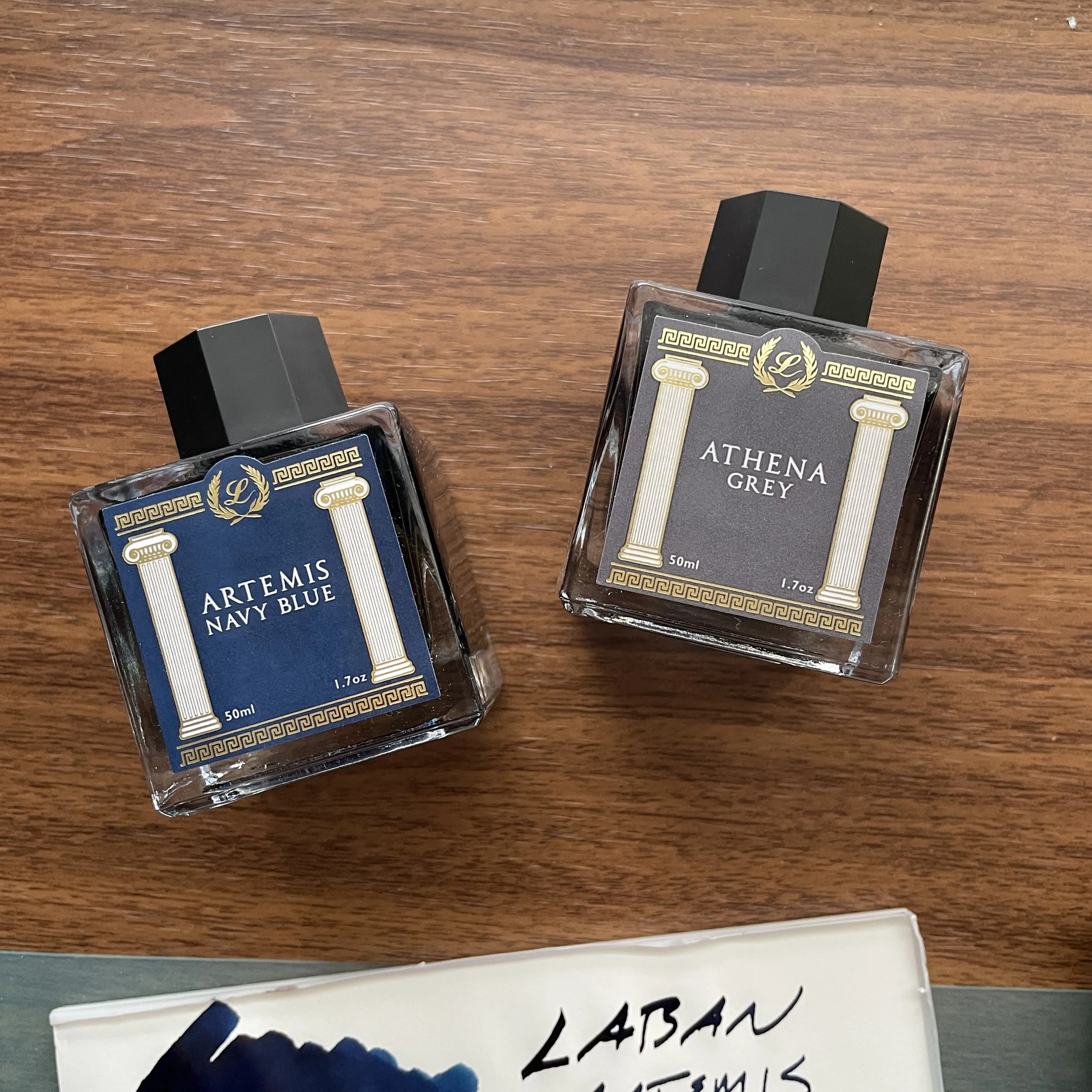 Because I have so many inks in my collection, it generally takes either an unusual color or an interesting story to prompt me to make a purchase. If I’m inspired to buy the entire line, the ink must be really special, and that’s where I found myself at last year’s Baltimore Pen Show, visiting multiple vendors trying to put together a full set of Laban’s Greek Mythology-inspired inks.