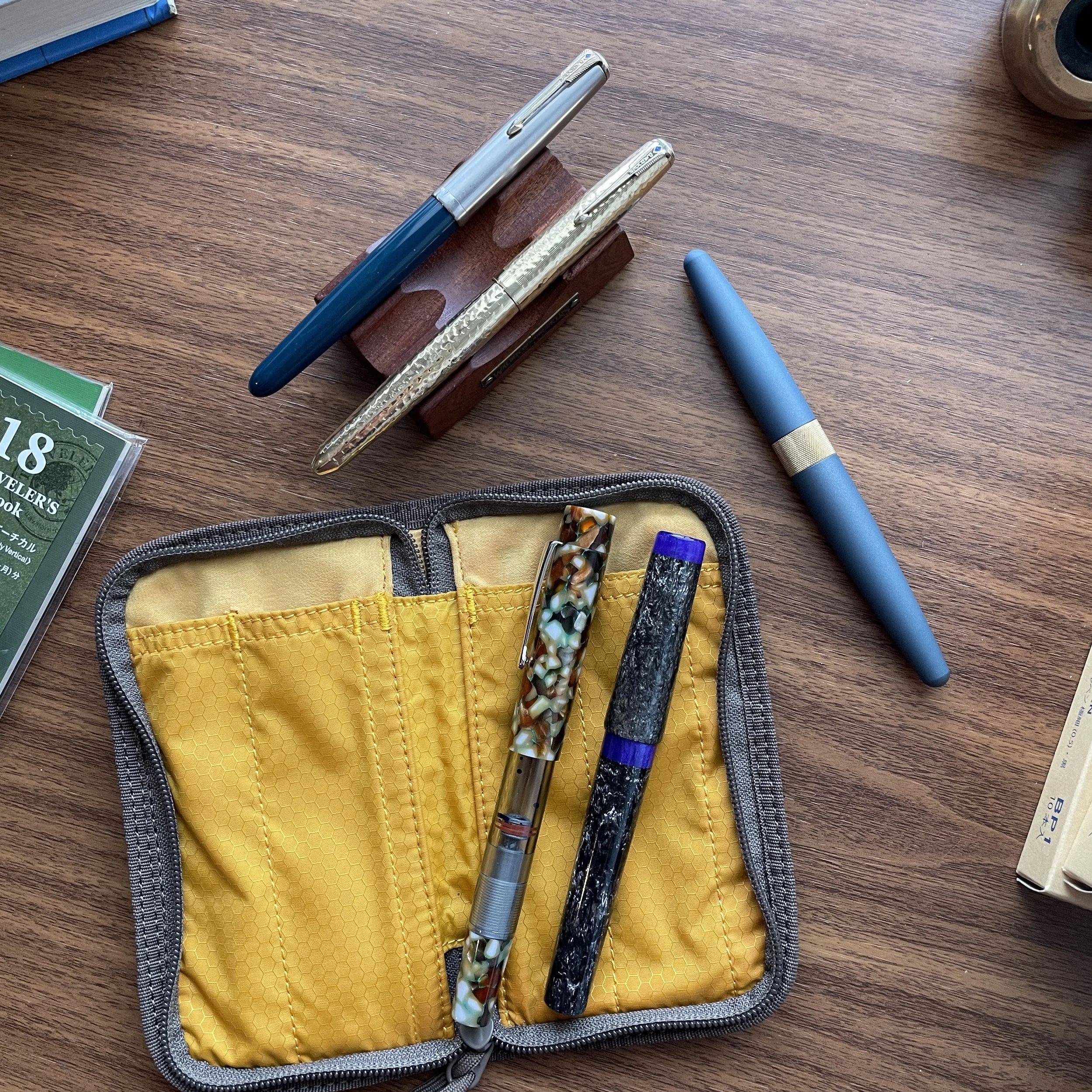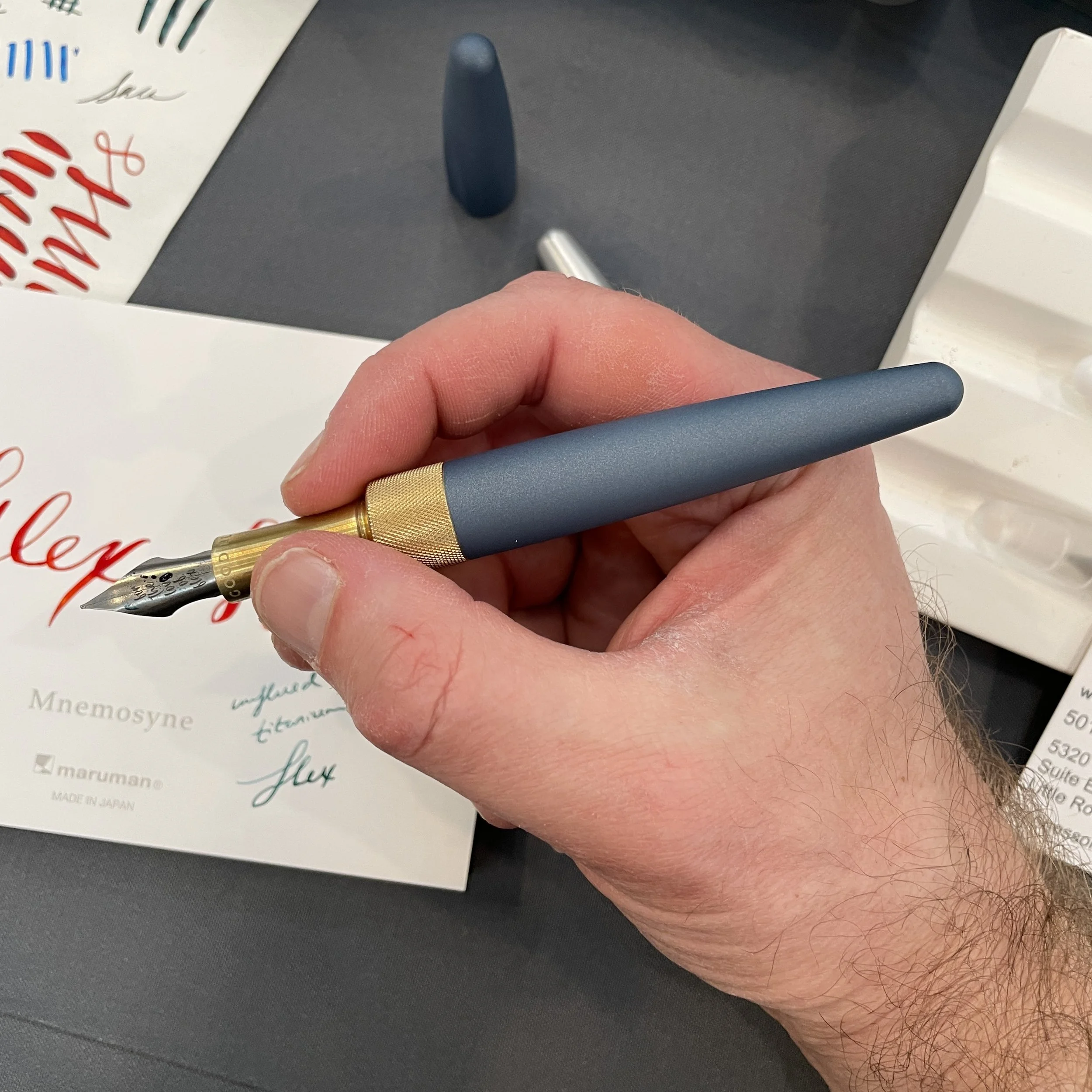 After not buying a single pen at the Baltimore Pen Show, I went pretty crazy in Little Rock. I scored one of the Vanness/The Good Blue exclusives in the “Titanium Blue” Cerakote finish, a “Tucker” model by Jason Neil Penworks, a Shawn Newton piston filler in a Conway Stewart acrylic whose name escapes me, and two Parker 51s from The Write Pen, including one with a customized “hammered gold” finish that might have been done by Ariel Kulloch (all I know is that it has an exceptionally good .9mm stub nib on it). I had Matthew Chen grind the other 51 to a semi-Naginata.