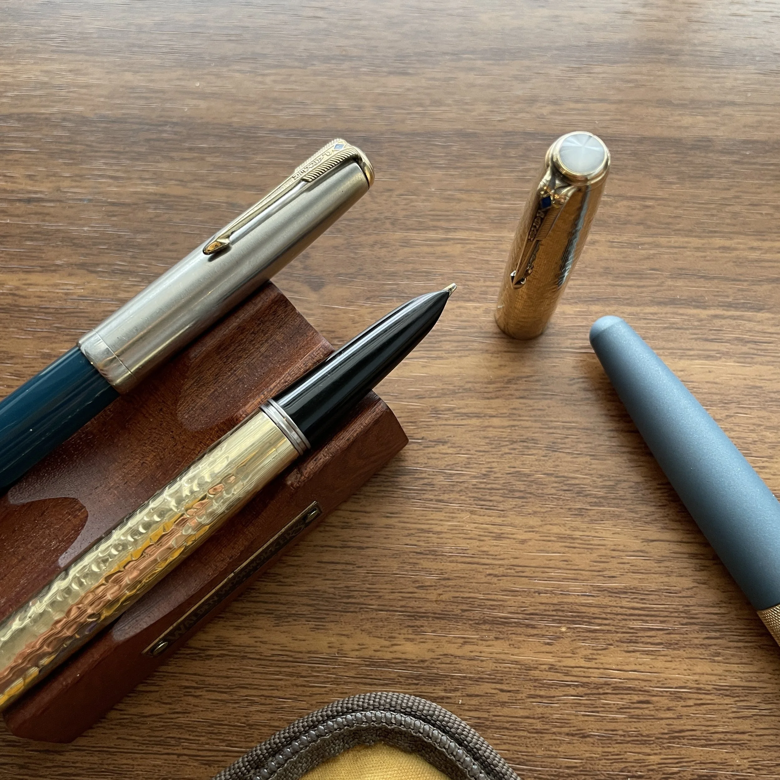 My Arkansas Pen Show finds, clockwise from to left: Parker 51 in Navy; Parker 51 with hammered gold fill, The Good Blue Vanness Pens Special Edition; a Tucker from Jason Neil Penworks, and a piston filler from Shawn Newton.