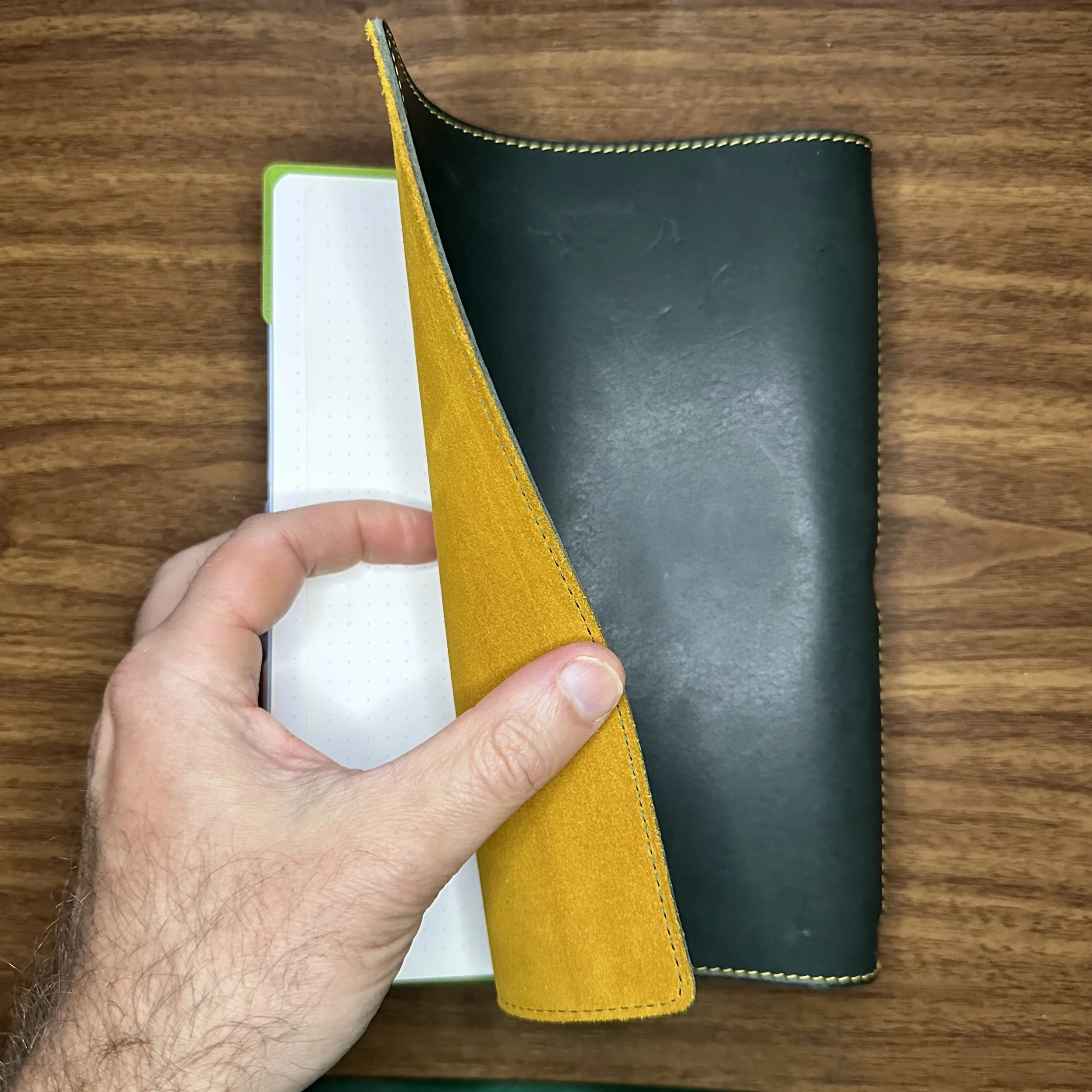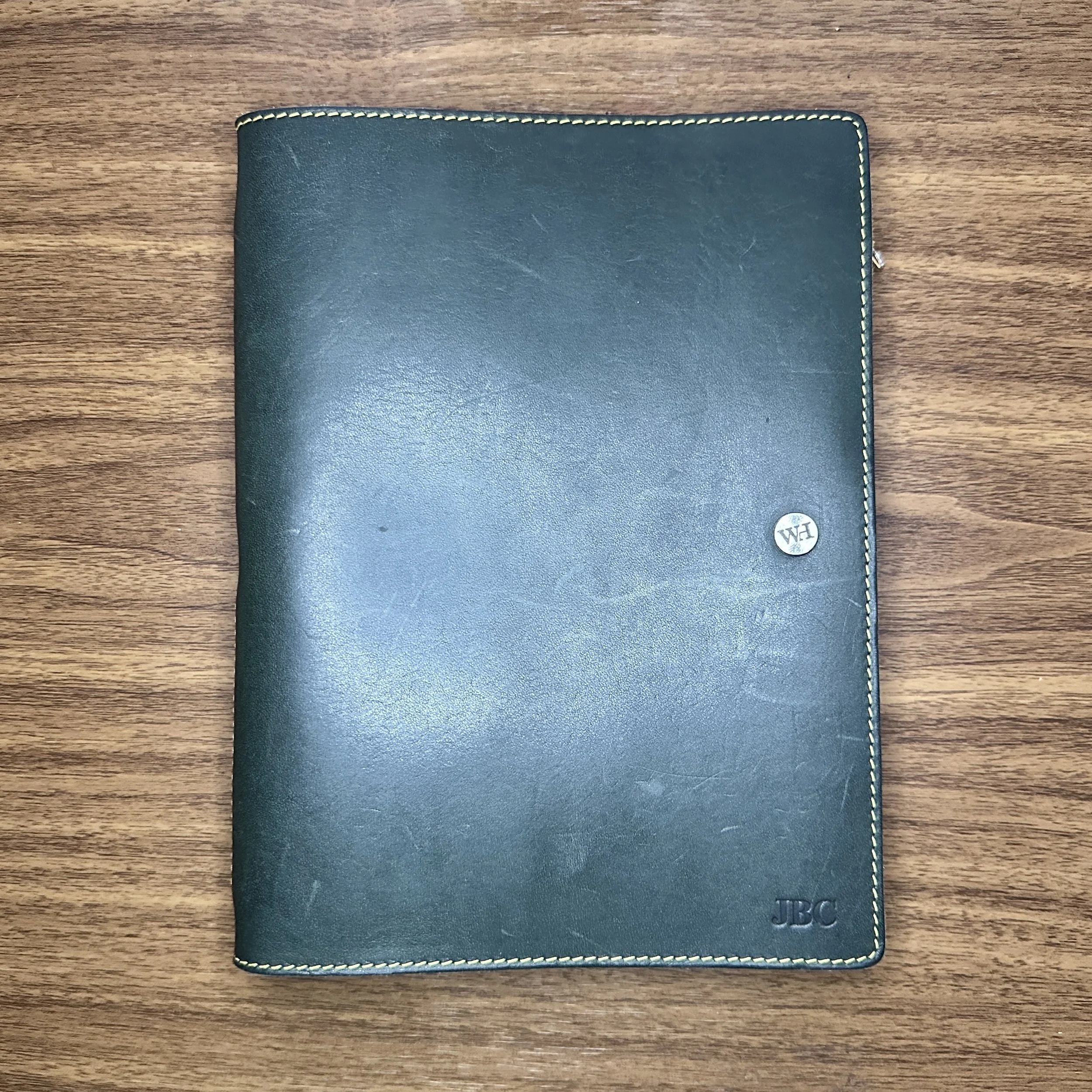 One major difference you’ll notice is that I’ve pared back the number of notebooks I carry with me to work. Not only did I find that I wasn’t using them during the workday, but I felt less enjoyment mixing work and play by bringing my personal journals, etc. to the office, which isn’t really a “happy place” for me. I have a dedicated “work planner,” which is my William Hannah A5 in Agave/Mustard. While I plan to do a fuller write-up of this particular notebook system in the future, I generally love ring and disc-based planners/notebooks, and this one is mostly compatible with the Levenger Circa and Filofax refillable systems I use to archive work papers.