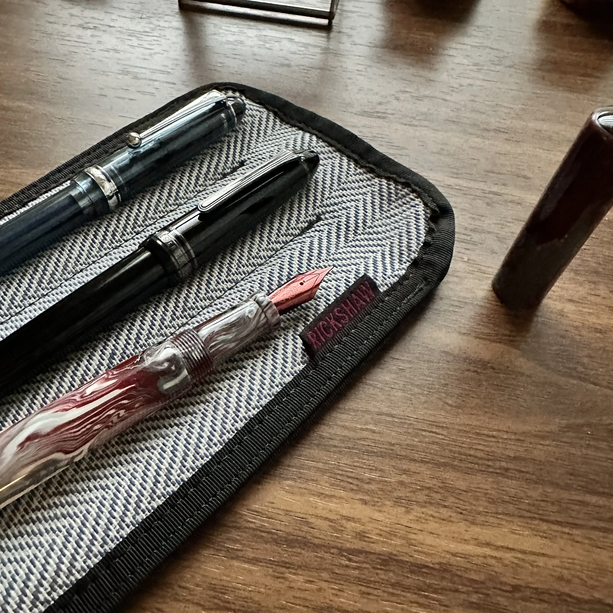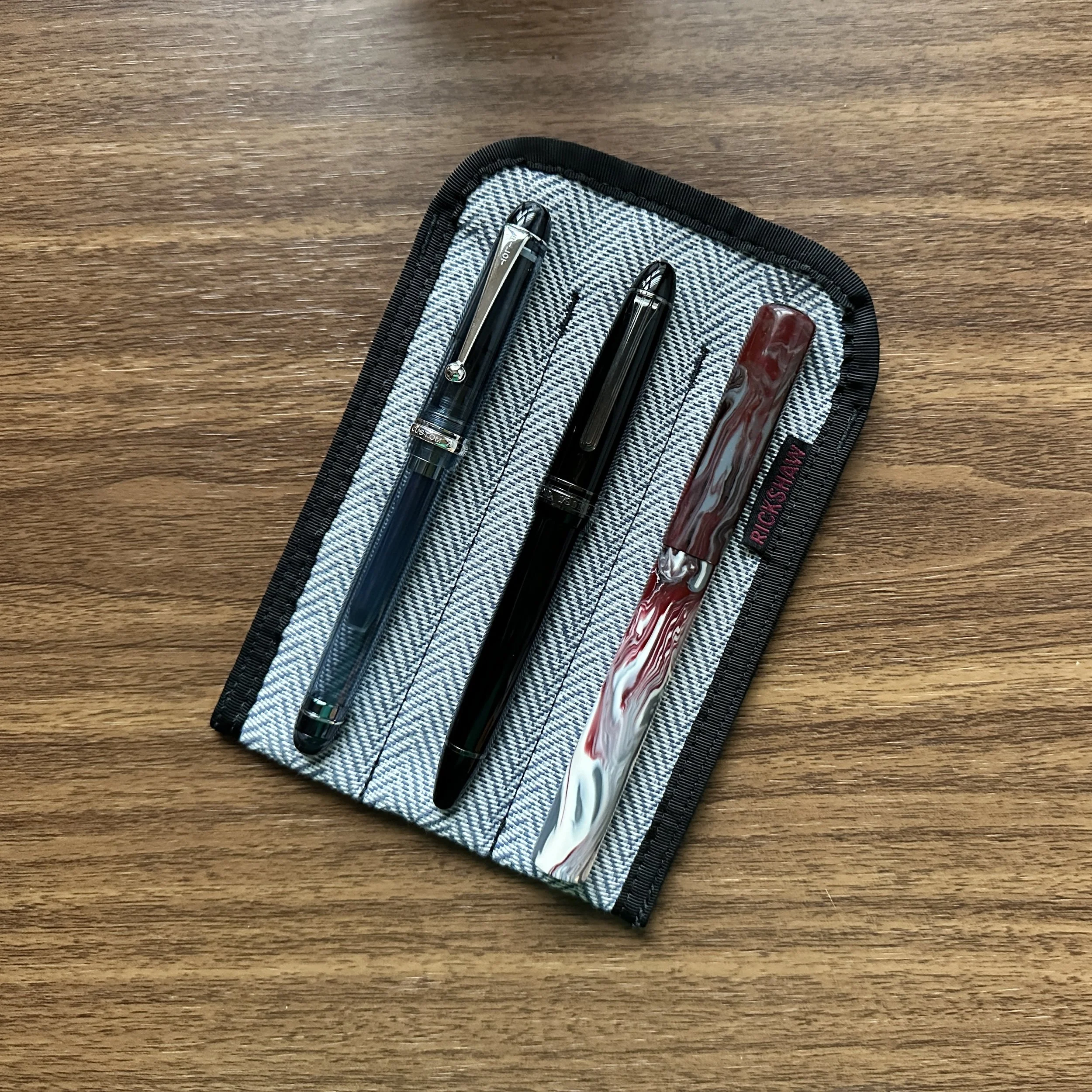 My fountain pen carry from yesterday, from left: Pilot Custom 74 in Blue Stone, Sailor 1911 Large Black Luster, and my personal T.G.S. x Hinze Elementar.