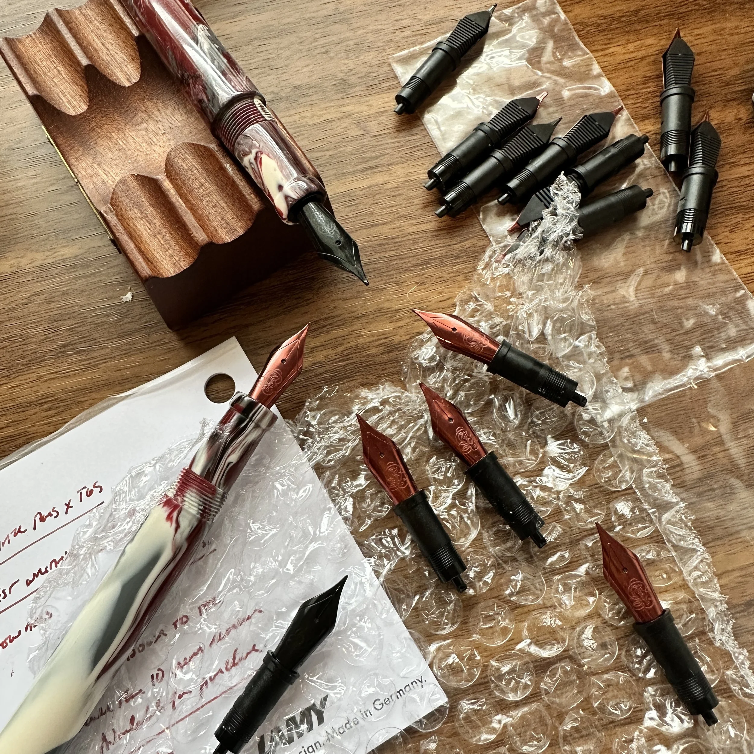 We’re down to the last handful of T.G.S. x Hinze Pens collaboration fountain pens, all of which are now available with the nano-ceramic plated Crimson nibs.